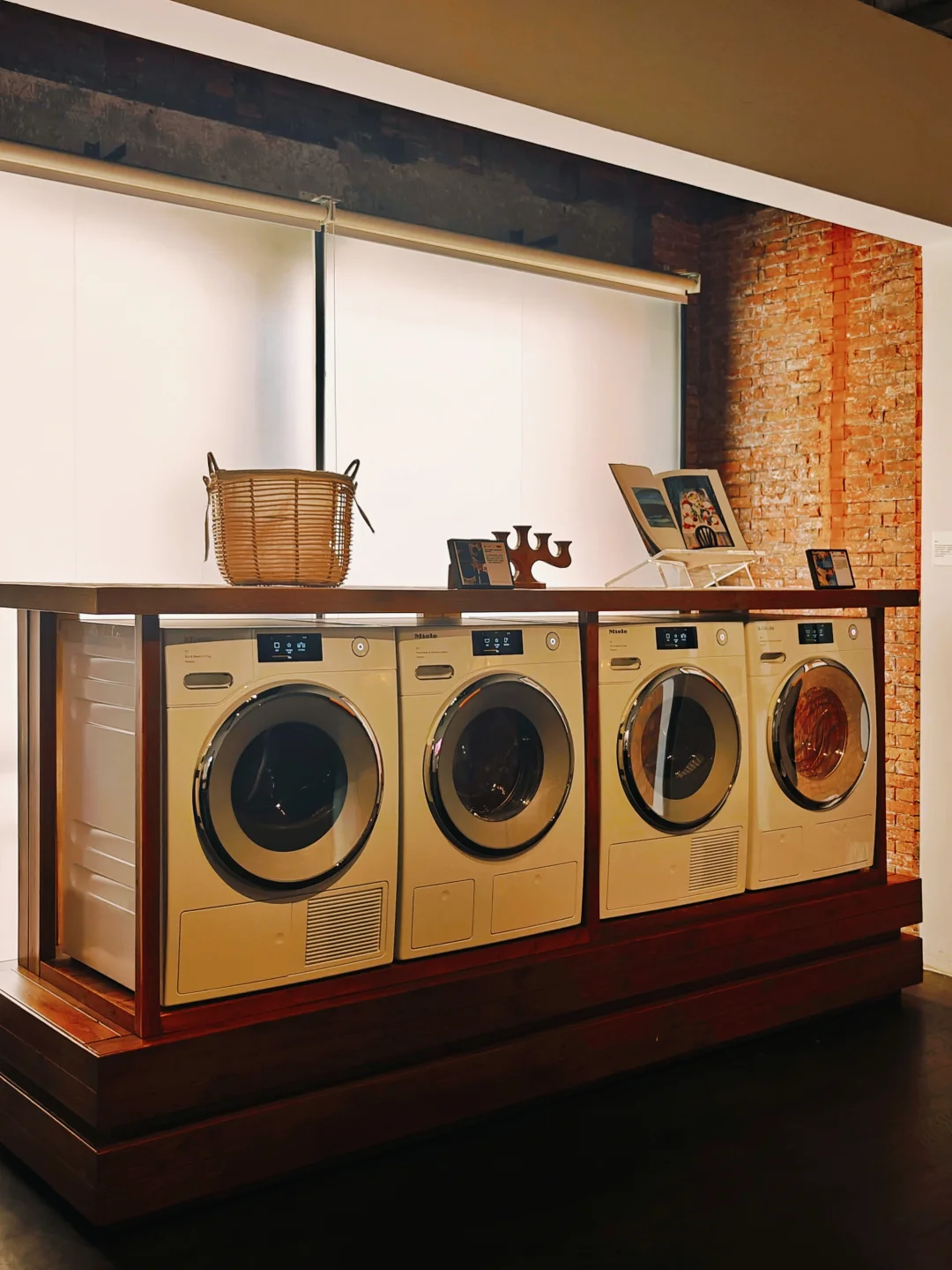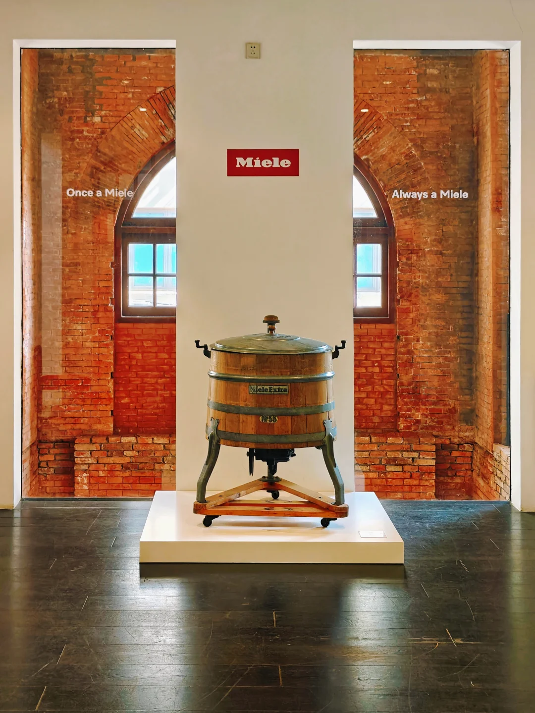 🚪走上3楼,映入眼帘是一只大木桶,原来这是Miele在上世纪五六十年代生产的蕞后一款木桶洗衣机,古典与现代的交互以此展开叙事
