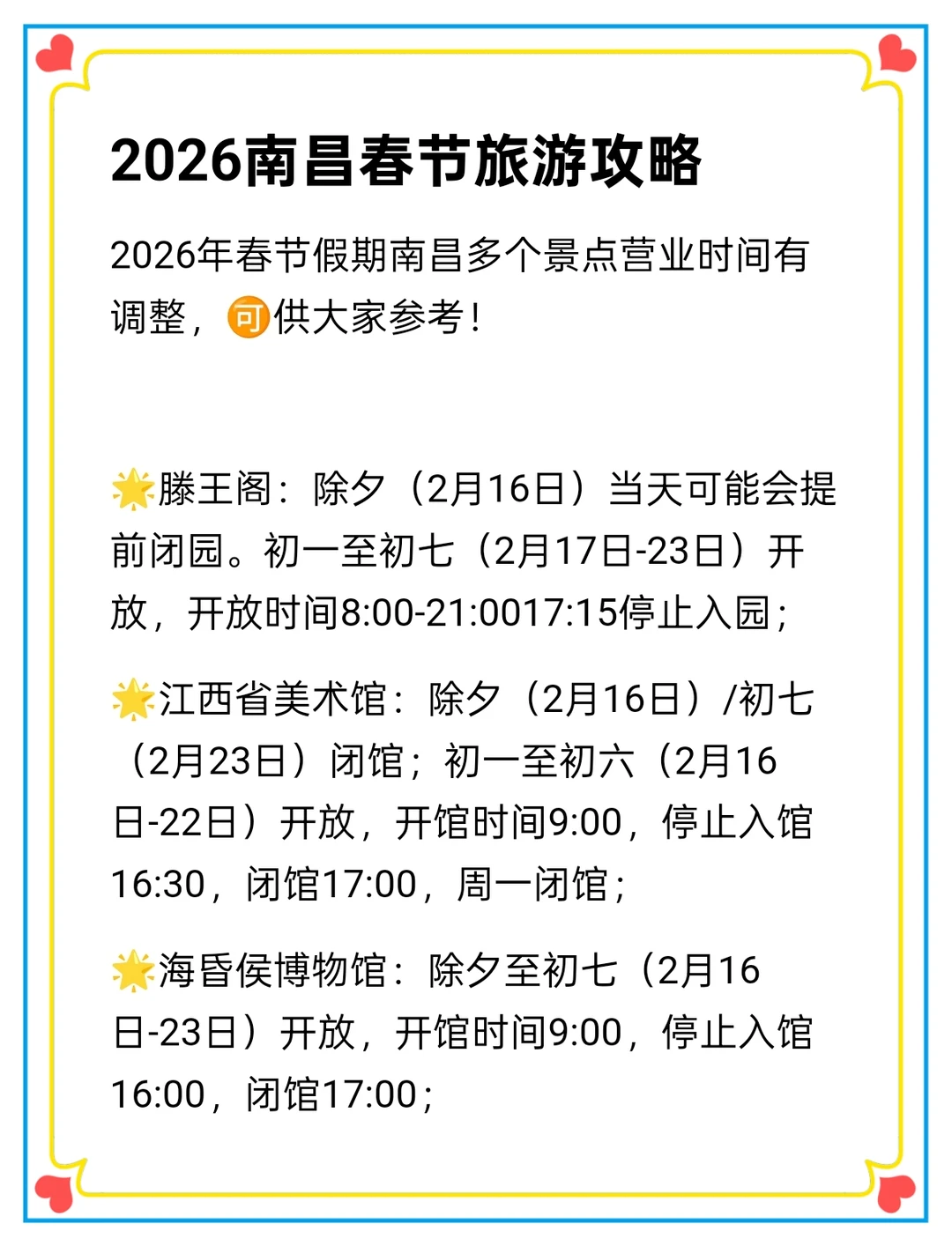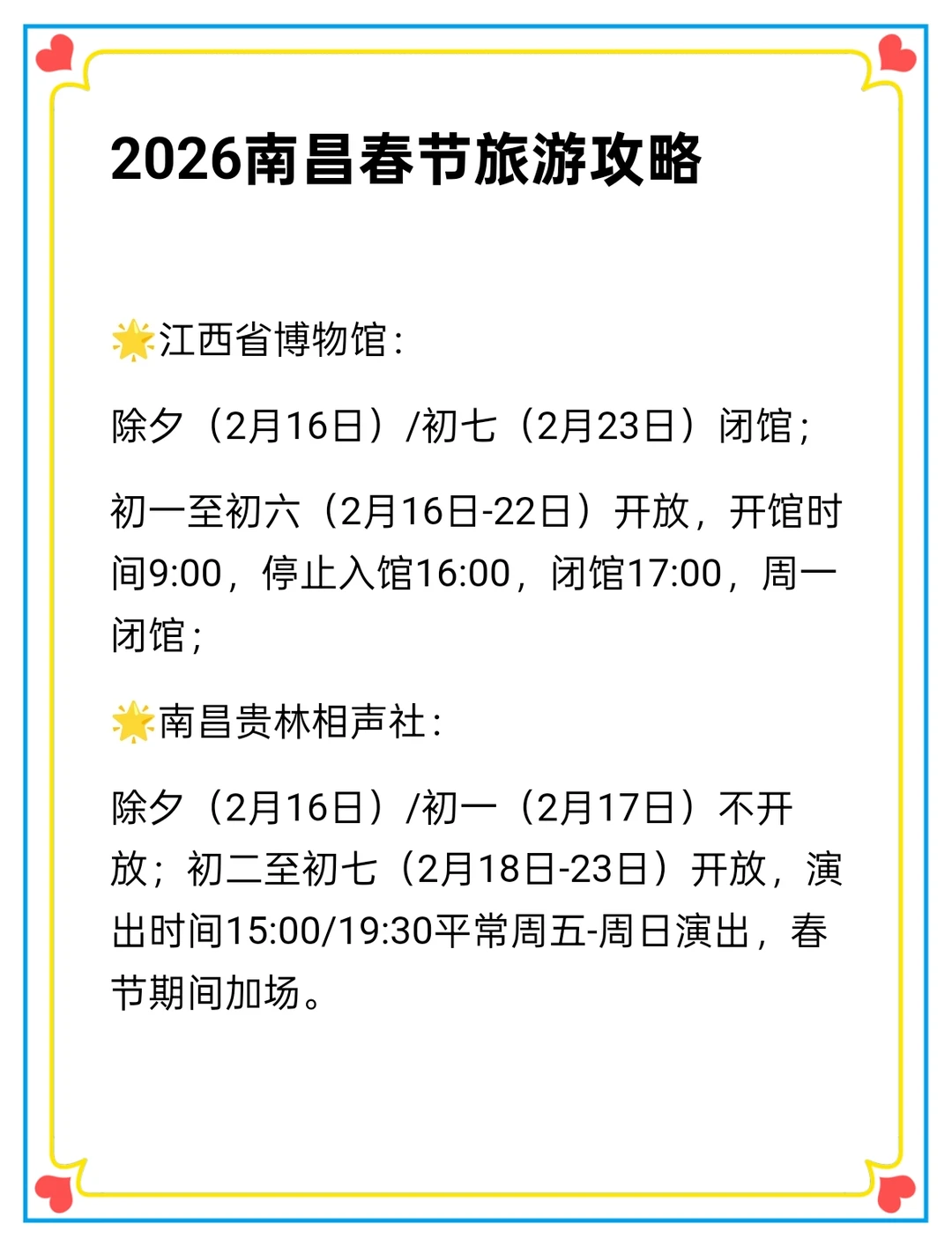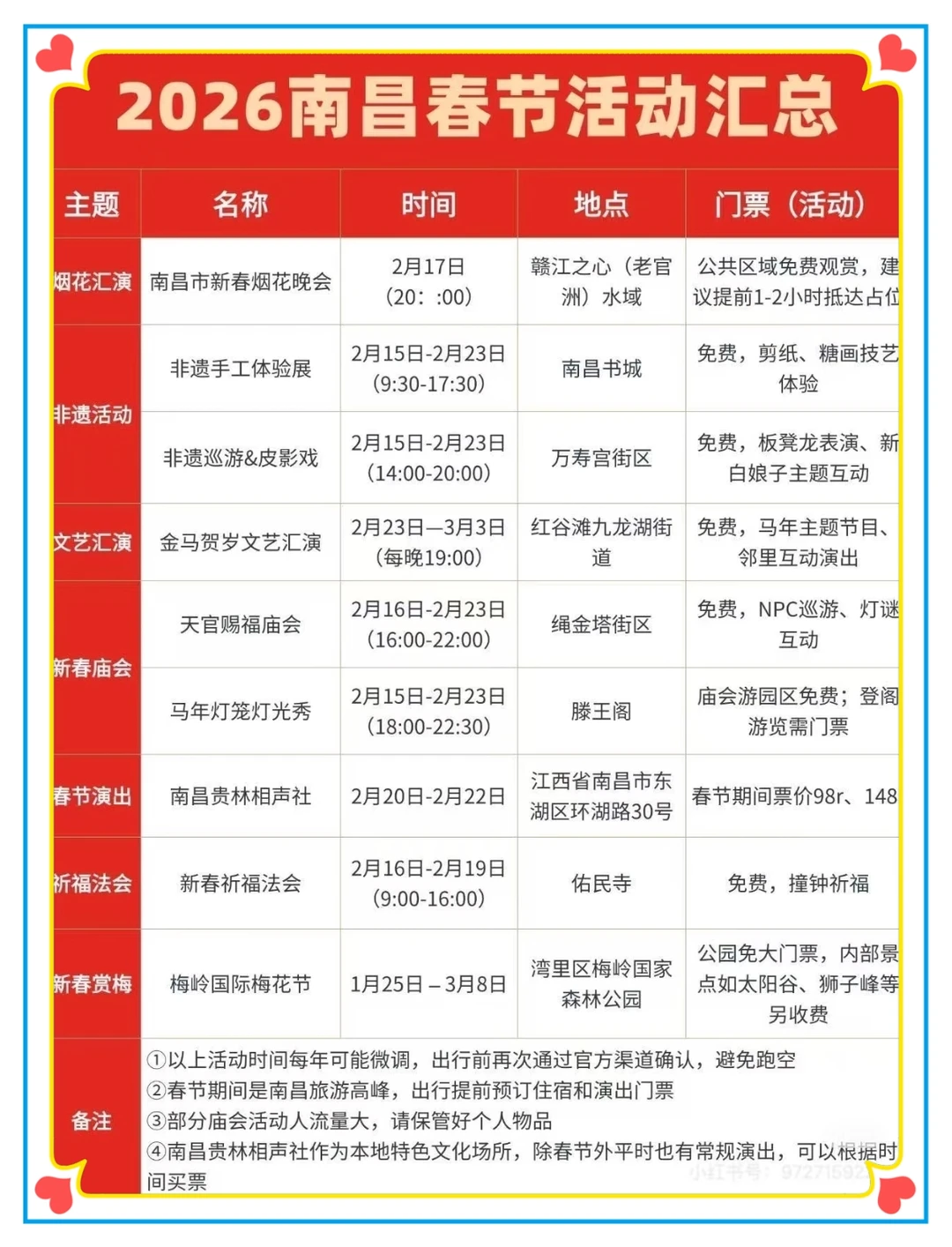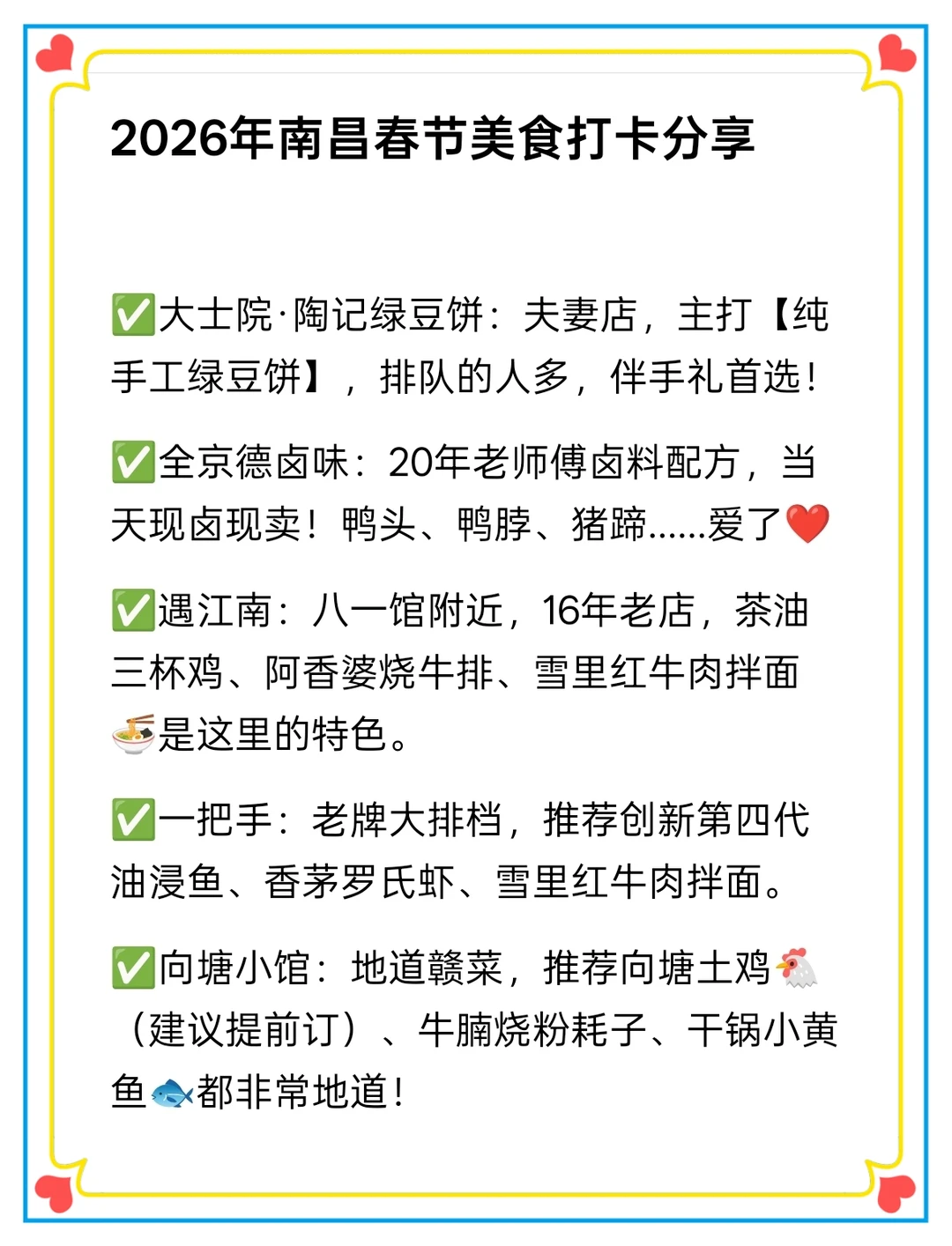 春节🏮来南昌❗跟着本地人吃喝玩乐一条龙🐉,不踩雷!!!希望以下整理的攻略能对你们有所帮助!😁 春节的南昌烟花🎇晚会和灯会🏮值得一看,非遗展演和花市逛起来也比较轻松,适合全家出动!🧨 🌟2026年新春活动: 💞大型烟花🎆晚会 2月17日(农历大年初一)晚8:00‌ 💞赣鄱有年大型灯🏮会 💞非遗民俗展演月 💞迎春花🌸市 2月8日至2月15日 九洲公园 景点看氛围,美食看清单,2026南昌春节,吃好玩好!💯 南昌 南昌美食南昌旅游攻略 南昌吃喝玩乐 南昌新年旅游南昌美食攻略 南昌美食推荐 春节出游 #2026春节去旅行
