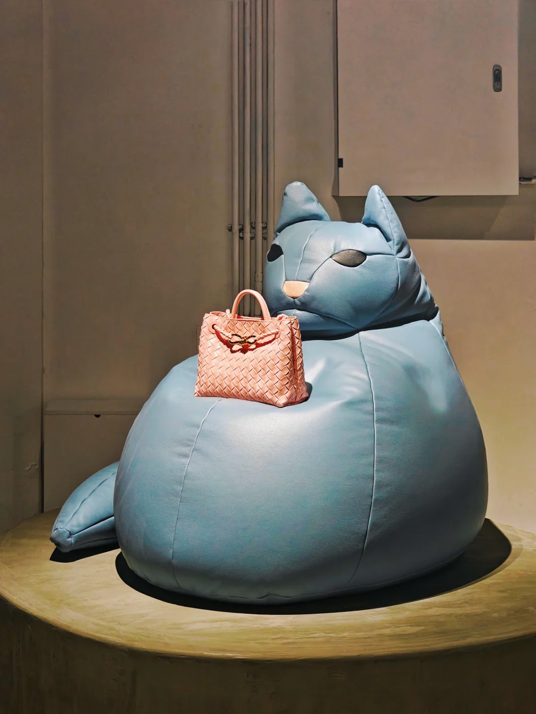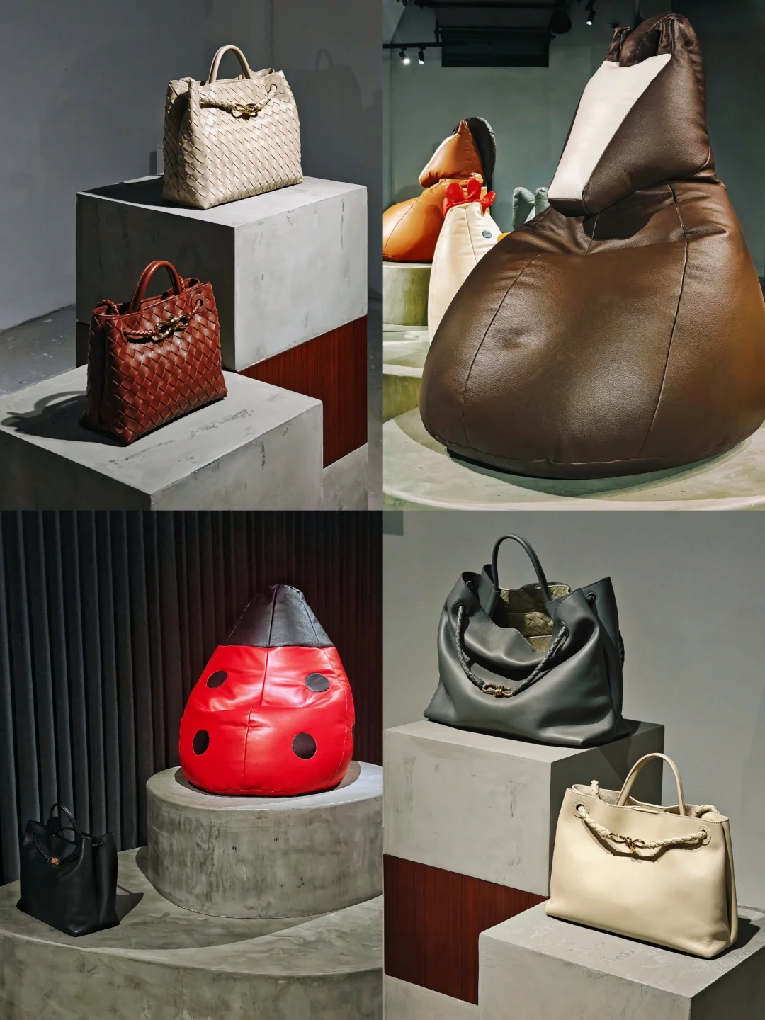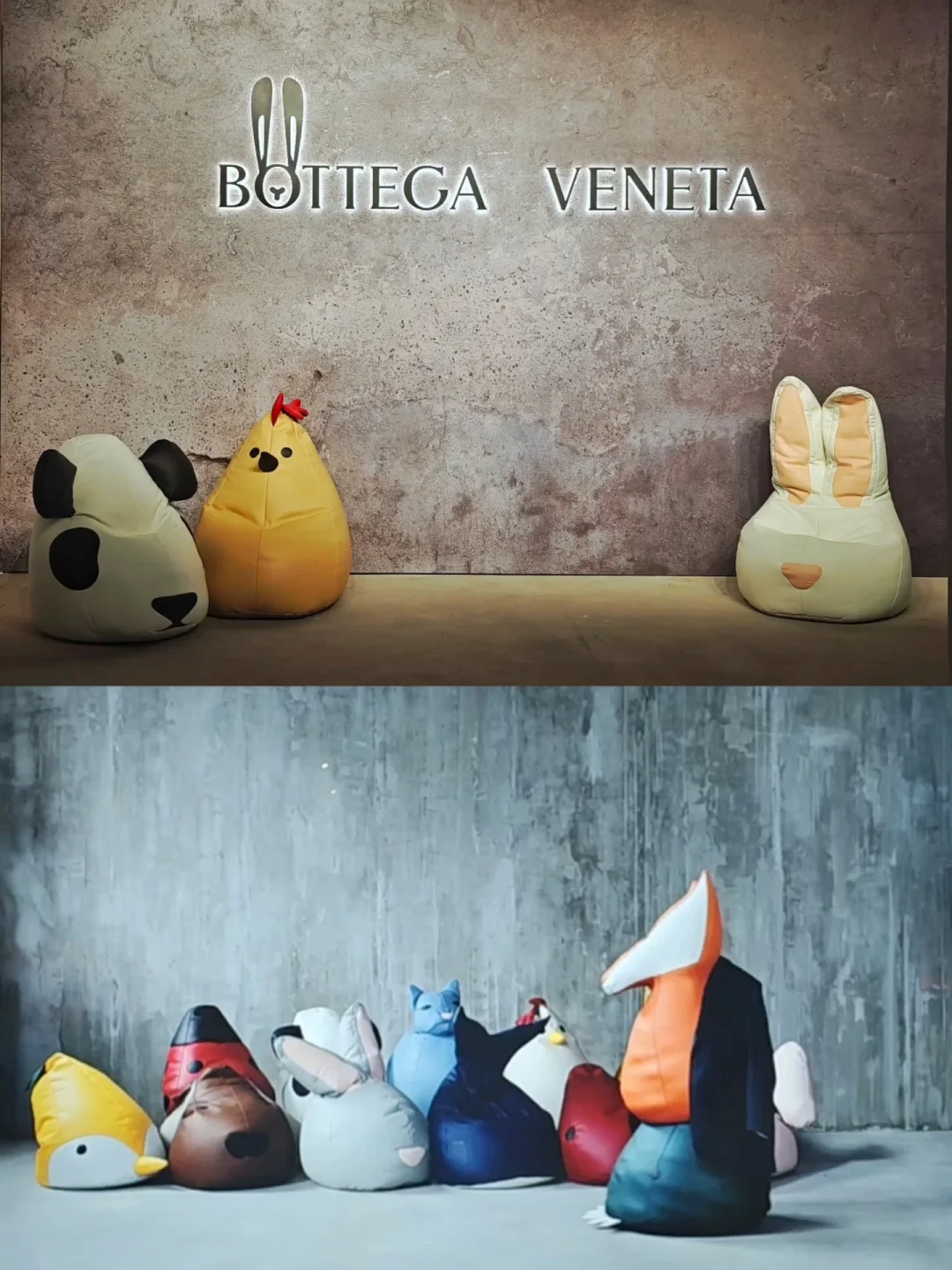 BV与意大利家具品牌Zanotta合作推出的限量系列,融合了本季秀场设计灵感“童年”。以其经典标志性“Sacco”豆袋沙发为灵感,设计出15种动物造型(如🐞🐴🐰🐼等)。沙发采用品牌标志性皮革工艺,配色包括BV绿、黑、红等,单价7,500至10,000美元。(现场工作人员介绍说大部分现场的已经预定出去,看来今年奢侈品消费又行了?好像最近有数据说创新高了耶[doge])