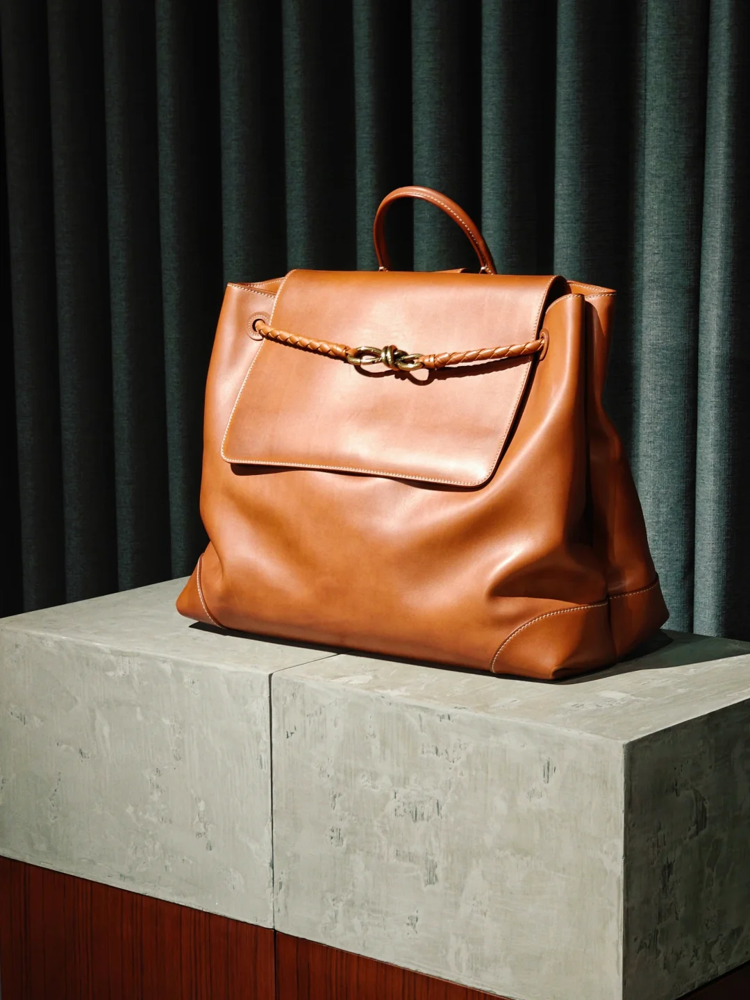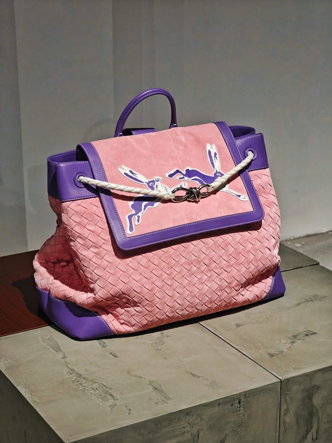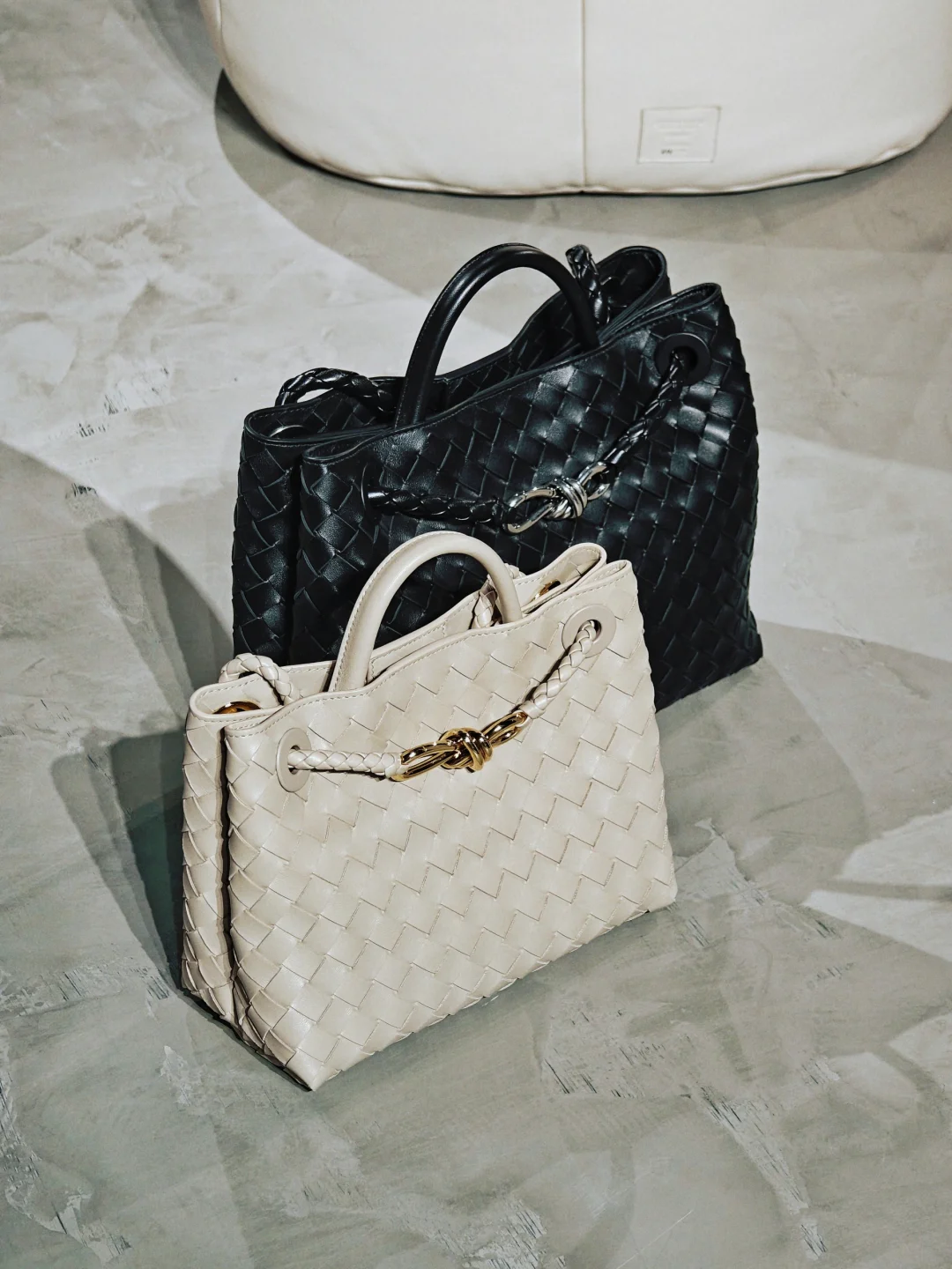 INTRECCIATO编织工艺,标志性绳结元素,致敬品牌经典。顶部提手设计搭配隐藏式撞色夹层;把手袋的内外设计对调,包面变成丝滑的牛皮材质,而内里设计成了编织元素。亦可见到包袋上本季主题动物元素的运用。