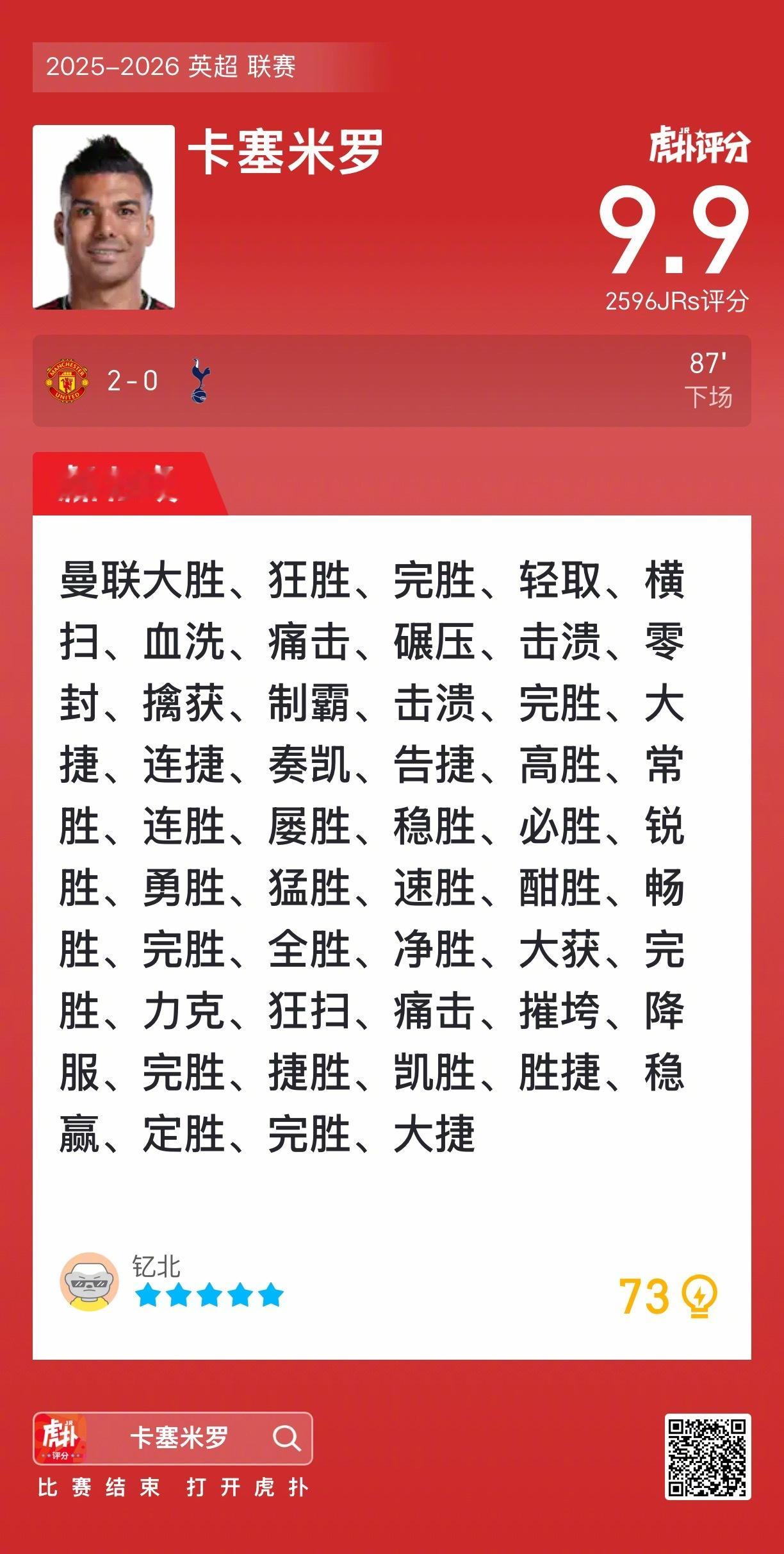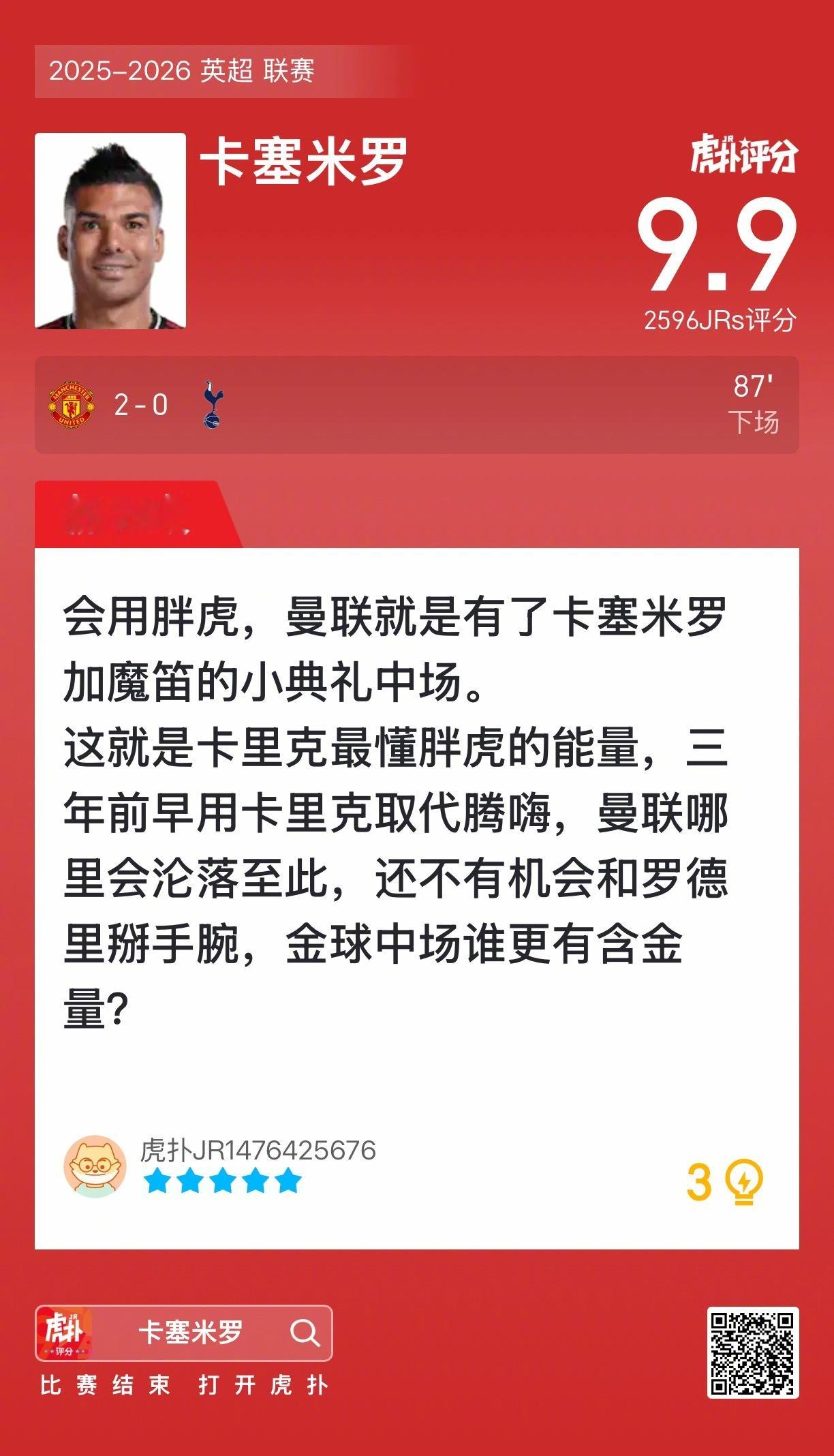 曼联2比0热刺卡塞米罗赛后收获9.9的虎扑评分!