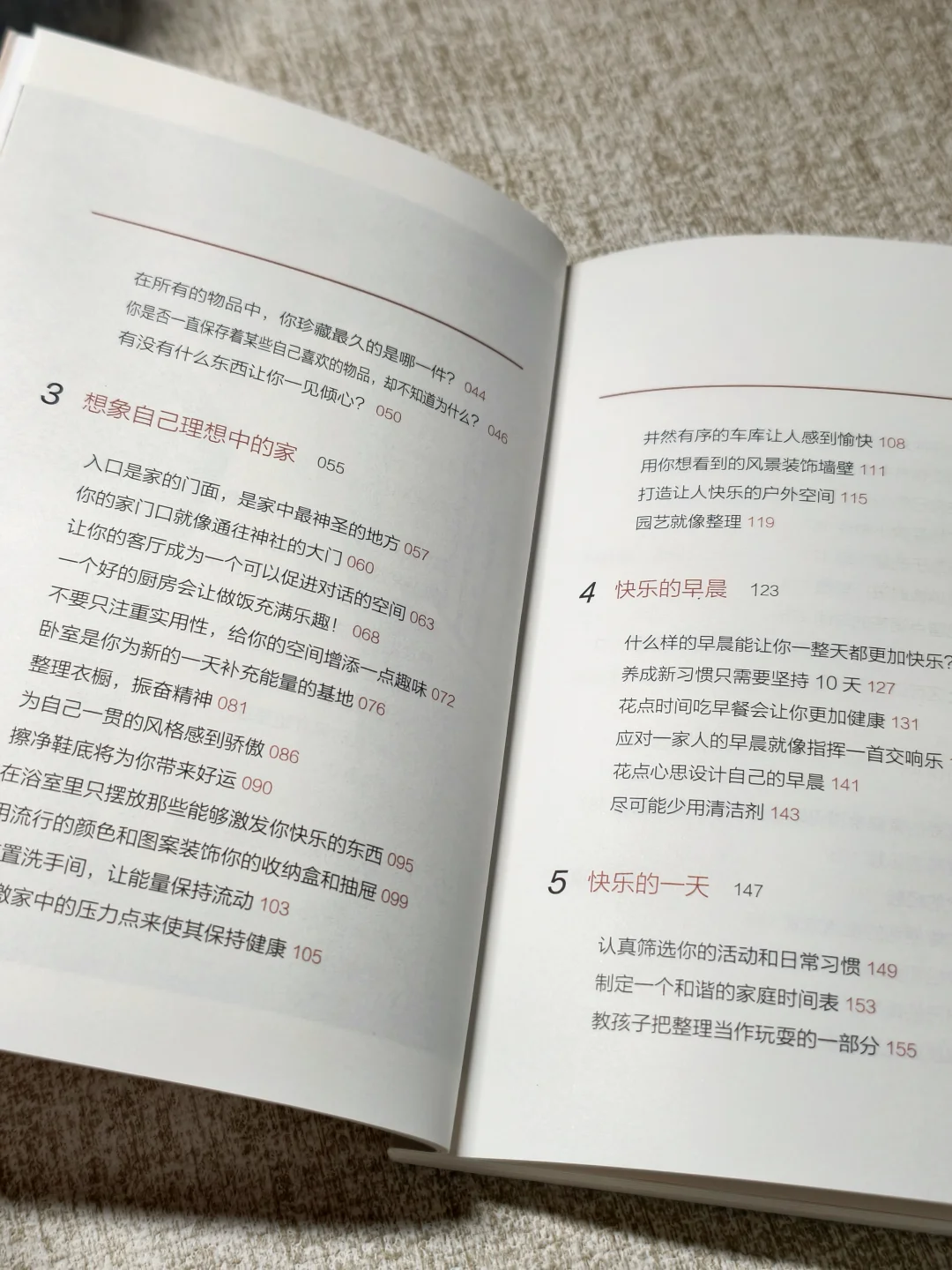 书中不仅提供了可操作的居家整理术,更透过直面内心的提问,来梳理个人的心理状态。从室内空间规划,早晨、日间、晚间的时间及活动安排、食谱,到与家人的相处,作者分享给我们的不只是由外到内的人生整理术,更是一套生活哲学。