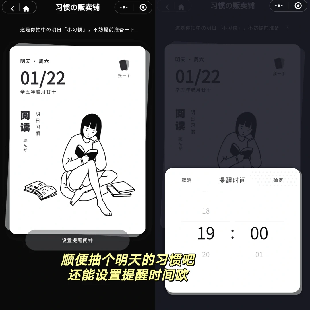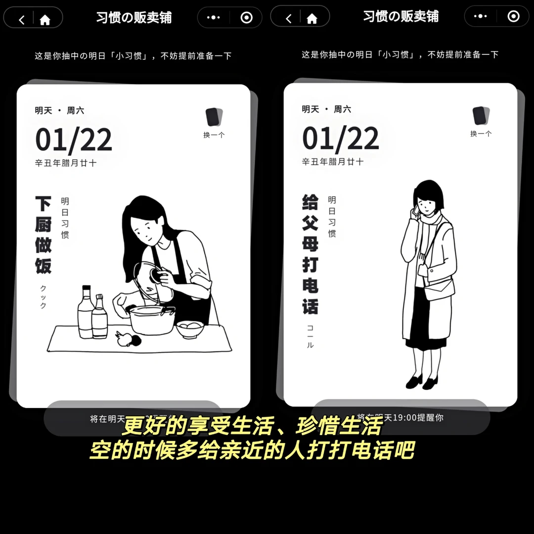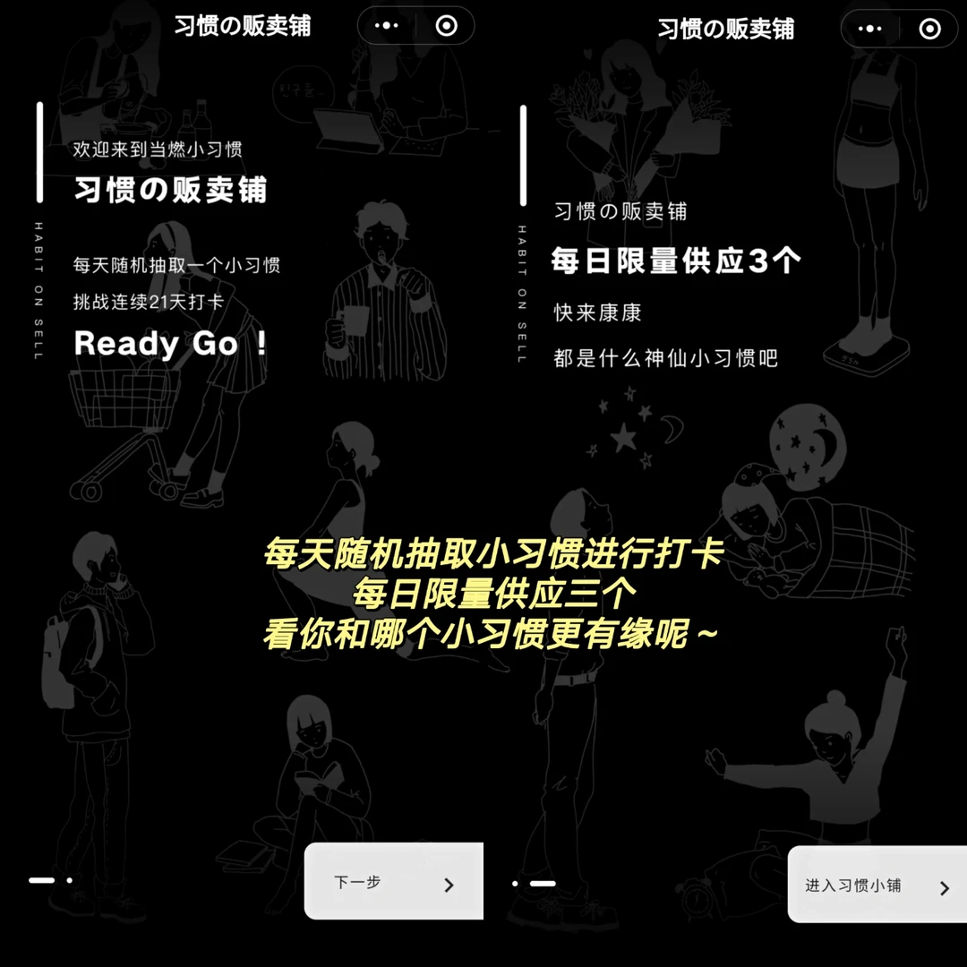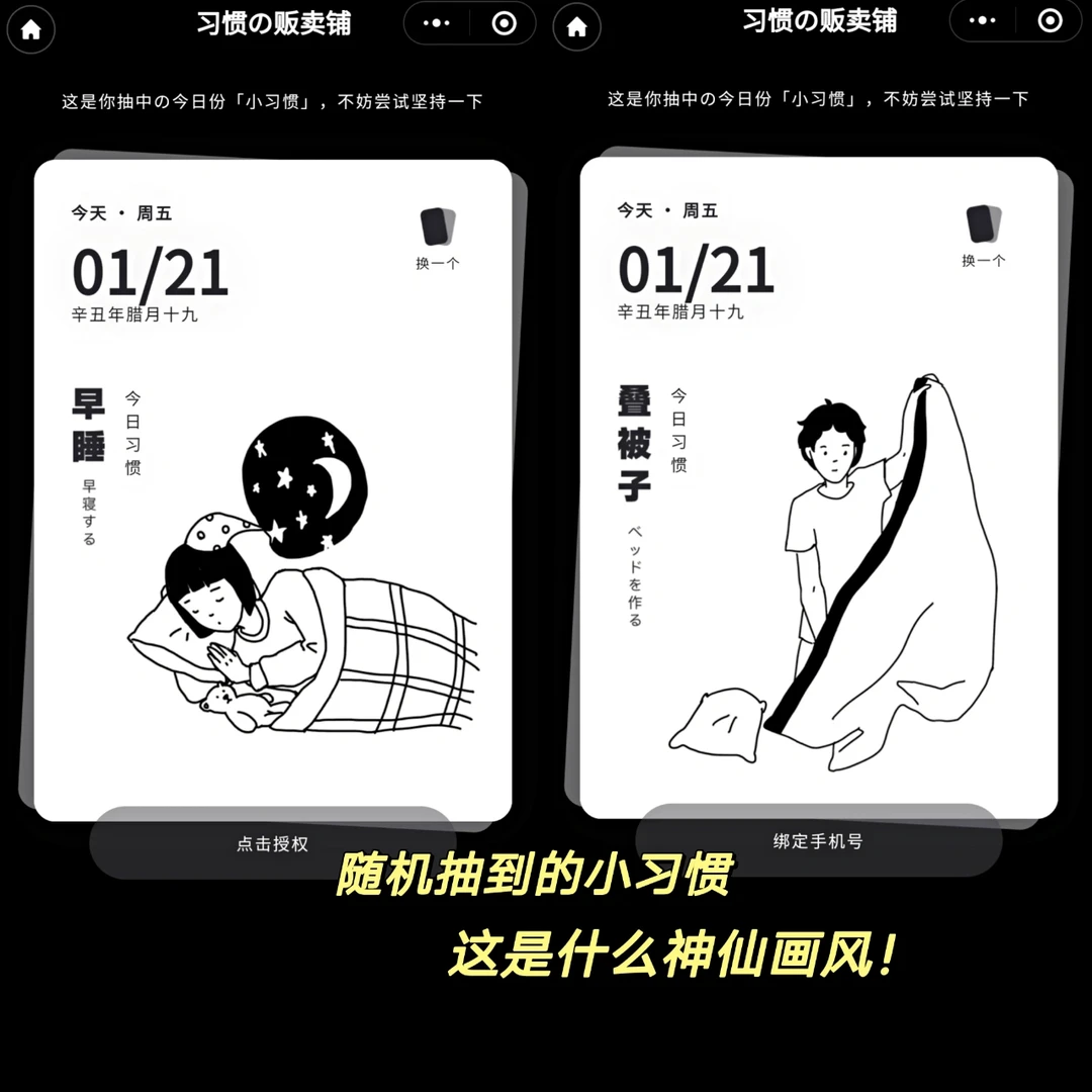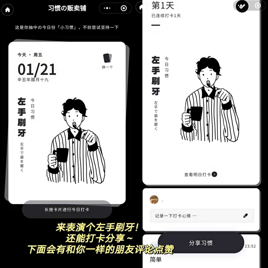 🖇️名字 : 习惯杂货铺 🖇️iOS&Android✅ . 一天打卡一个好习惯,让自律变得上瘾! . 🌸画风简洁明了 黑白极简画风 🌸每日随机抽一个习惯 养成打卡 🌸还能设置时间提醒(比如阅读习惯) 🌸打卡后可以留言写心得体会 下面还有uu们一起 . 真的无意中发现了 但感觉很棒的小程序啊 朴实却很实用耐用的感觉 简洁却不简单。 新的一年开始自律打卡吧!