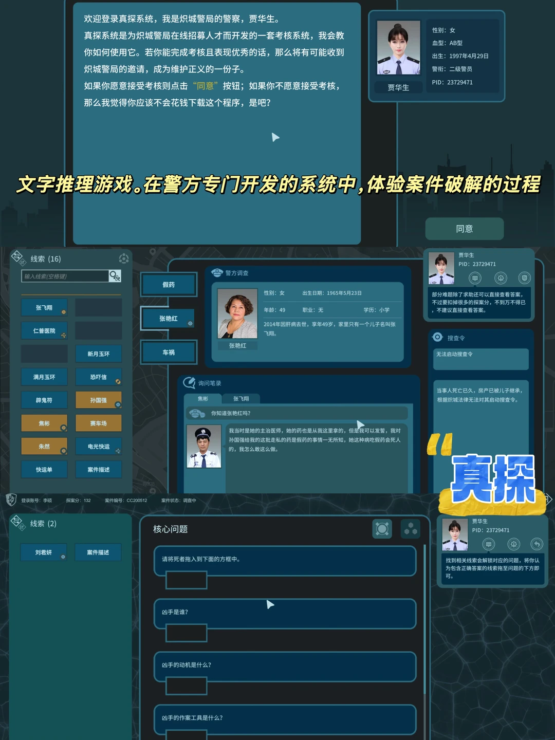 纯文字推理游戏,模拟警方选拔系统。推理逻辑有点强硬,但喜欢挑战推理规则的可以试试。