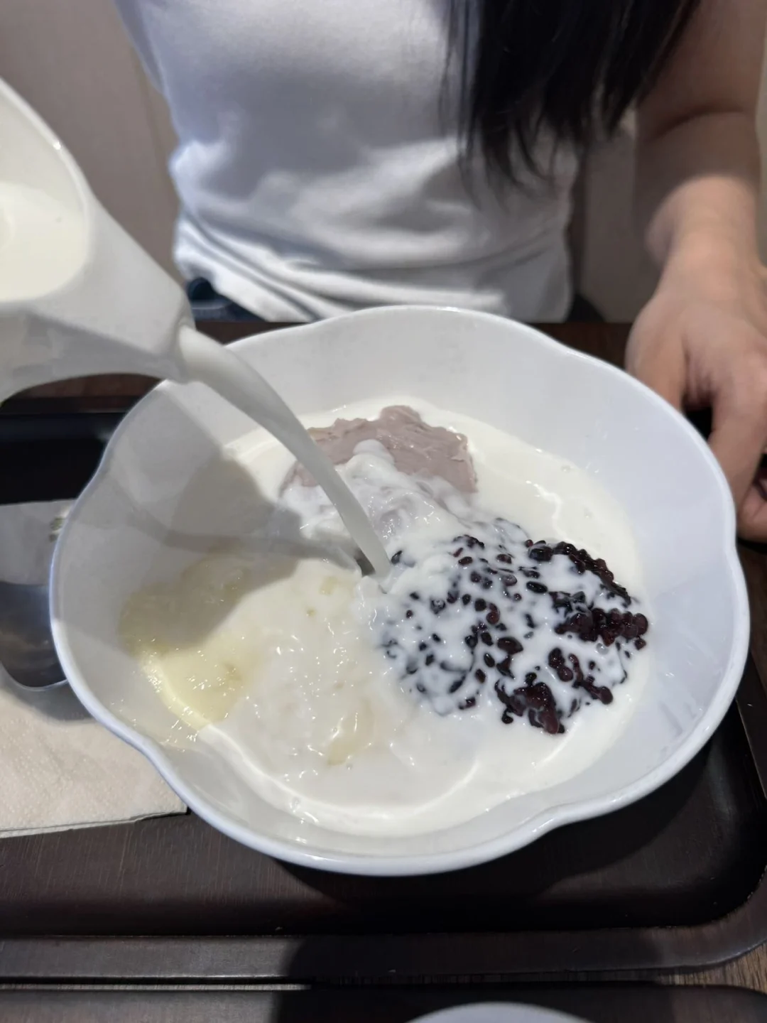泥软软糯糯的,黑米嚼着带点谷物香,奶麻薯更是糯到能拉丝!