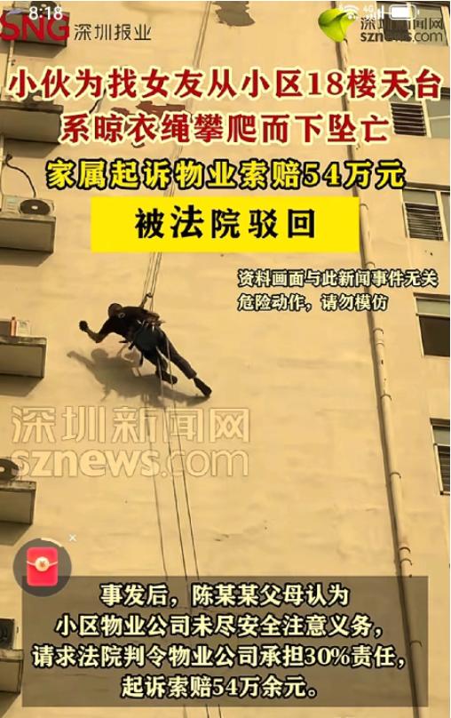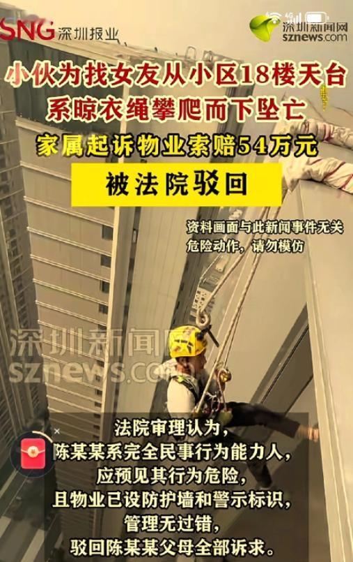 不是谁死谁有理!浙江宁坡,24岁男子去某小区找女友,将车停在小区后,进入18楼顶楼天台,随手捡起晾衣绳,系在一根管子上,另一端系在自己腰部,翻过防护墙顺管道往下爬,万万想不到绳子断了,男子从高空坠亡。事后,男子父母,以小区物业未尽安全注意义务,起诉到法院索赔54万余元。法院这样判! 2025年4月12日早晨,24岁的陈某某,心里只想着快点找到女友。 他开车来到女友住的小区,停好车后,就匆匆走进了某幢某单元的电梯。 到了18楼,他没去找女友家的门,反而朝着顶楼天台走去,8点25分左右,他走进了天台。这小区的天台是业主共用的,业主委员会为了方便大家晾衣服,特意在这儿搭了晾衣架,天台上还拉着不少业主用的尼龙晾衣绳,四周有1.25到1.26米高的防护墙,墙上还贴着明黄色的“禁止攀爬,危险”的警示标语,一眼就能看见。 可陈某某压根没把这些警示放在眼里,也没想着用正常方式找女友,他随手捡起一根晾衣绳,一头绑在天台上的公共管道上,另一头紧紧系在自己腰上,然后翻过防护墙,就想着顺着管道往下爬,说不定能直接到女友窗边,给个“惊喜”。 可他忘了,这晾衣绳本来就是用来挂衣服的,哪儿能扛得住一个成年人的重量?刚爬没多远,绳子“嘎吱”一声就断了,陈某某从18楼的高空直接坠了下去,当场就没了呼吸,医生检查后说,是重度开放性颅脑损伤,根本没机会抢救。 好好的一个小伙子,就因为一时冲动没了性命,他的父母肯定悲痛欲绝,换谁家里出了这种事,都得难受好一阵子。 可让人没想到的是,陈某某的父母没反思儿子的行为,反而把小区物业公司告上了法庭,要求物业赔偿54万多元,理由是物业没尽到安全注意义务。 他们觉得,天台的门没锁,让儿子轻易就进去了,天台上的晾衣绳也没人收,这才导致了悲剧,物业必须担30%的责任。 这事儿闹到法院后,宁波市北仑区人民法院仔细查了半天,最后给出的判决让不少人拍手称快——驳回陈某某父母的全部诉讼请求,物业一分钱都不用赔!为啥法院会这么判?这可不是不讲人情,而是讲道理、讲法律。 首先得说清楚,陈某某已经24岁了,是个完全民事行为能力人,不是不懂事的小孩。他长这么大,难道不知道从18楼往下爬有多危险?难道没看见墙上“禁止攀爬”的标语?明知道这么做可能会摔死,还偏要去试,这不是拿自己的命开玩笑吗?他自己主动做的这个危险行为,才是导致悲剧的根本原因,跟别人没半点关系。 说句实在话,物业的安全保障义务是有限的,不是说小区里出了任何意外,都得物业担责。物业管的是公共区域的正常安全,比如修修坏了的路灯、补补坑洼的路面、提醒大家注意防火防盗,可他们管不了也没法预见有人会做出这么极端、这么危险的事。 要是就因为陈某某自己鲁莽丢了命,就让物业赔钱,那以后哪个小区还敢留天台?是不是得把天台焊死,把所有晾衣架都拆了,连电梯都得装人脸识别,只准业主去自己家楼层?那小区还能住人吗?这既不公平,也不现实。 现在有些人就是有个歪理,觉得“谁死谁有理”“谁弱谁有理”,只要出了人命,不管自己有没有错,都想找个地方讹点钱。 可法律是讲公平正义的,不是讲人情绑架的。不能因为你家出了丧事,就不管对错让别人买单。要是这种歪理能行得通,那以后大家做事都不用负责任了,出了问题就找别人背锅,那社会不就乱套了? 陈某某的悲剧确实让人惋惜,24岁正是人生最好的年纪,就这么没了,他的父母肯定伤心。但伤心不能当理由,责任划分也不能被情绪左右。成年人就得为自己的行为负责,自己做的选择,不管后果多严重,都得自己扛着。物业已经尽到了该尽的义务,没做错任何事,凭啥要为别人的鲁莽行为买单? 法院的这个判决,其实就是守住了公平正义的底线,明确了责任边界。它告诉我们,“谁死谁有理”这套行不通,法律只看事实、看证据、看责任。 也希望通过这事儿,能给大家提个醒,生命只有一次,可不能因为一时冲动就拿自己的命开玩笑。 不管做啥事儿,都得先想想后果,别等到出了事儿,才想着找别人负责,到时候后悔都来不及了。