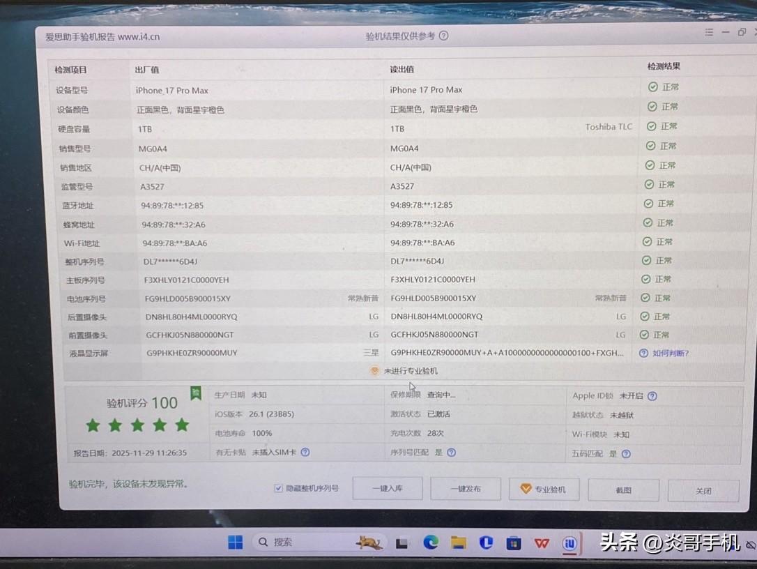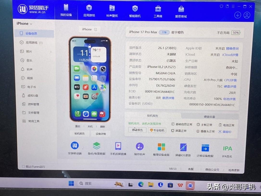 【国行在保】苹果17 Pro Max 1TB 星宇橙色 核心信息: • 版本:国行全网通,型号MG04CH/A • 存储:1TB超大容量,存满照片/视频/游戏无压力 • 成色: ✅ 屏幕:完美无划痕、无老化、无亮点,显示清晰细腻 ✅ 边框:仅一处小磕(已拍细节图,不明显,不影响使用和美观) ✅ 机身:无明显划痕和磨损,整体成色很新 • 电池:健康度100%,仅充电28次,续航和新机几乎一致 • 保修:官方在保至2026年10月13日,后续使用有保障