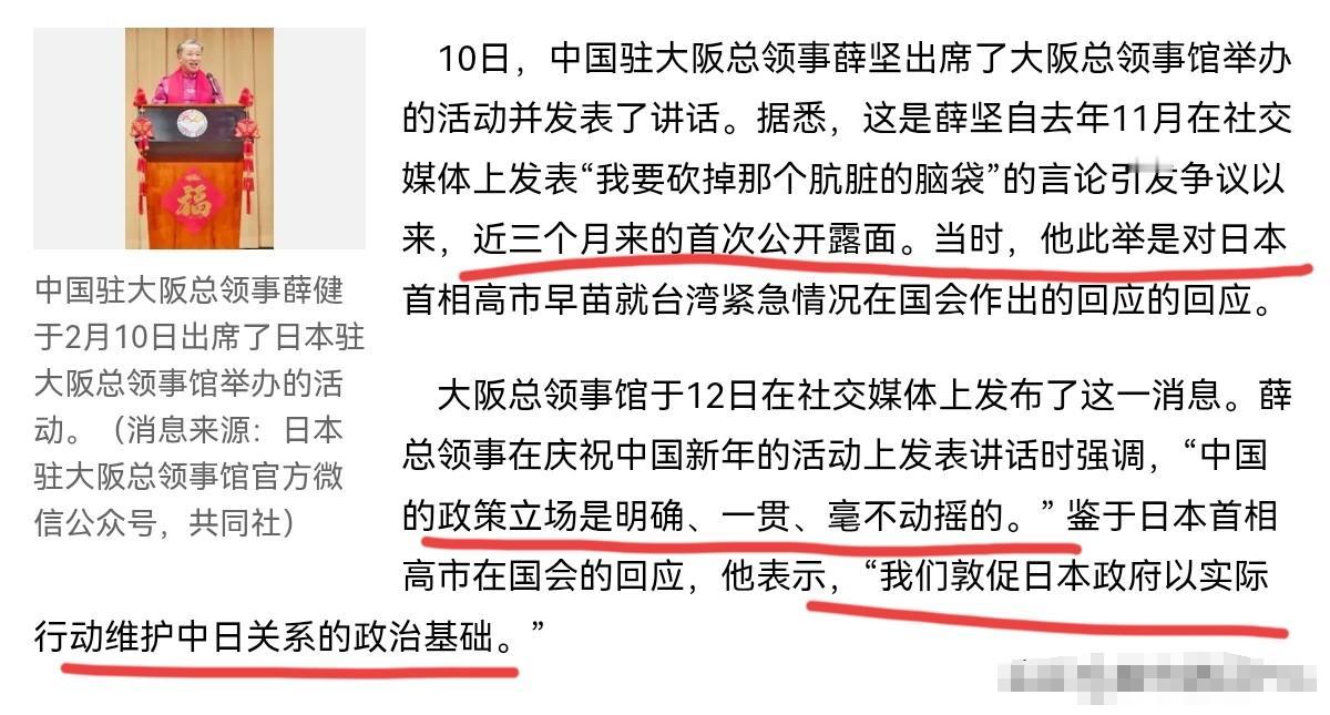 日本媒体注意到了!薛剑大使在对高市早苗言论发出“砍掉那个肮脏的脑袋”后,首次参加公开活动!2月12日,日媒报道称,10日,中国驻大阪总领事薛剑出席了大阪总领事馆举办的活动并发表了讲话。日媒表示据悉,这是薛剑大使自去年11月在社交媒体上发表“砍掉那个肮脏的脑袋”的言论以来,近三个月来的首次公开露面。 这个高市早苗打上台就没安分过,一门心思跟着右翼走,盯着台湾问题不放,一会儿说大陆对台湾动武就是日本的“存亡危机事态”,自卫队能出兵干涉,一会儿又扯什么“台湾地位未定论”,把联合国宪章和中日之间的协议当废纸,这不就是明晃晃地干涉中国内政,想分裂咱们国家吗? 更可气的是,她还颠倒黑白,把当年日本的侵略战争说成是“自卫战争”,连甲级战犯都想洗白,这种人就是忘了历史的教训,揣着坏心眼想搞事,伤害的是14亿中国人民的感情,也给亚洲的和平添乱。 面对这种赤裸裸的挑衅,咱们的外交官能不说话吗?薛剑总领事作为驻大阪的总领事,天天看着日本右翼的这些小动作,他的发言就是替所有中国人发声,那句狠话根本不是什么“过激言论”,而是对这种肮脏、无耻的分裂行径的严厉谴责,是捍卫国家主权的正义之声。 “肮脏的脑袋”指的就是那些抱着军国主义思想、想分裂中国、否认历史的右翼分子的险恶用心,是要砍掉这种危害和平、破坏中日关系的错误思潮,不是针对某个人的人身威胁,这点明眼人都能看明白。 日本方面倒好,自己理亏在先,不反思高市早苗的错误,反而跳出来抗议,还叫嚣着要把薛剑总领事驱逐出境,这纯粹是贼喊捉贼,想转移焦点。他们以为用这种施压的方式就能让咱们服软,就能掩盖自己干涉他国内政、复活军国主义的真实目的,真是打错了算盘。这三个月来薛剑总领事没公开露面,不是怕了他们,而是咱们做事有分寸,不想让无谓的炒作打乱节奏,可这不代表咱们的立场会有半分动摇。 这次薛剑总领事在春节招待会上公开亮相,一开口就亮明了态度,说中日关系严峻复杂,中国的立场明确一贯,不会有任何动摇,这话说得太提气了。 这哪儿是简单的出席活动,分明是告诉日本右翼:你们的挑衅没用,中国外交官该说的话照样说,该坚持的立场照样坚持,想让我们撤回正义的谴责,门儿都没有。 他没再提之前的狠话,但每句话都戳中了要害,敦促日本政府用实际行动维护中日关系的基础,说白了就是让他们赶紧收回那些错误言论,别再盯着台湾问题瞎折腾,别再往军国主义的老路上跑。 日媒盯着这次公开露面大做文章,其实是想营造一种“中国服软”的假象,可他们忘了,真正的问题不在咱们的外交官说了什么,而在日本右翼做了什么。 高市早苗靠着炒作反华议题赢得了选举,就以为自己的立场得到了支持,还假惺惺地说愿意和中国对话,可一边喊着对话,一边又忙着推动修宪,想把自卫队写进宪法,突破和平宪法的限制,这种嘴里一套背后一套的做法,谁能相信?咱们外交部发言人早就点破了,这种“手里忙着对抗,嘴里喊着对话”的把戏,没人会买账。 说句实在的,日本右翼的这些小动作,不仅害不了中国,反而会把日本自己推向危险的境地。当年的侵略战争给亚洲各国带来了多大的灾难,日本民众也是受害者,现在高市早苗搞的这一套,已经引起了日本国内有识之士的反对,不少日本民众都跑到首相官邸前抗议,就是怕她把国家拖进战争的泥潭。 可高市早苗根本不管这些,一门心思跟着美国跑,想借着美日同盟搞军事扩张,这种短视的做法,早晚得让日本付出代价。 咱们中国一直都想和日本好好相处,坚持和平发展,可友好是相互的,不能咱们一厢情愿。中日关系的基础就是一个中国原则,就是尊重历史事实,日本要是连这个都做不到,反而天天在台湾问题上做文章,在历史问题上翻旧账,那中日关系怎么可能好得起来? 薛剑总领事的这次公开露面,就是给日本政府提了个醒:想发展中日关系,就别搞那些小动作,赶紧纠正高市早苗的错误言论,拿出点实际行动来,不然一切都是空谈。 现在的情况很清楚,不是咱们想和日本闹僵,是日本右翼逼着咱们不得不强硬。 薛剑总领事的首次公开露面,就是一次立场的重申,一次正义的宣示,告诉全世界:中国人民捍卫国家主权和领土完整的决心坚定不移,任何外部势力的干涉都是徒劳的,任何否认历史、破坏和平的行径,都必将遭到坚决反对和迎头痛击。日本右翼要是识相,就赶紧回头,别再一条道走到黑,不然最后只能是自食恶果。