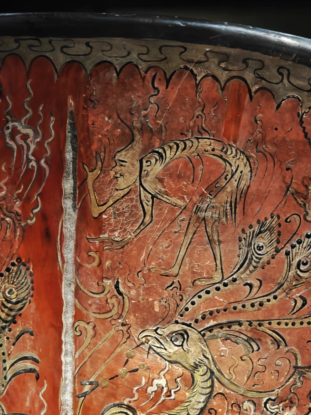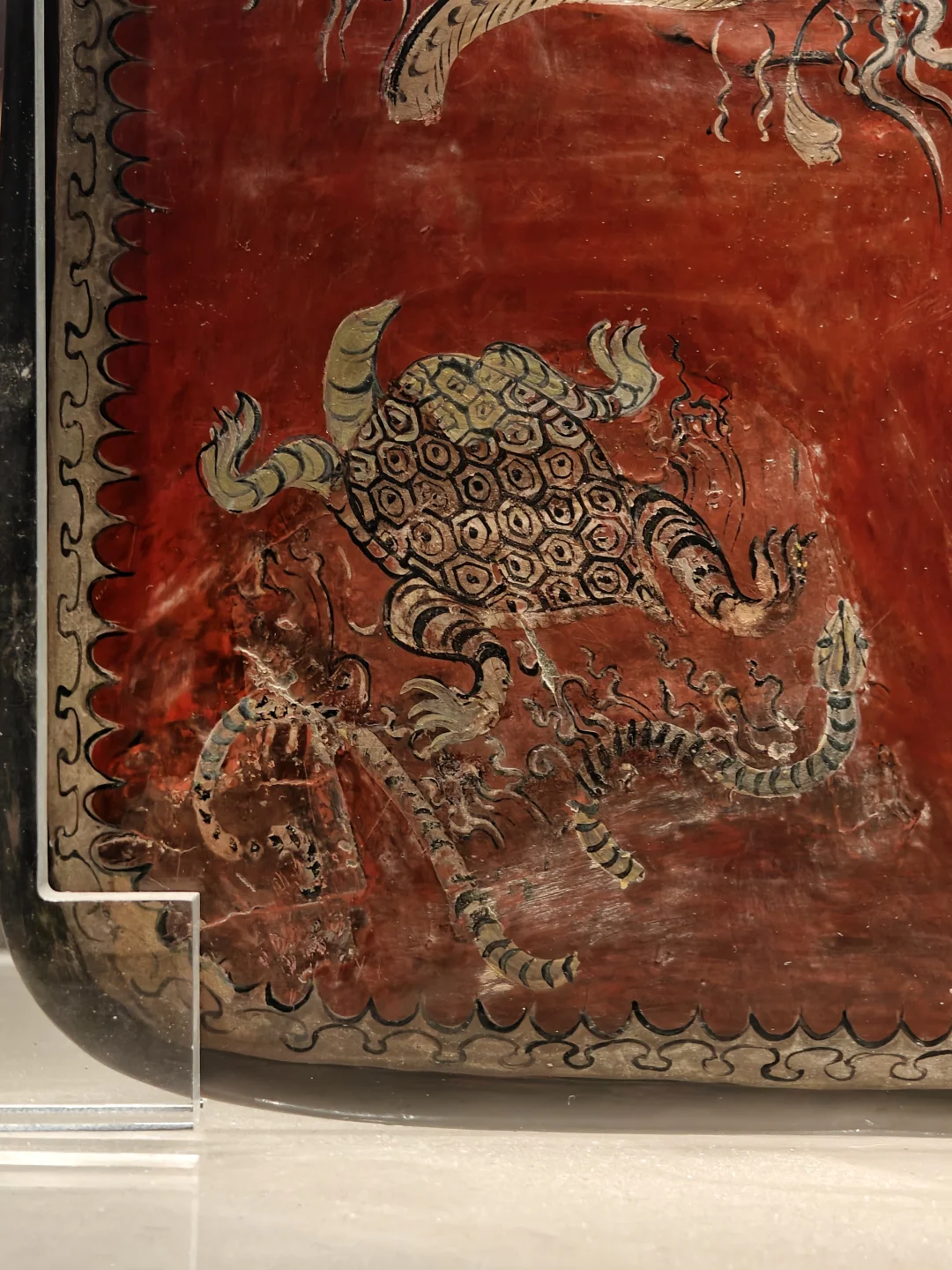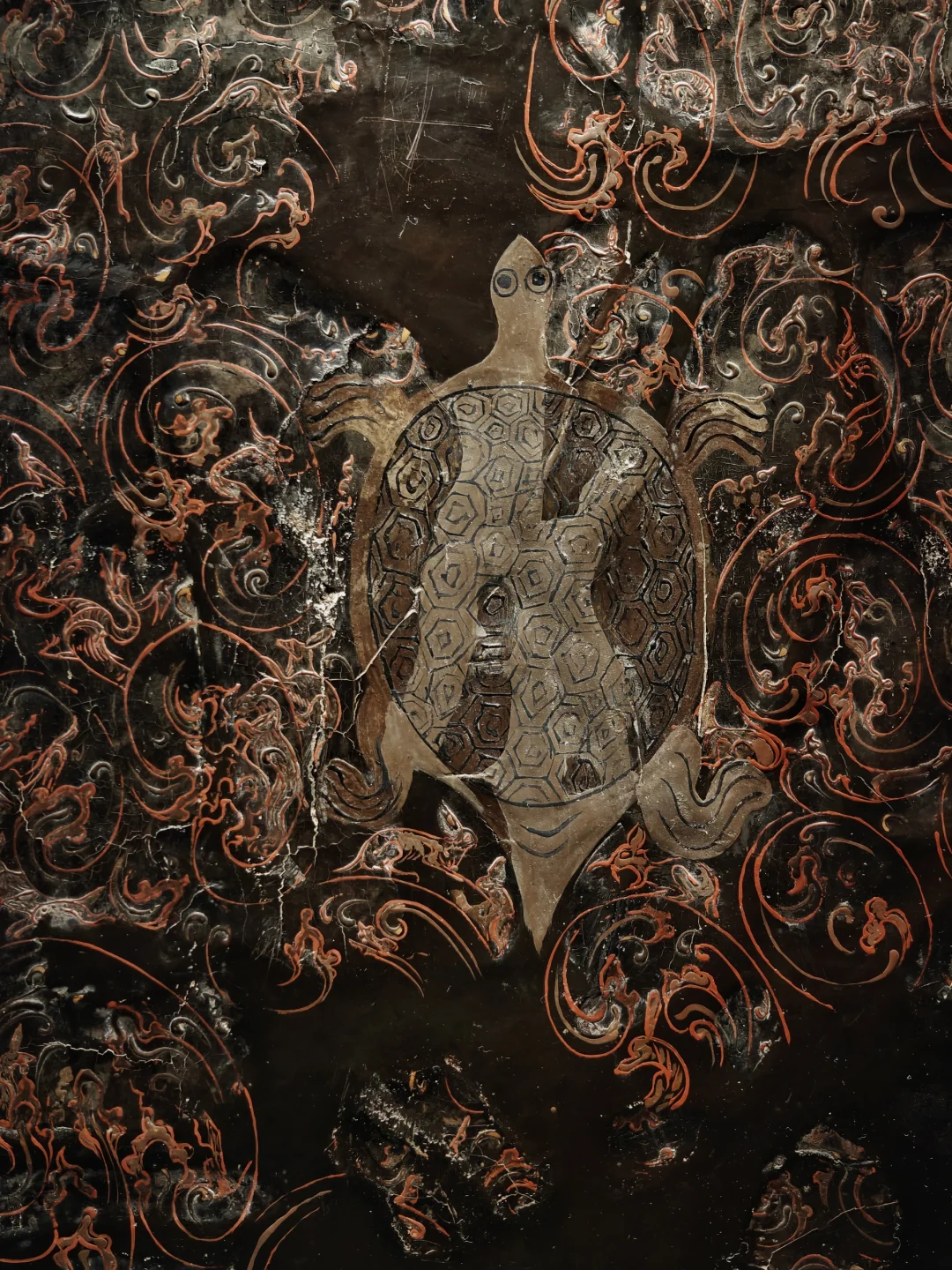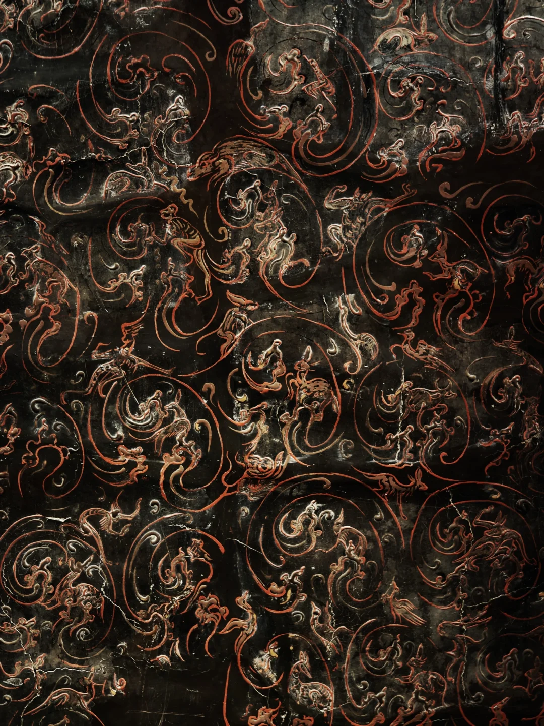 ⚫背面黑漆为底,红褐云气纹中隐藏鹿、兔、牛、飞鸟及羽人等小动物,中部绘巨龟象征长寿,纹饰繁密而富有生趣。