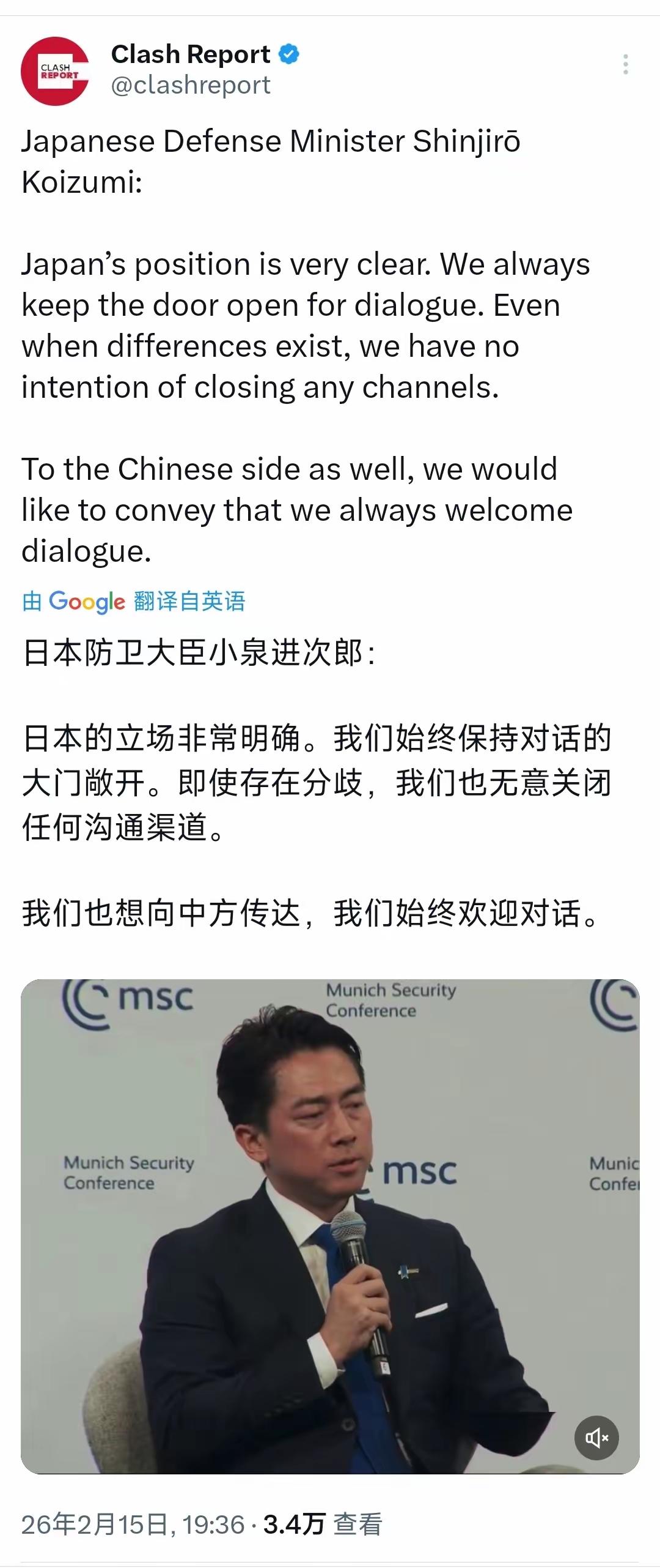 日本防卫大臣小泉进次郎昨晚(北京时间2月15日晚)在慕尼黑表示:“日本的立场非常明确。我们始终保持对话的大门敞开。即使存在分歧,我们也无意关闭任何沟通渠道。我们也想向中方传达,我们始终欢迎对话。”