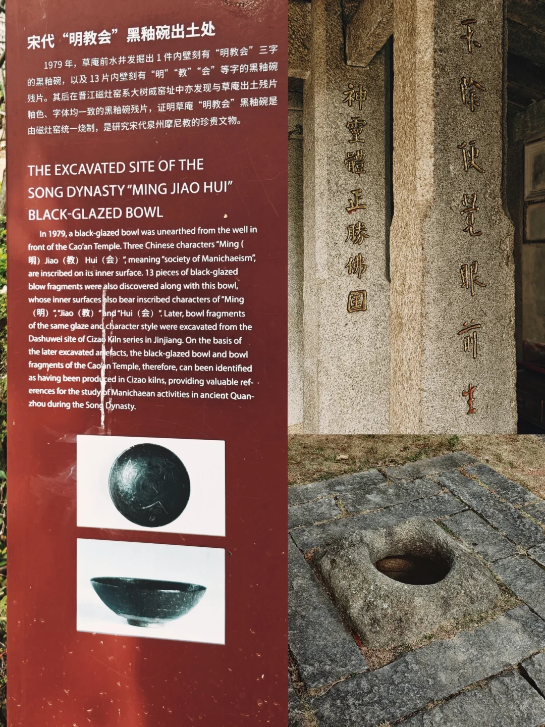 草庵前有一口古井,发掘出一件北宋年间在华表山结社活动的“明教会”在磁灶窑系大树威窑订烧的“明教会”褐釉碗和几十块残片。