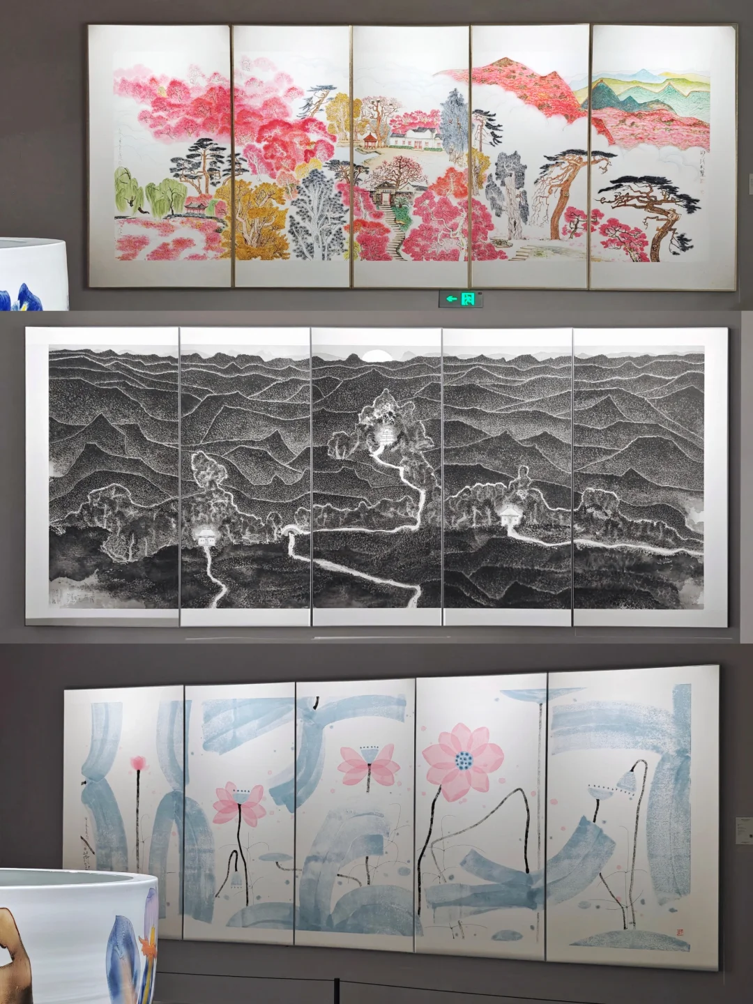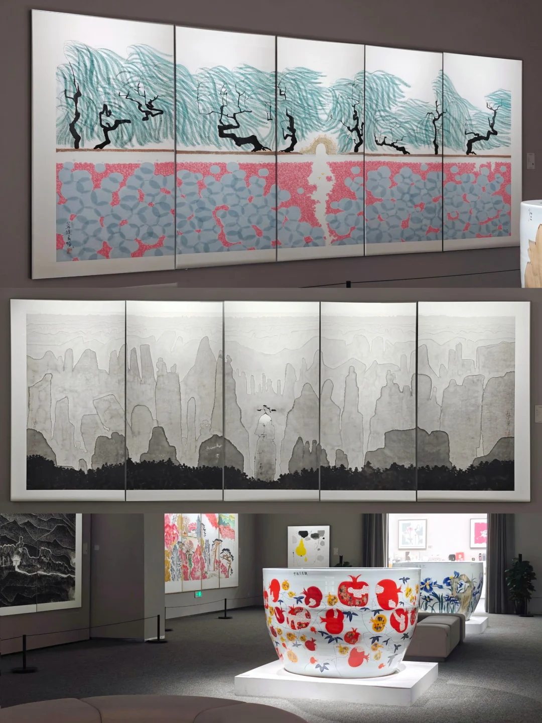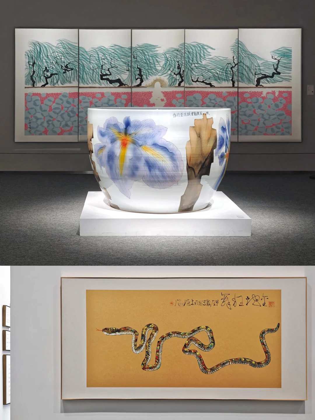 🖼️展览分为两个展区,涵盖杭州西湖系列(G20主题)、蛇年新作《金蛇狂舞》、中法建交60周年作品(绘画、书法、缂丝、陶瓷)等40余件。大多作品尺幅巨大,空间的布光展陈很专业,层高也很足够,能够展现老先生作品的宏大气场,值得到现场观看。
