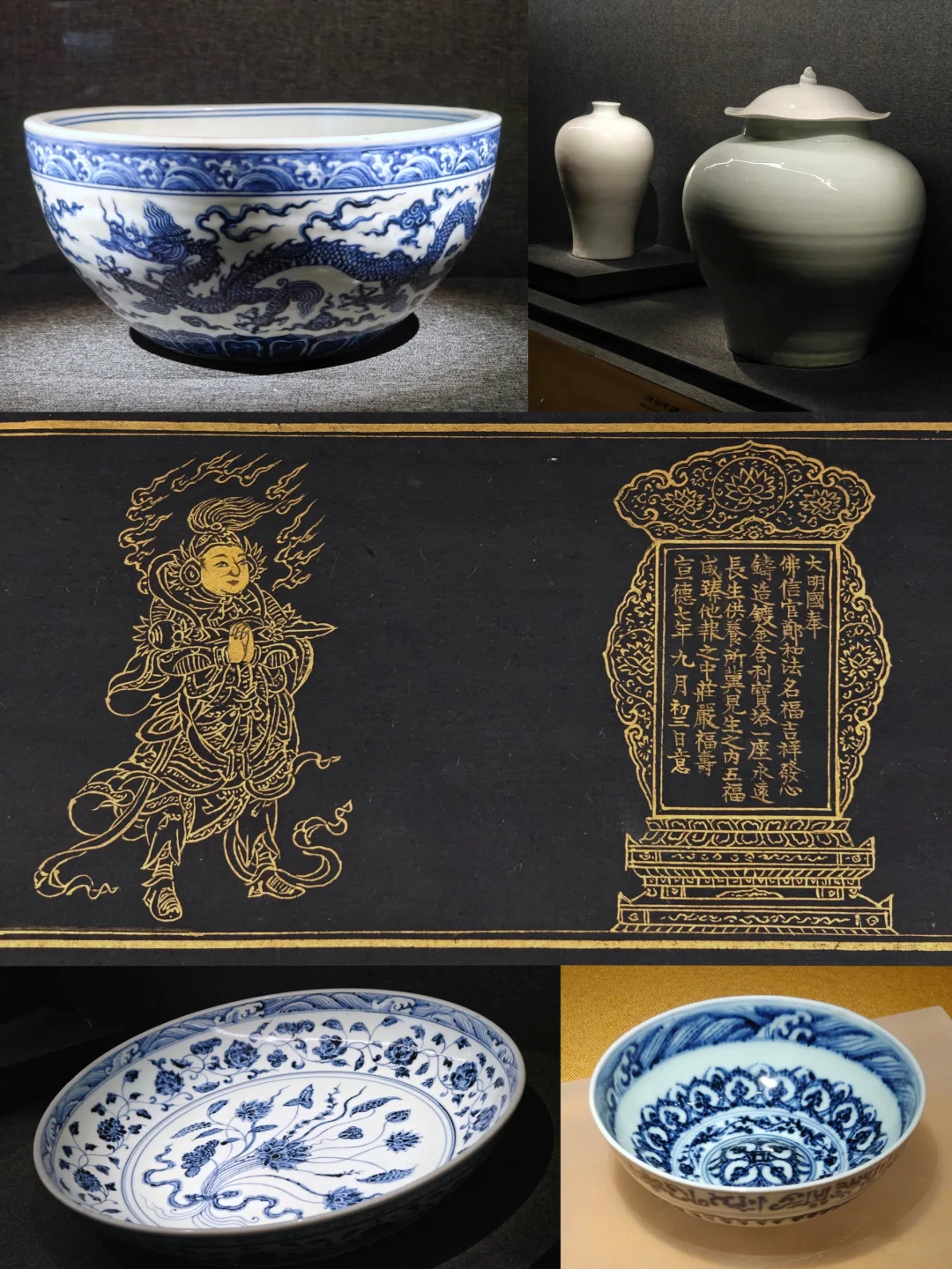 明永乐三年,郑和率领船队从南京出发开启了海上远航活动,28年间7次下西洋。永乐、宣德、成化时期的瓷器上开始出现大量海水波涛纹和异兽纹,这应与海事活动有很大关系。比如镇馆之宝永乐青花寿山福海纹三足炉,青铜鼎样式,腹部纹饰为寿山福海纹,海水波涛汹涌,气势宏大。