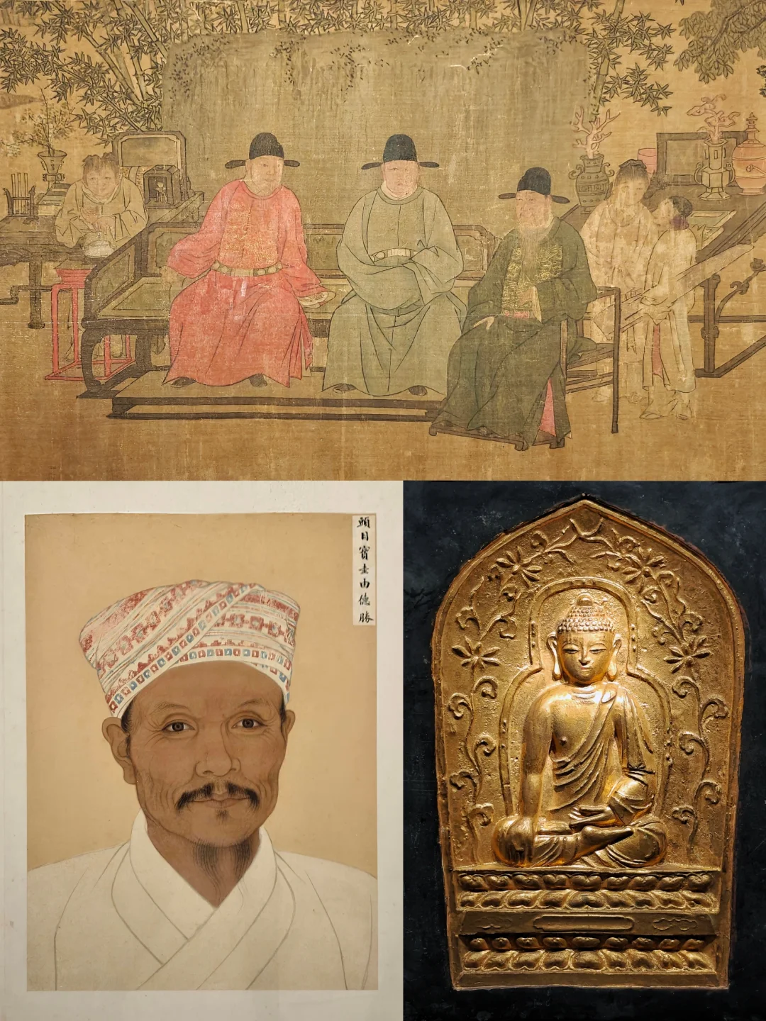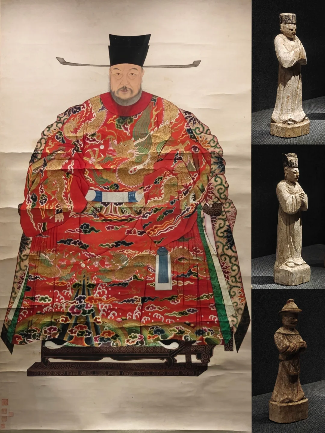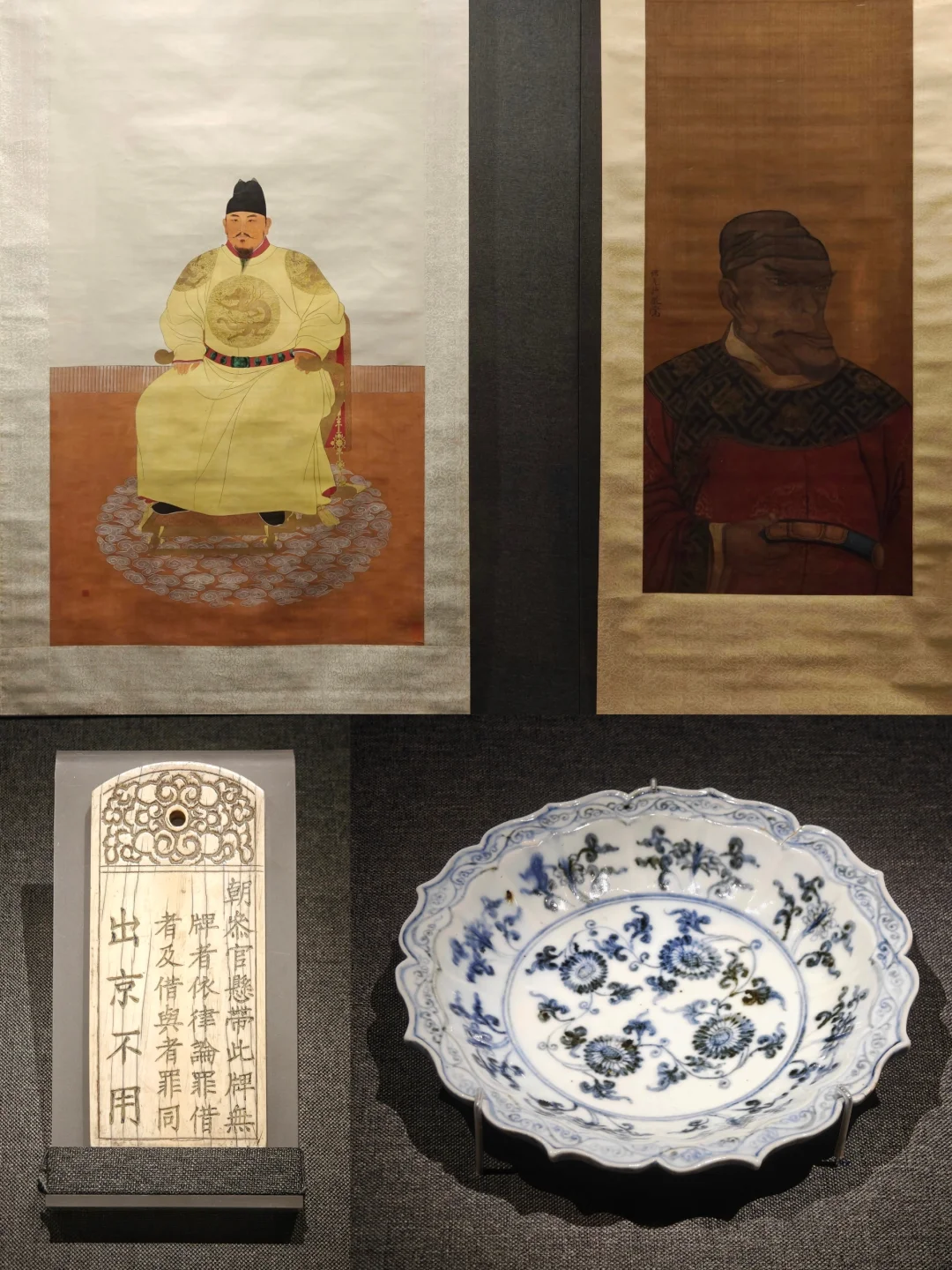 国博《明太祖正形像》和南博清代《孙克弘款明太祖像》,序厅一进门就是这两张画像并置,引出一个民间津津乐道的话题:朱元璋到底是鞋拔麻子脸还是正常脸。清人为抹黑朱元璋故意画丑的说法是肯定不对的,明代中晚期异像就流传甚广。一说是奇异的长相应是相学中的“龙形”,有天命所归之意,满足民众对皇帝的神化心理;一说朱元璋故意作伪像以便微服私访;也有说野史中朱元璋多疑嗜sha,故被表达成残暴凶狠的形象。后面的章节有朱棣画像,和朱元璋正像几乎一模一样,理论上官方画像更靠谱。