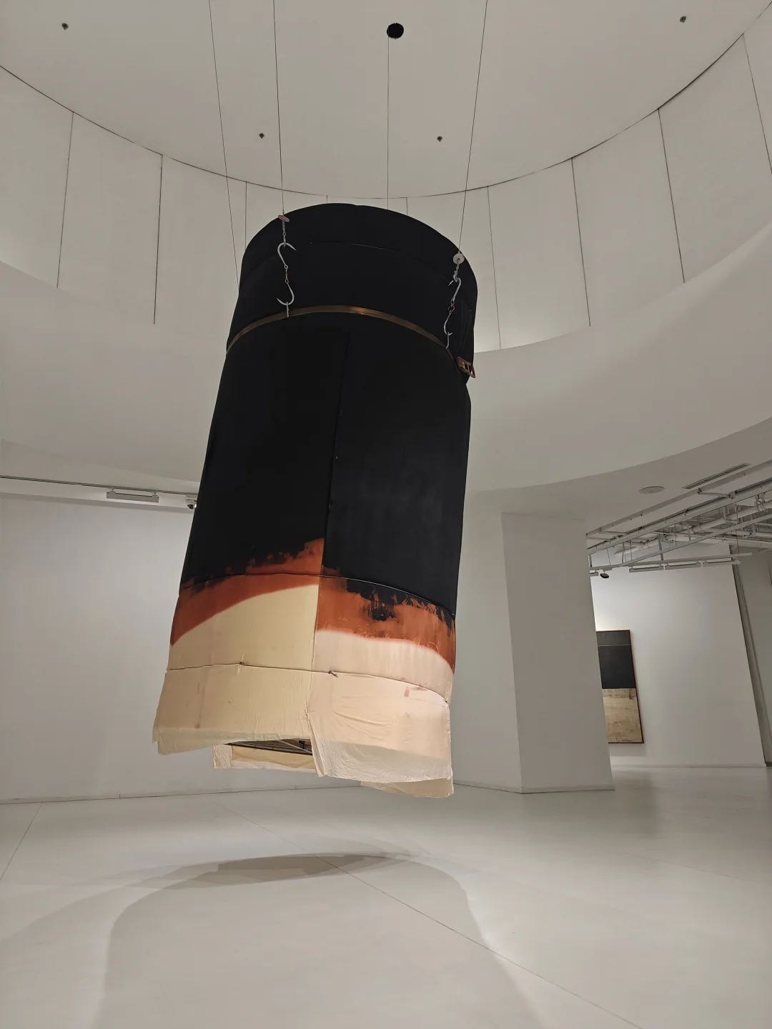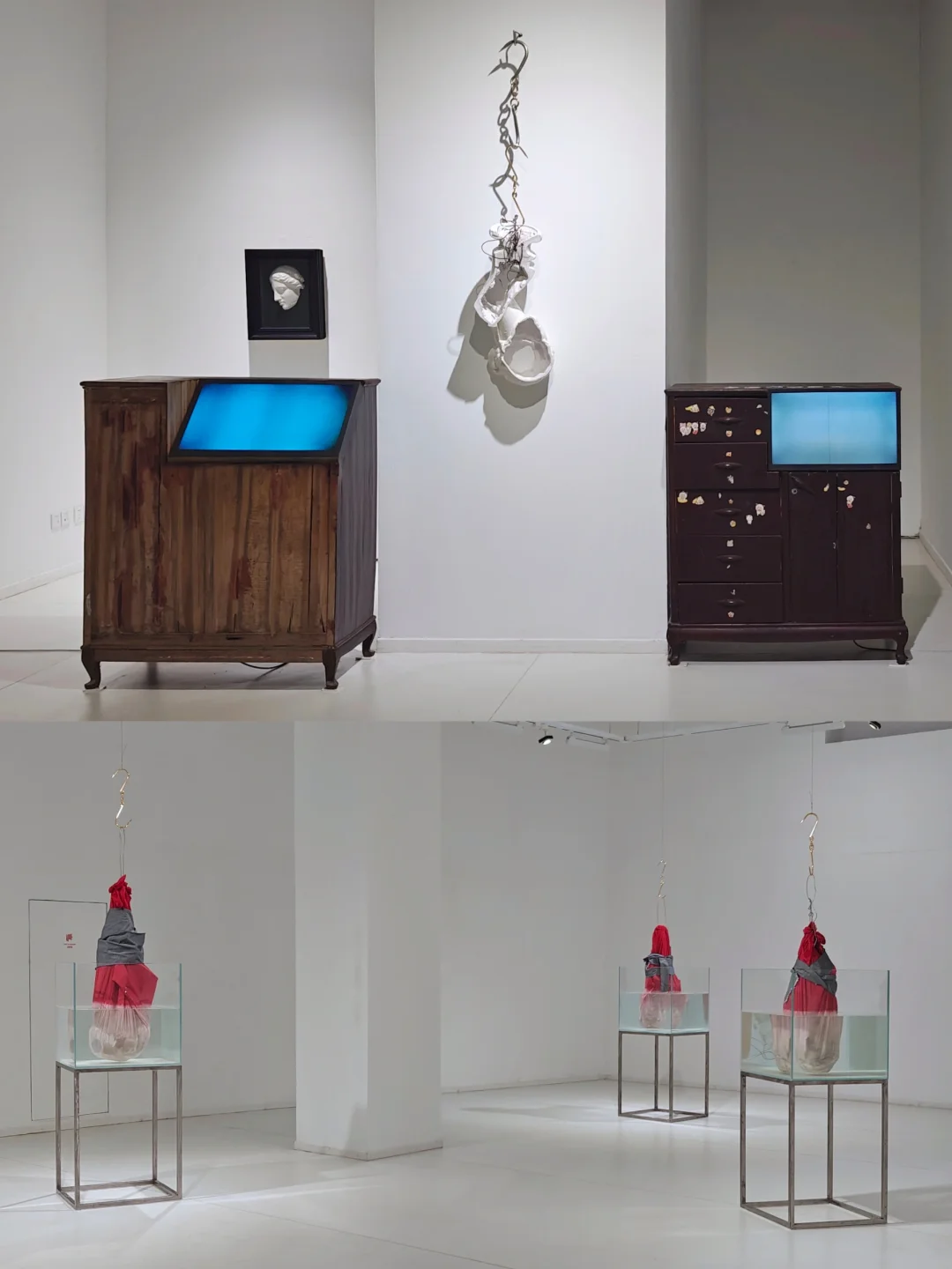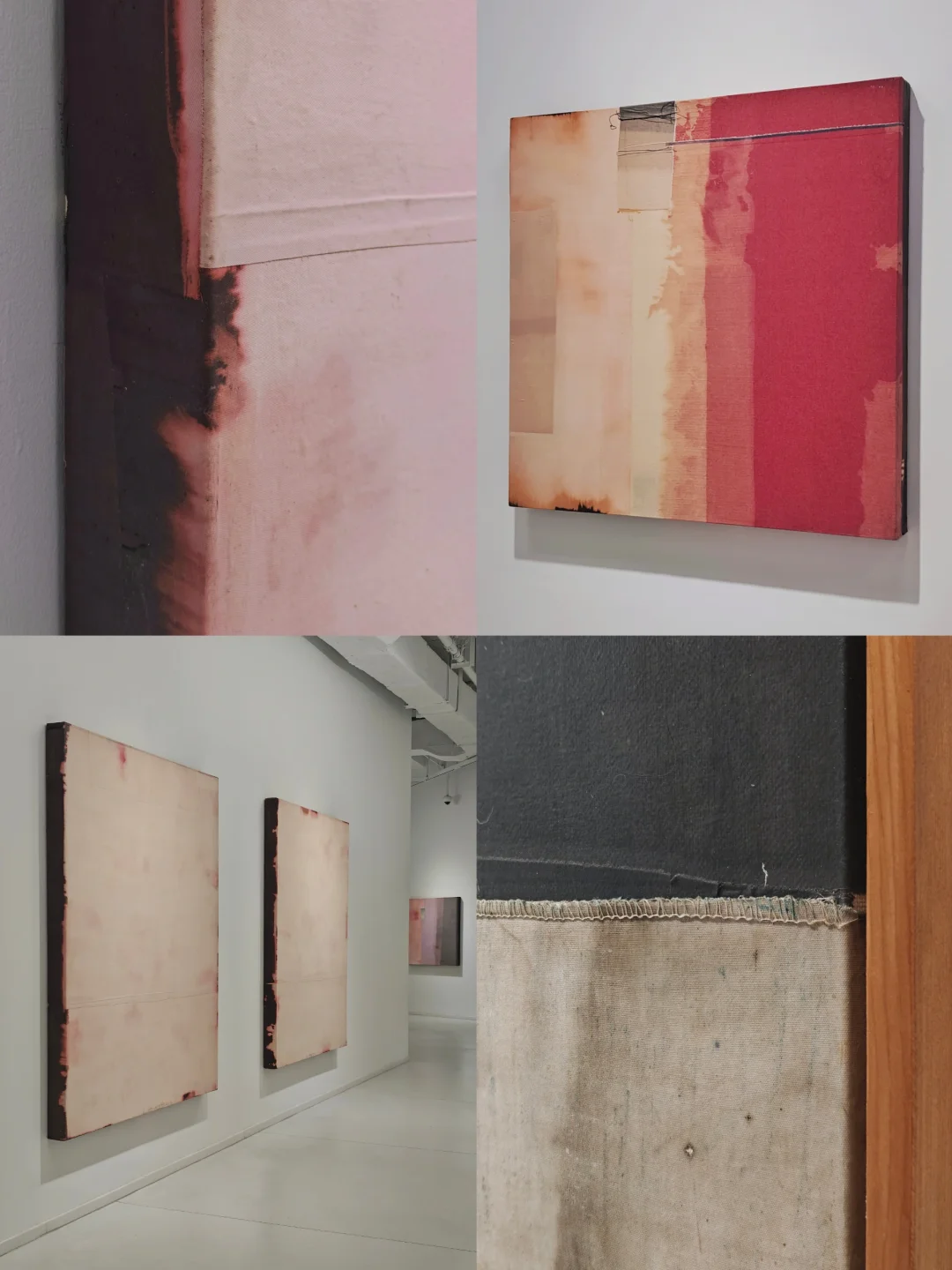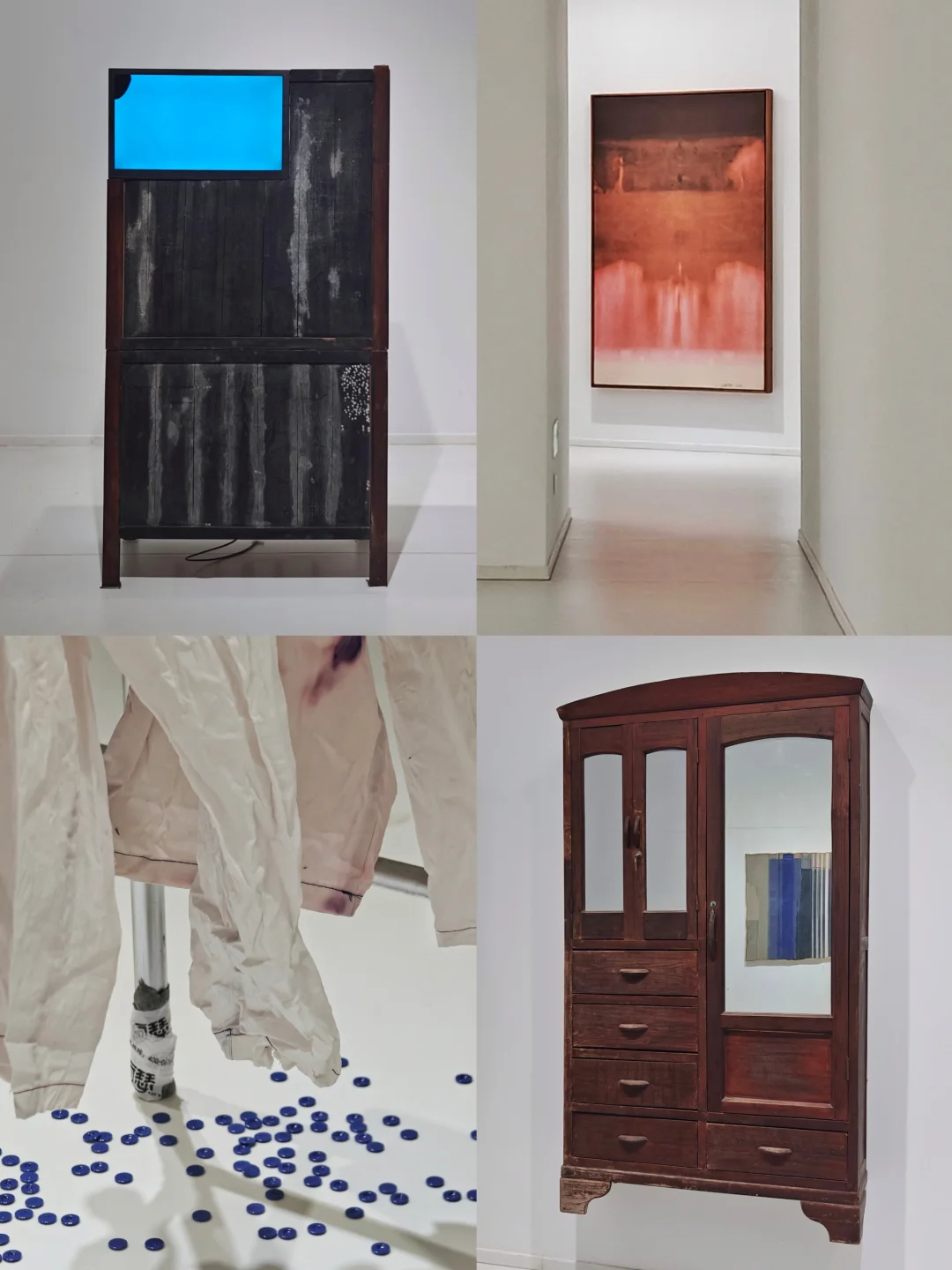 以纺织品为媒介,借染色与脱色探索存在主义。布卷悬于天花板,浸入褪色剂以还原白色,此过程是核心。尽管无法完全恢复本色,但这一尝试已极具意义。当把布卷从玻璃缸拉出悬于空中,形成独特雕塑装置,象征天地间的安置,凸显其在有色与无色间的中间状态,恰如解析穿着织物主体的辩证法,在理性与情感、责任与倾向、光与影等对立元素间,展现出深刻的艺术内涵与思考