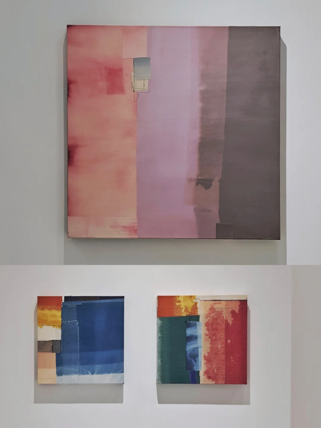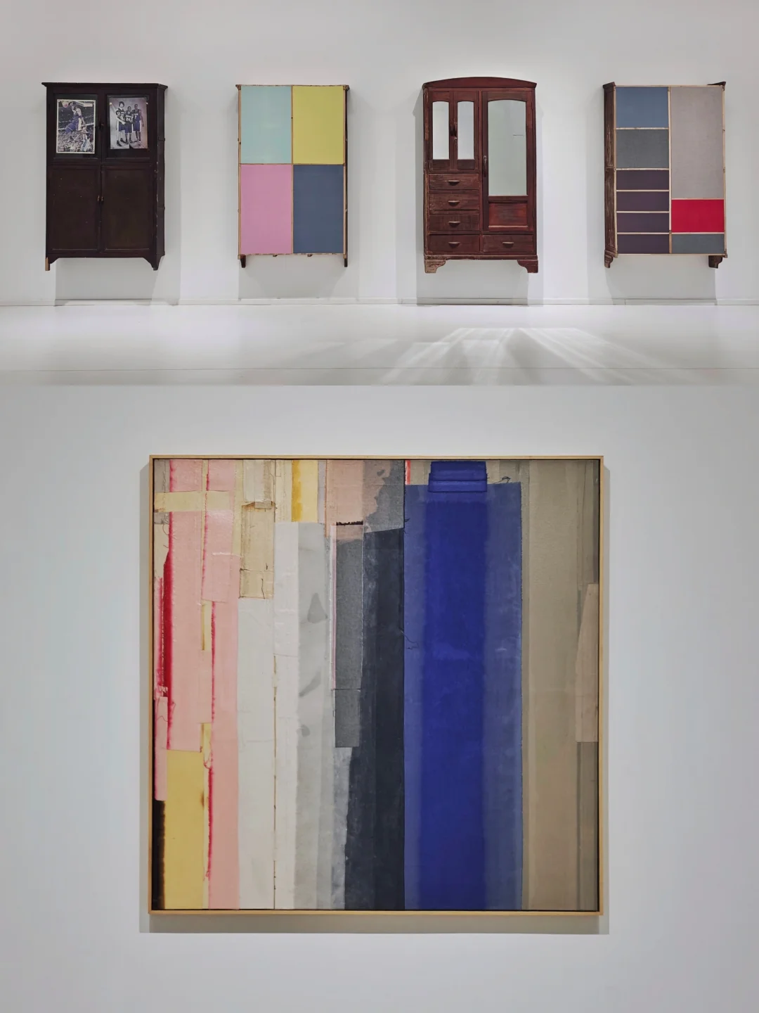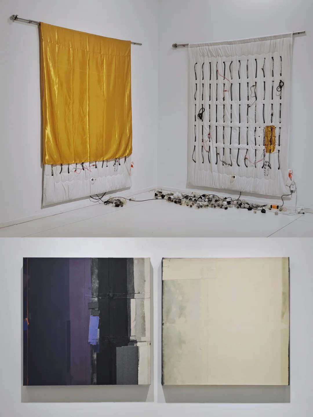 以纺织品为媒介,借染色与脱色探索存在主义。布卷悬于天花板,浸入褪色剂以还原白色,此过程是核心。尽管无法完全恢复本色,但这一尝试已极具意义。当把布卷从玻璃缸拉出悬于空中,形成独特雕塑装置,象征天地间的安置,凸显其在有色与无色间的中间状态,恰如解析穿着织物主体的辩证法,在理性与情感、责任与倾向、光与影等对立元素间,展现出深刻的艺术内涵与思考
