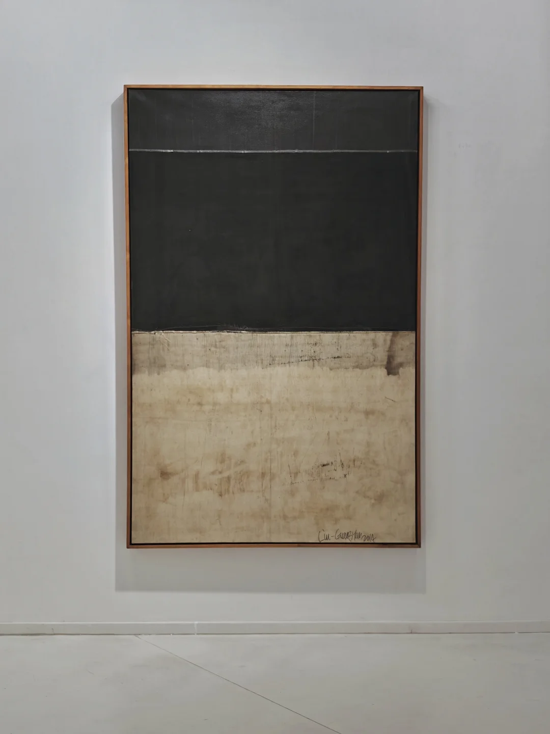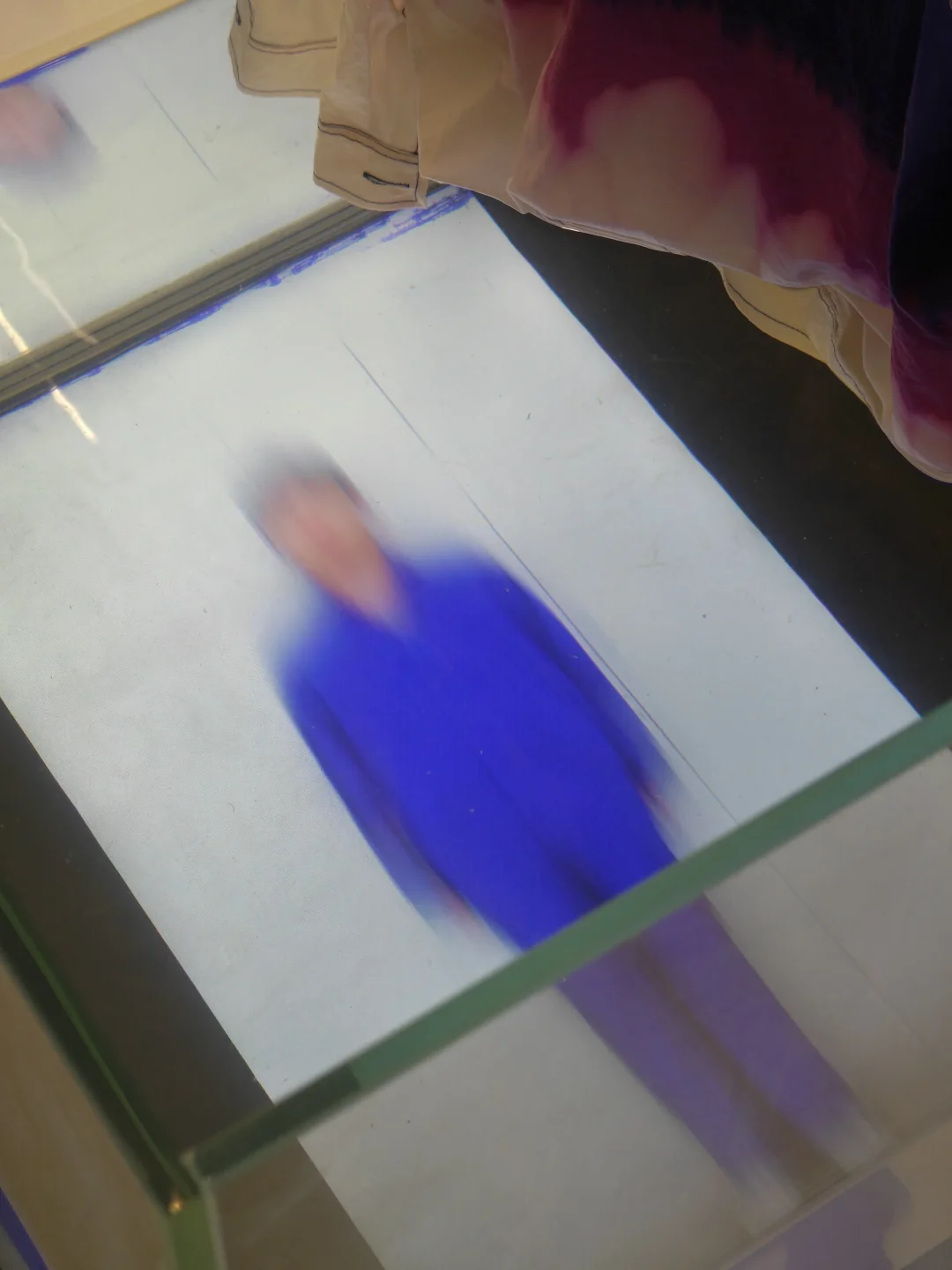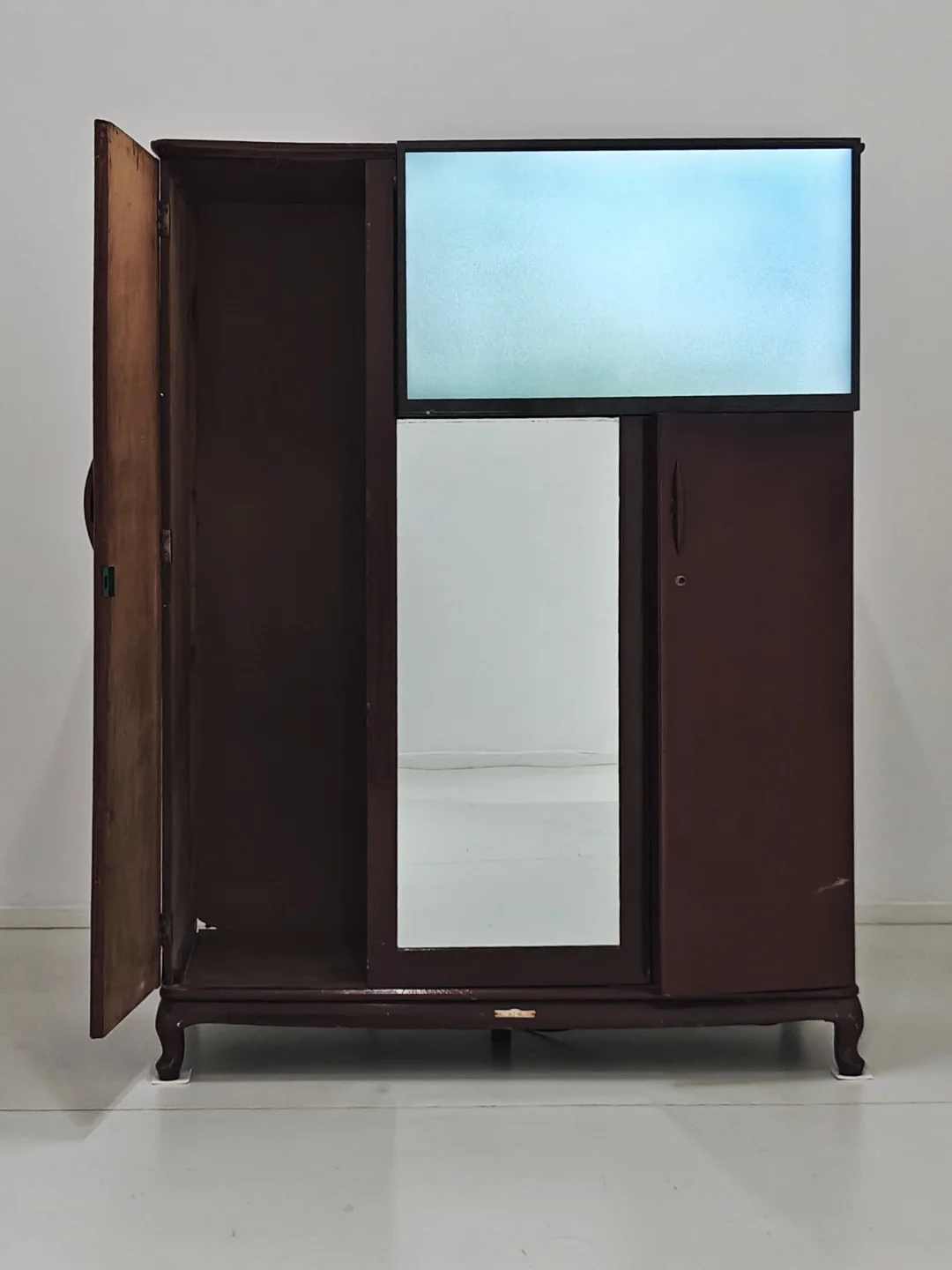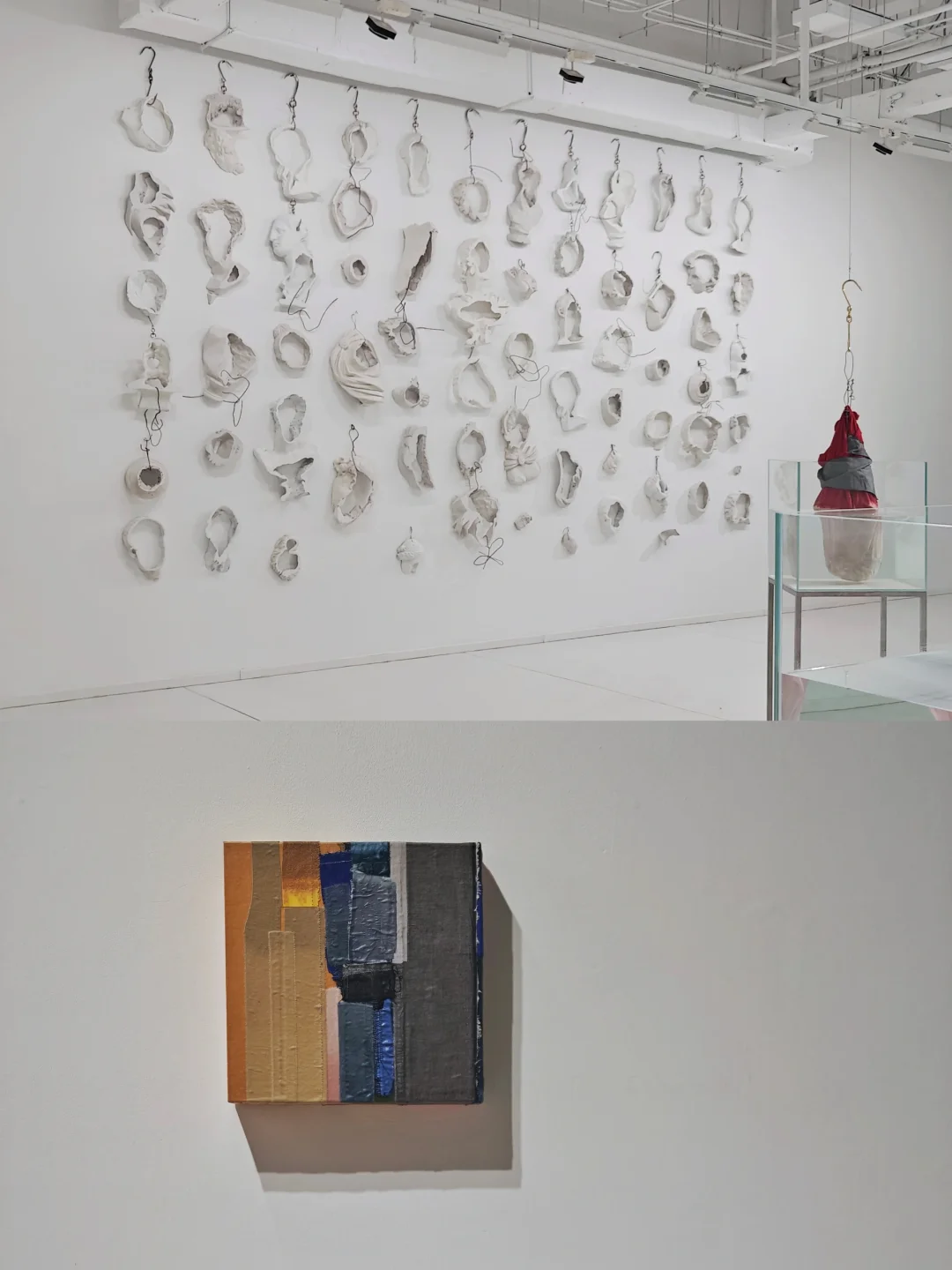 以纺织品为媒介,借染色与脱色探索存在主义。布卷悬于天花板,浸入褪色剂以还原白色,此过程是核心。尽管无法完全恢复本色,但这一尝试已极具意义。当把布卷从玻璃缸拉出悬于空中,形成独特雕塑装置,象征天地间的安置,凸显其在有色与无色间的中间状态,恰如解析穿着织物主体的辩证法,在理性与情感、责任与倾向、光与影等对立元素间,展现出深刻的艺术内涵与思考