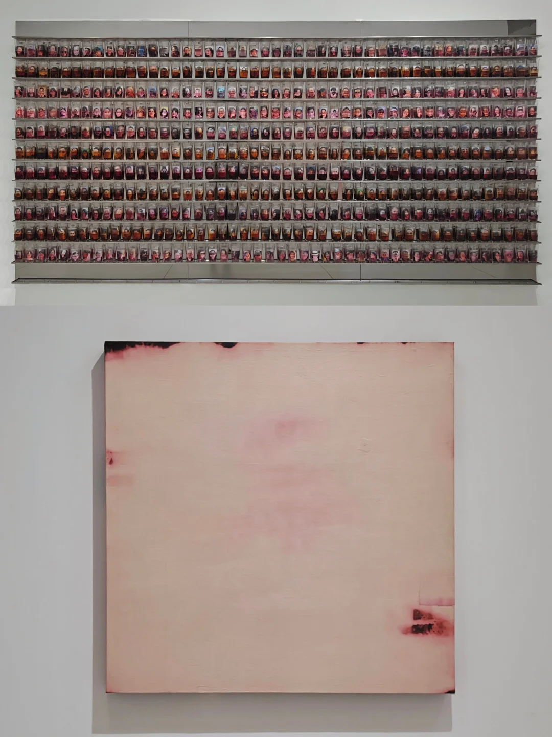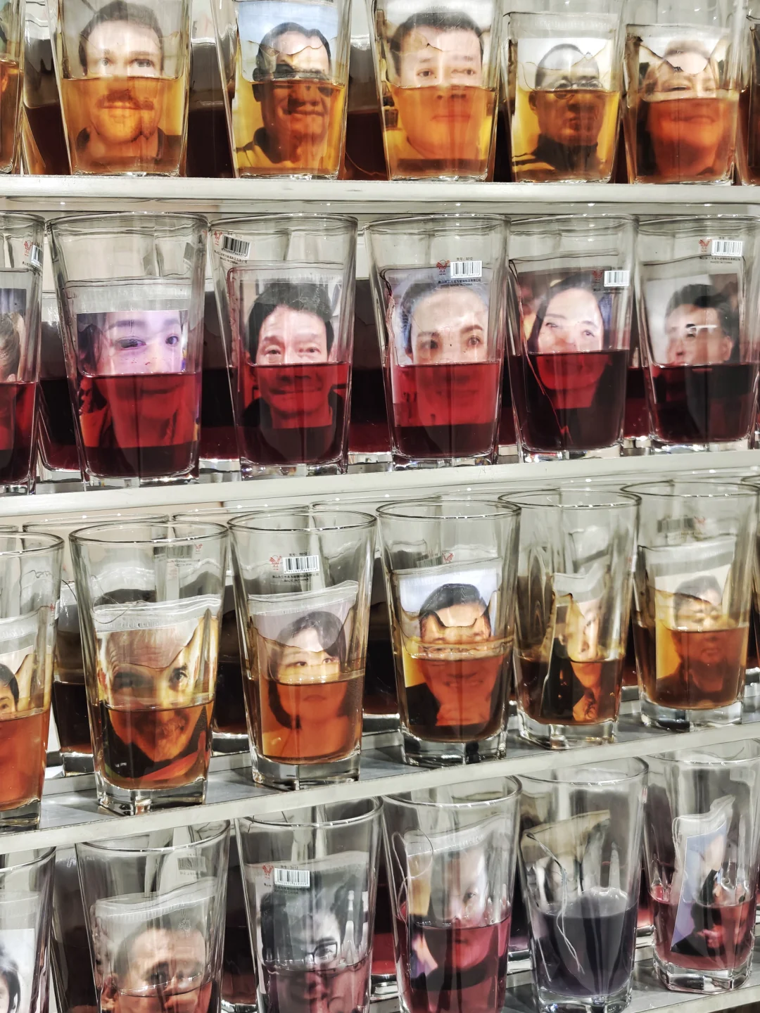 以社交软件上朋友和熟人的头像照片为元素,黑白与彩色兼具的照片置于格式统一的杯中,一半茶一半酒,茶酒选择极具象征意义,彰显其交友无民族界限。艺术家通过此作在公开与私密领域构建熟悉与陌生的关系,网络头像经反相处理与水折射后形状变异,暗示识别差距。500 个玻璃杯组成的装置颇具极简主义风格,茶酒排列引发视觉上由浅入深或由深至浅的渐变体验,参观者甚至能在空气中嗅得茶酒香气,收获联觉体验。