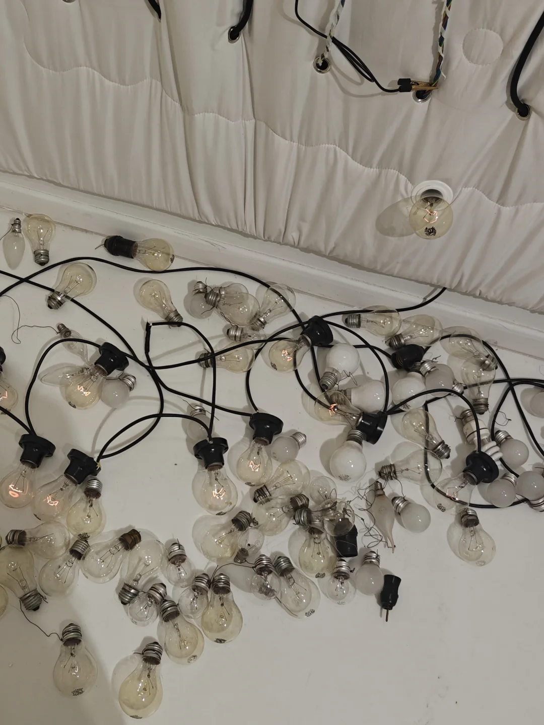以白棉被、金被罩搭配电缆电线为特色,灯泡可互动。棉被私密贴身,电线却显危险,二者相悖。如弗洛伊德对梦的剖析,此超现实作品或在暗示,近在咫尺之物未必安全,引人深思表象与内在的差异。