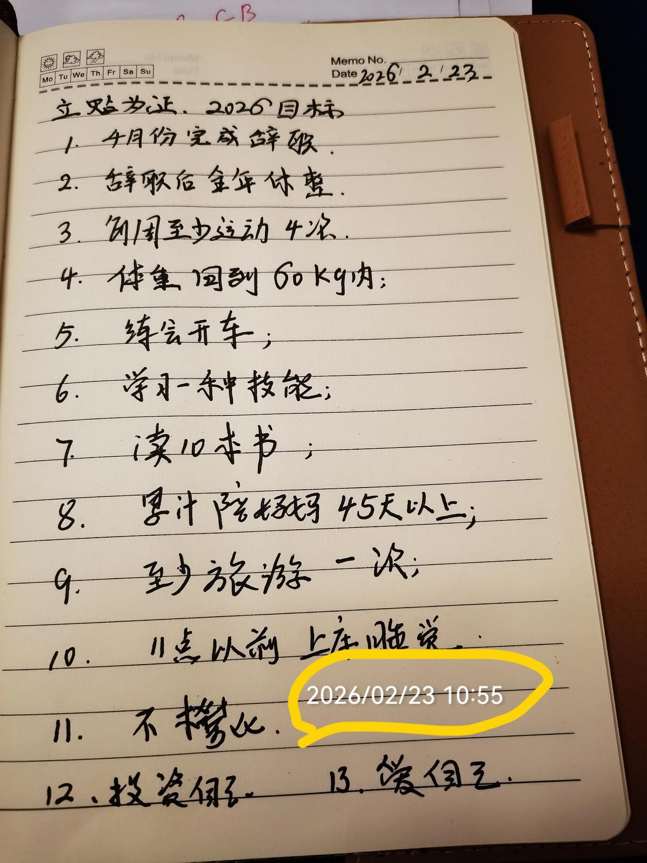 【立贴为证,53岁,2026年目标】 1、辞职,在人间最美4月天回到家乡。 2、辞职之后,今年都处于调整状态。 3、全年健身,每周至少4次,把自己身体调整好。 4、挨饿挨饿再挨饿,体重重回60KG以内。 5、一定要在国内把车练会。(这边是司机右座,而且没有红绿灯,基本没有行人;还有,我没有开过夜车) 6、持续学习,学习一种技能。 7、读10本书(目前一本没读) 8、全天候陪老妈妈至少累计45天。 9、选一个自己喜欢的地方去旅游。 10、确保晚上11点以前上床,如果不好睡,尽量闭门养神。 11、永远把自己放在第一位,投资自己,愉悦自己,学会放下,学会释怀。 12、绝不攀比,不要求孩子怎样,不要求老公怎样,只要求自己。 13、持续性的记录,记录生活,记录自己;一定要使自己变得更好。 无智之人常立志,说的就是我这样的;争取提升执行力,做行动的巨人,语言的矮子[点亮平安灯][点亮平安灯][点亮平安灯][加油] 记录我的2026 70后