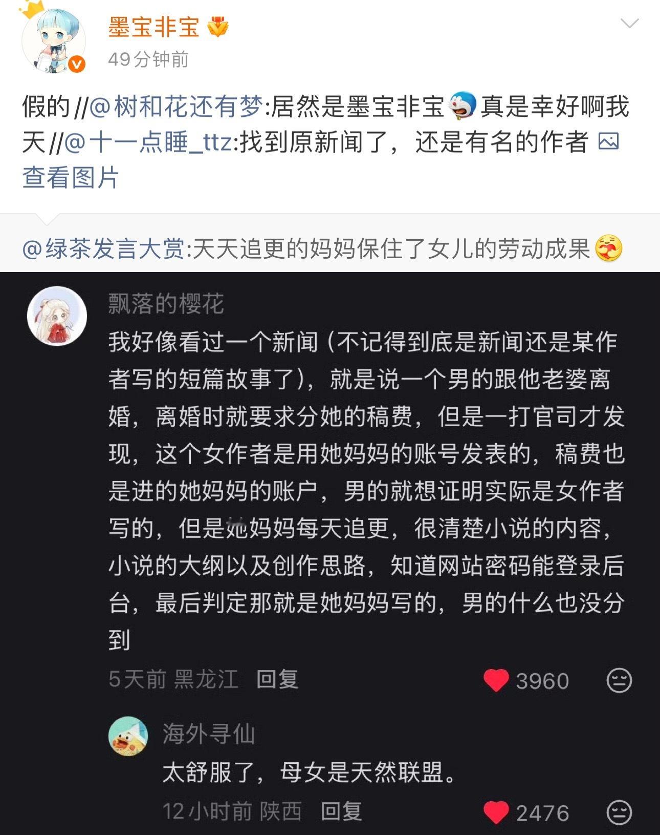 墨宝非宝辟谣“母女联手保住稿费防前夫”传闻,并官宣已在21年已离婚,且男方为过错