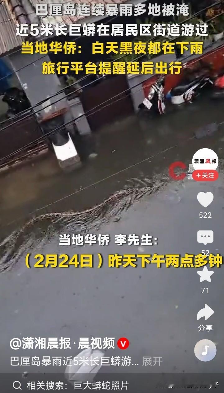 巴厘岛暴雨 近5米长巨蟒游过居民区 巴厘岛暴雨这事儿可太刺激了!居然有近5米长的巨蟒游过居民区。想象一下,暴雨倾盆,一条巨蟒在水里穿梭,这画面简直跟电影似的。在这种极端天气下,巨蟒可能是被洪水逼得离开了原本的栖息地。居民们看到这一幕估计都吓得不轻。巨蟒这么大,要是发起威来可不得了。这也提醒我们,大自然的力量很强大,动物们在极端环境下的行为也会变得难以预测。巴厘岛这暴雨加上巨蟒,真成了一场现实版的冒险剧。不知道当地居民后续怎么应对这“不速之客”呢。