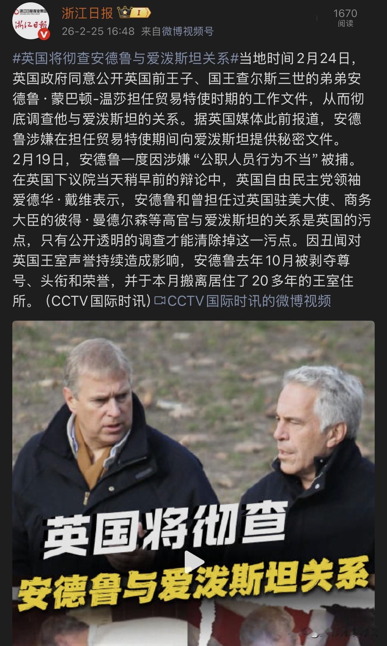 喜大普奔,英国将彻查前王子安德鲁与爱泼斯坦的关系,但愿真的能做到公开透明吧!最近这几个月,英国安德鲁前王子的讨论热度居高不下,从而也让英国王室觉得蒙羞声誉受到了影响,可能也是因此才决定对安德鲁进行彻查吧。在我看来安德鲁和爱泼斯坦的关系恐怕不是简单的上岛去嗨皮那么简单,也可能远不止只是像网上传说的那样做一些丧尽天良的事儿。因为安德鲁王子之前可不只是个没有实权的王子,而是曾担任过贸易特使这样的肥差,要说与爱泼斯坦亦或者和上岛名流之间只是单纯的嗨皮同好,我是打死都不会相信的。所以,我有强烈的直觉,这哥们儿恐怕最后会牵扯到的不只是声誉问题,更可能还有腐败问题!记录我的2026