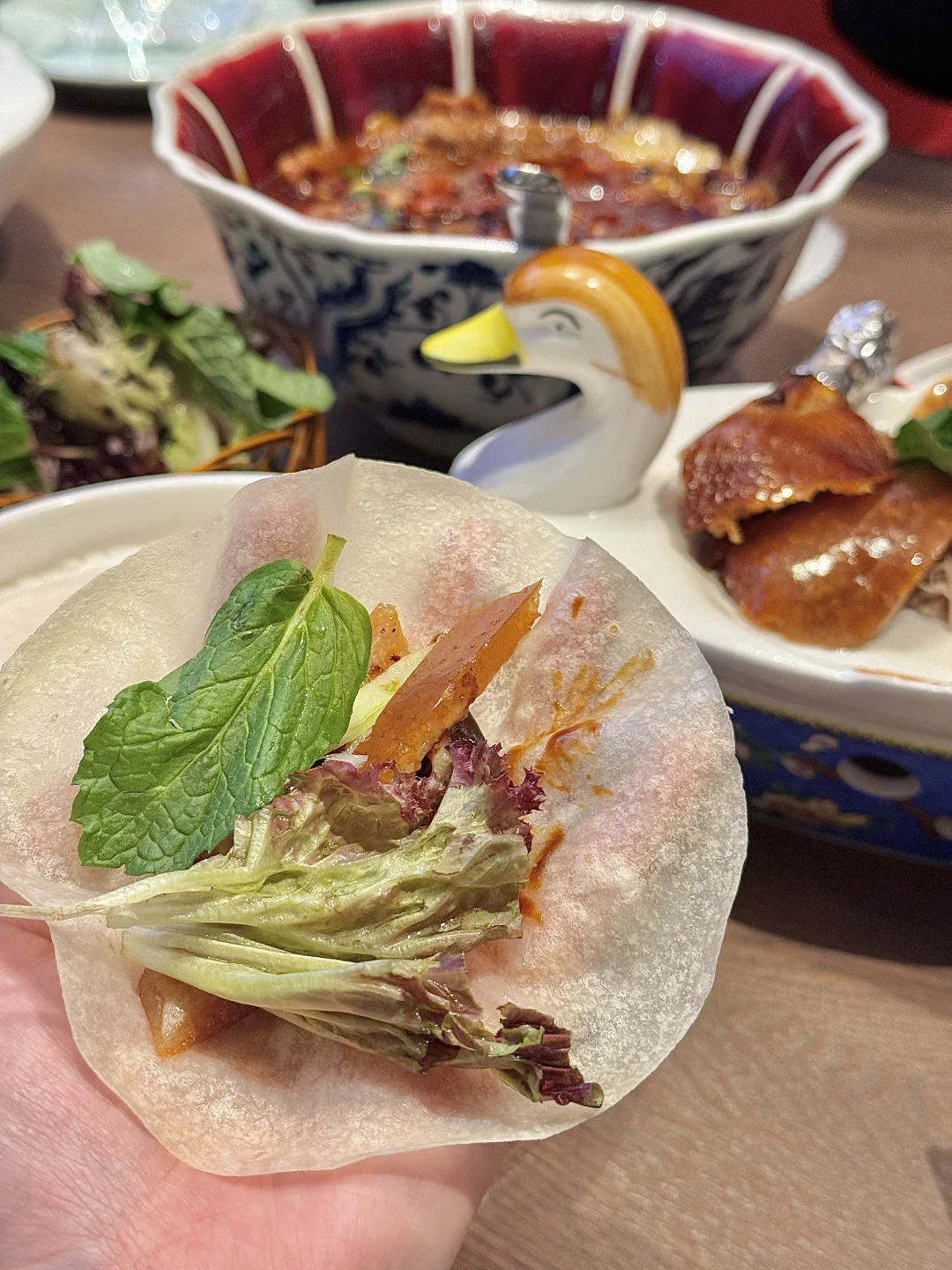 特有甜面酱搭配薄荷叶 入口后有淡淡的薄荷香气