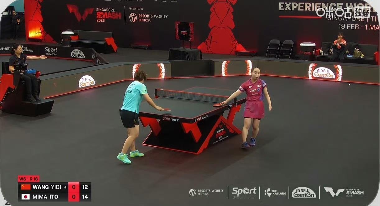 大迪吃发球吃太多了, 第一局王艺迪12-14不敌伊藤美诚🇯🇵! 本来这一局大迪6-2领先的,伊藤美诚手感好的时候真是厉害。 这是一场2026WTT新加坡大满贯男单1/16决赛。 好!第二局王艺迪11-7扳平大比分!场边指导于子洋给力[赞][赞]!
