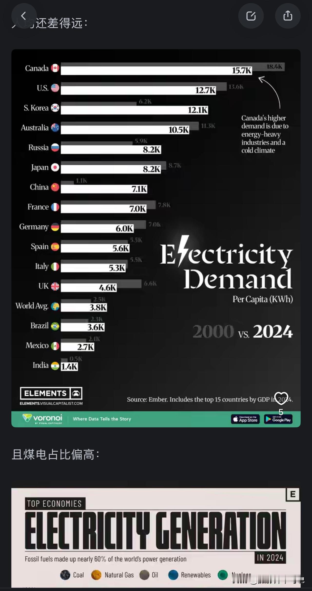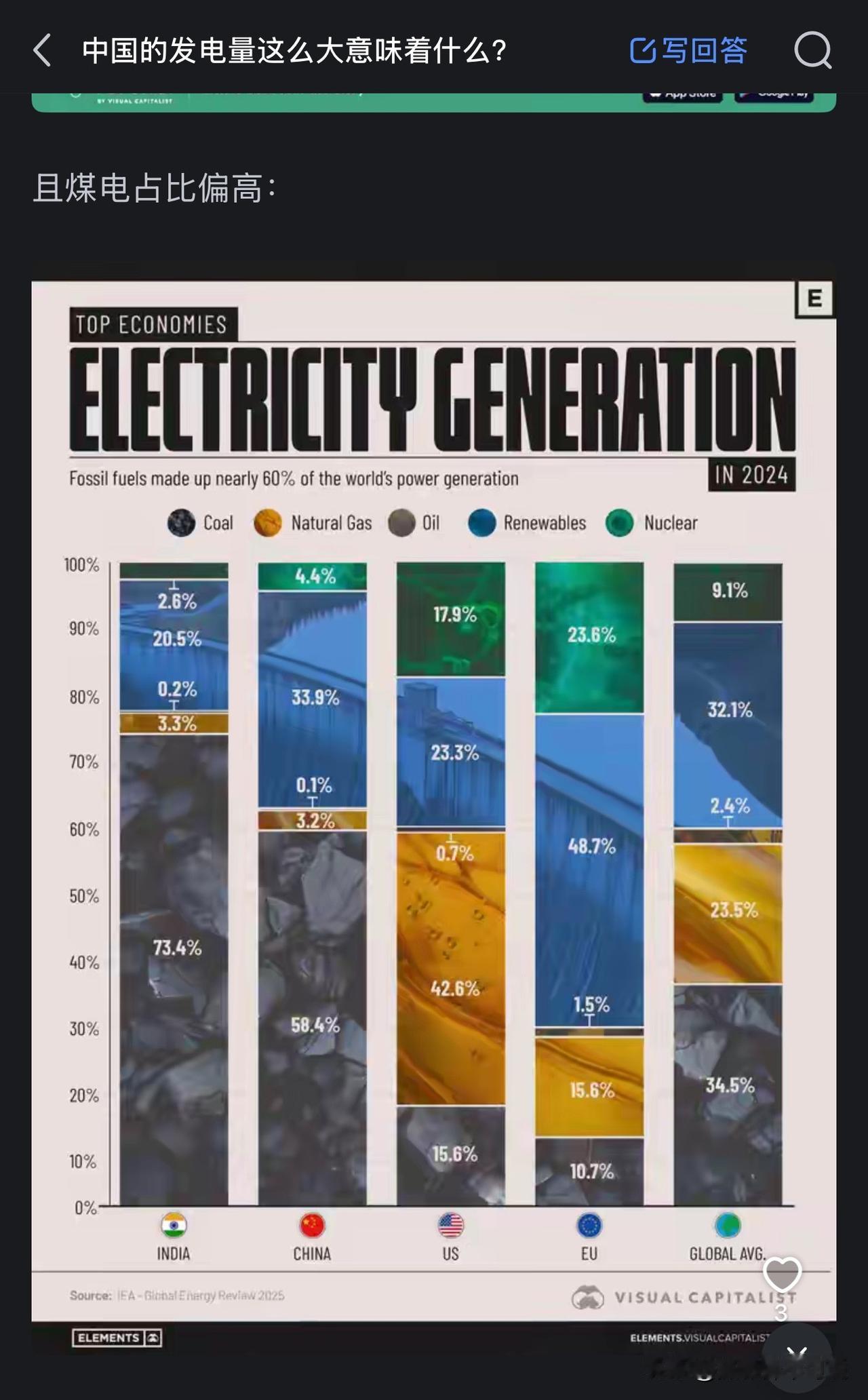 中国发电量这么大意味着什么?在某蓝白APP上一题主就问了这么一个问题。很多人都会扯到人均发电量上去,觉得一人均就没什么了不起的了。其实我觉得这个和人均GDP情况并不一样,有着自己的特殊情况。看发电量够不够用其实不应该看平均,而应该看发电量能否满足每个人的用电需求,以及满足需求后还有没有庞大的余量用于发展。比如在中国只要不是特殊情况,365x24不间断供电不再是什么大问题了吧?用电刚需就是照明,而中国照明自由是实现了的吧。其他的家电、汽车用电属于享受型的,电视、洗衣机这些绝大多数人使用起来没啥心理负担吧。可能唯一有点儿顾虑的就是空调了,但适当咬咬牙还是没问题。举个例子,假如我国发电量为10个单位,其中两个单位用于人们生活需求。那么剩余的8个单位就可以用于工业、城市、算量等等发展用途。而美国发电量5个单位,其中1个单位用于满足人们日常生活,其余4单位用于发展。8个对4个,谁的能源更有优势不用多说了吧!