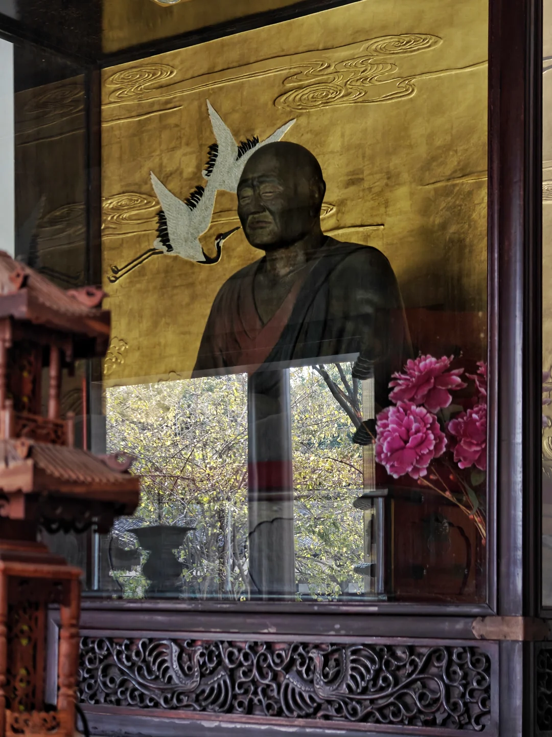 ·堂内有鉴真像,仿鉴真圆寂前塑造的干漆夹紵像制作而成;坐像前铜香炉为日本天皇所赠