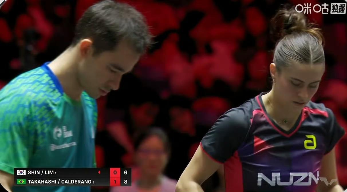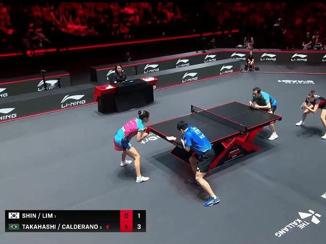 混双决赛! 谁成想,夫妻档杀疯了[吃瓜群众], 第一局雨果/高桥·布鲁娜🇧🇷11-7先胜林钟勋/申裕斌🇰🇷 , 果子哥这球太重太快了,感觉韩林都没反应过来,球就飞走了[捂脸]。 韩林和小申还分别被裁判罚了一分,都挑战了,也全都失败了[捂脸]。 这是2026WTT新加坡大满贯混双决赛。 咦?这第二局雨果/高桥·布鲁娜🇧🇷11-6又赢了。 冠军大概率是雨果两口子了,评论区一起见证哦[吃瓜群众][吃瓜群众]。 (补记:夫妻档🇧🇷3-0胜,11-7,11-6,13-11)