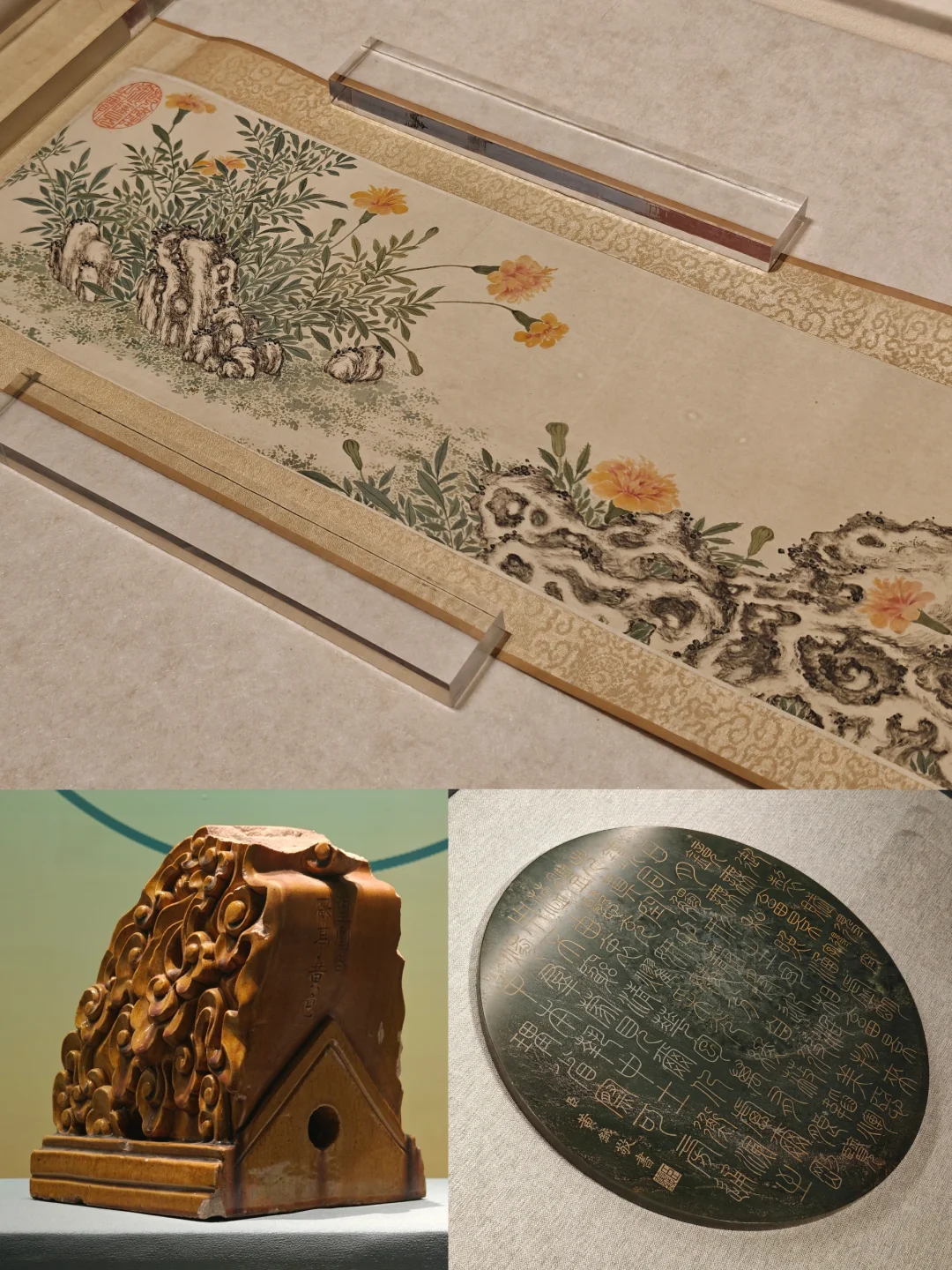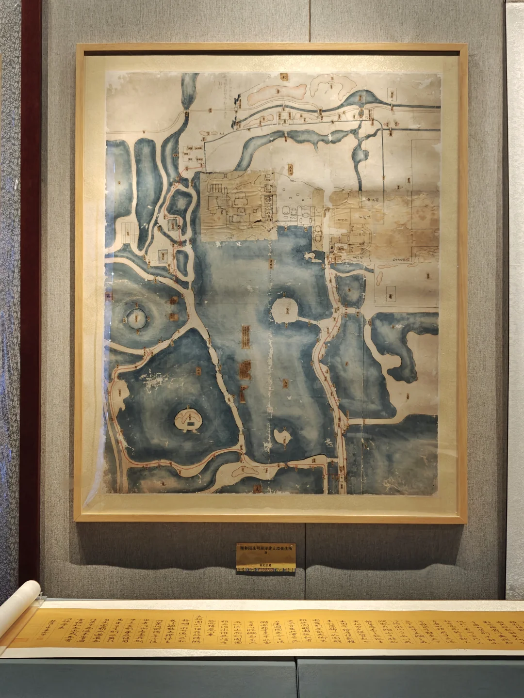 🏺展中的图纸类文物(大多为复制品)展现了清漪园的建造规划,包括“一池三山”、名胜写仿等。也有建筑构件如宝云阁铜窗芯、清蓝地粉彩缠枝花纹瓷方砖等体现园中建筑的高等规制。