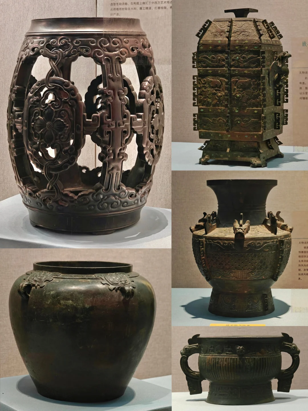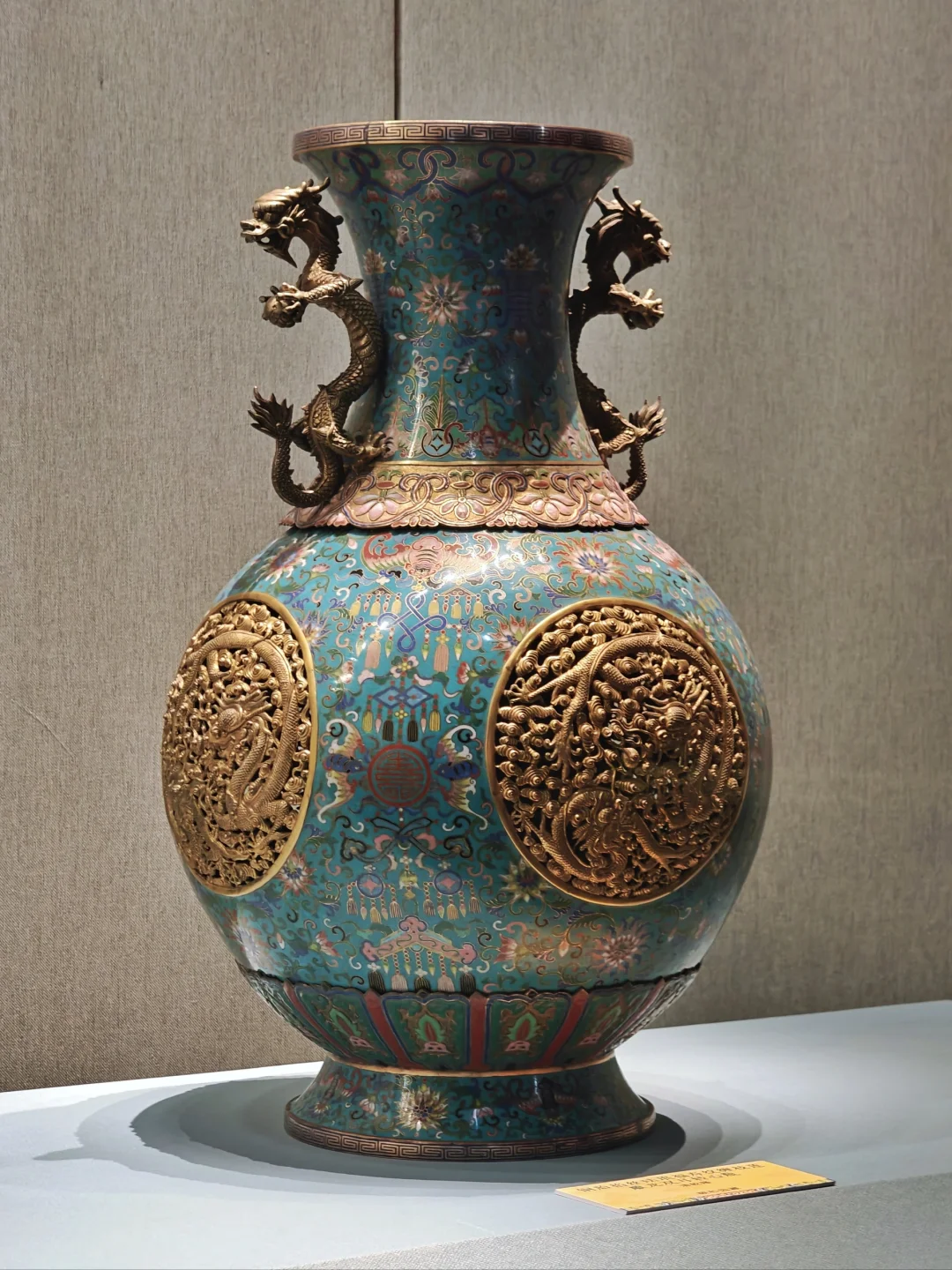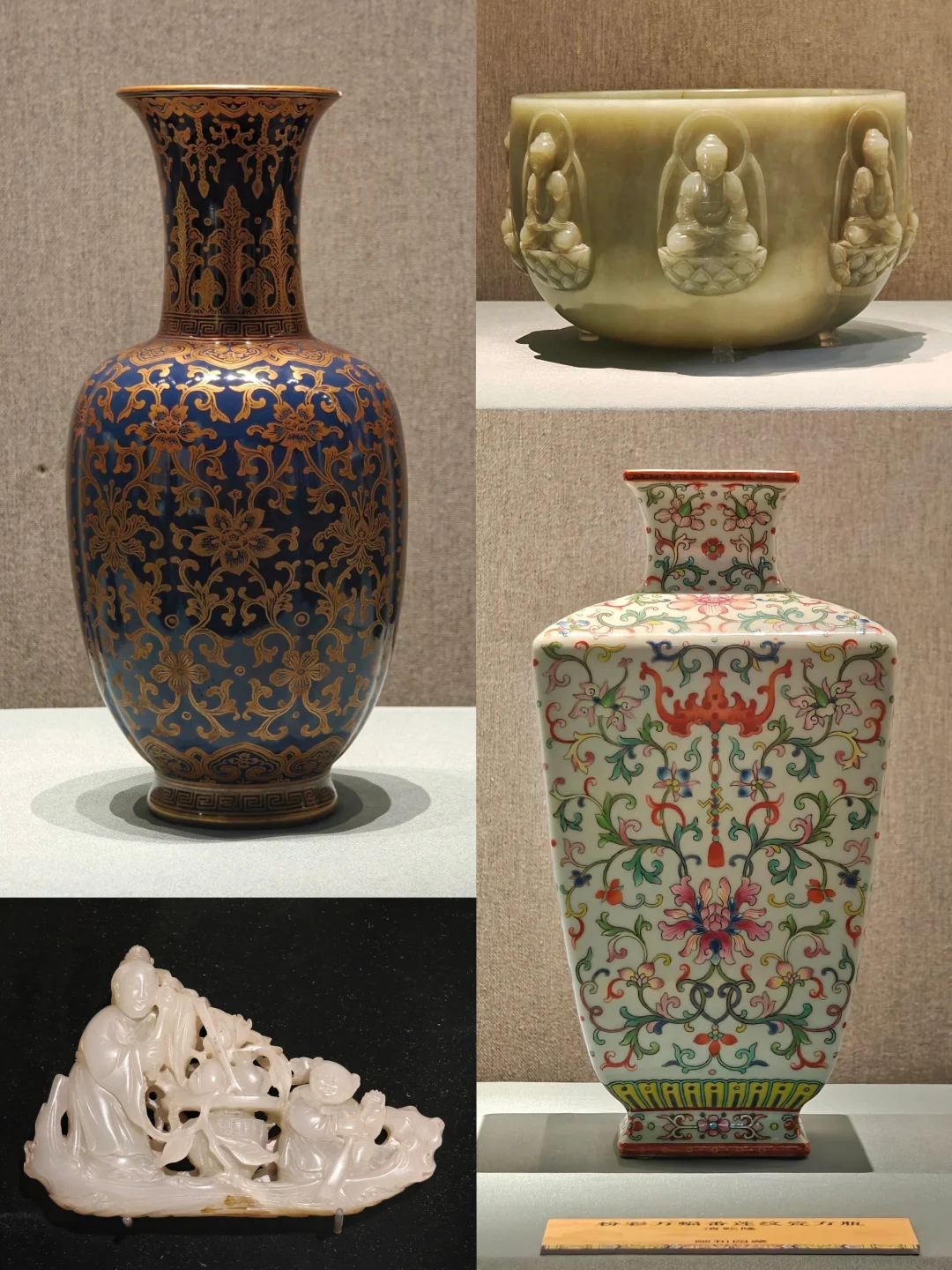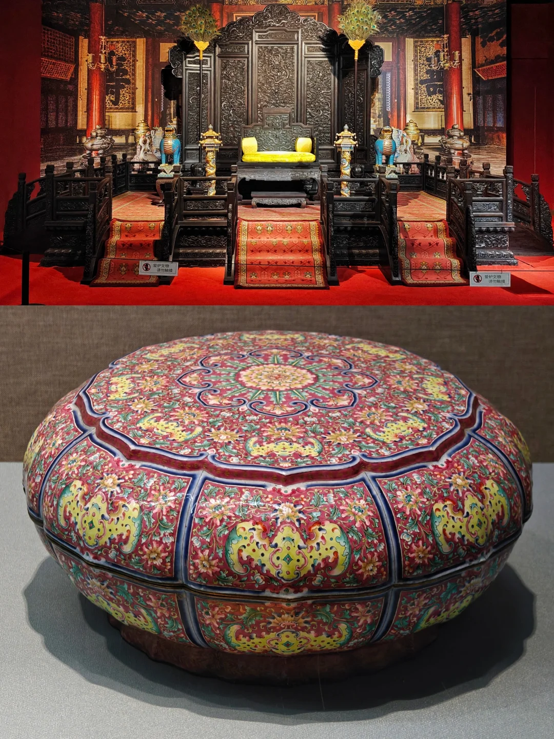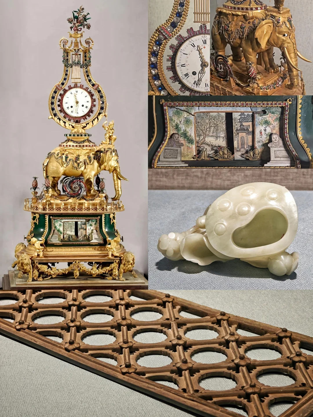 🏺布展亮点是后半部分有一比一还原的乾隆“龙椅”,结尾处还有颐和园连廊的还原。但整体打光很拉胯,简单粗暴的顶光,许多文物根本看不清正面细节。另外玻璃反光,比较大的展品也不太好拍,比如作为重点展品的英国铜镀金水法转花大象钟,这里找了官方图放上。