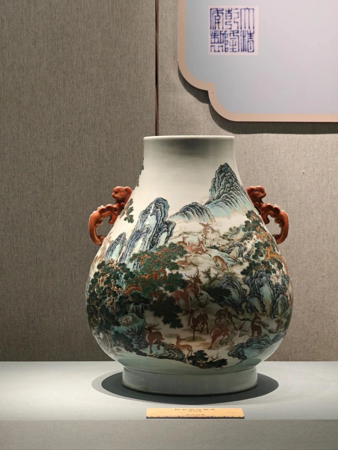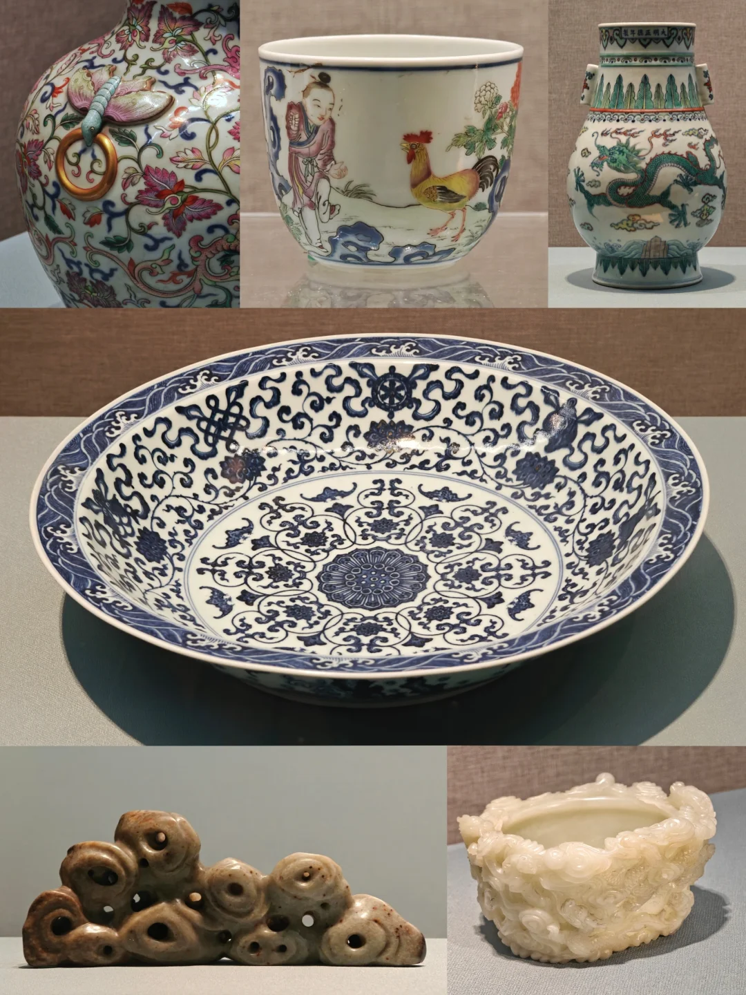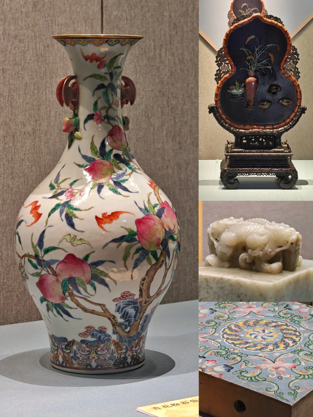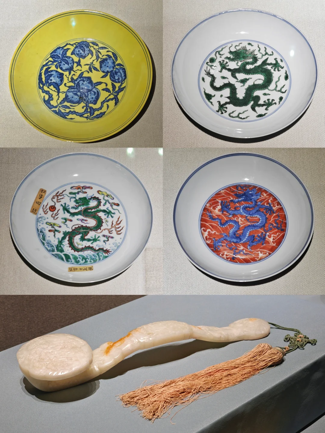 🏺清漪园是清朝皇室散志澄怀的休闲胜地,存放有大量的珍玩和文房用品。本次展出赵秉冲书《御制赋》碧玉板、仿乾隆御题诗粉彩瓷鸡缸杯、粉彩夔凤穿花瓷蝶耳尊、青花抹红龙纹海水磁盘、淡黄地青花九桃瓷盘、粉彩万蝠番莲纹瓷方瓶、碧玉嵌白玉吉祥如意、粉彩瓷白鹿尊、铜胎掐丝珐琅福寿纹缠枝莲雕龙双耳转心瓶、雕荷花白玉水丞、白玉雕松笔筒等。青铜器收藏方面有商代的丙簋、隋至唐四兽耳罐、宋代嵌松石兽面纹鸟耳方彝等。