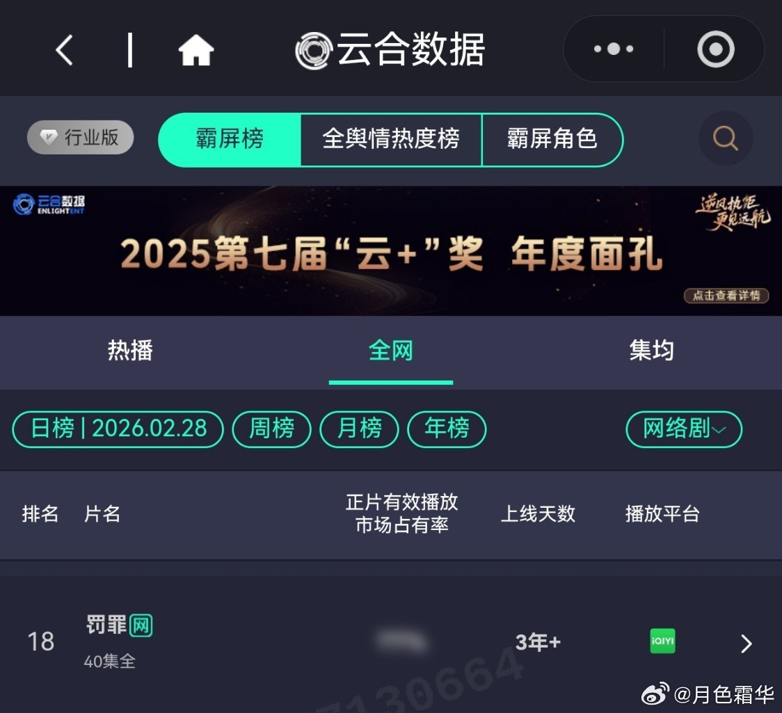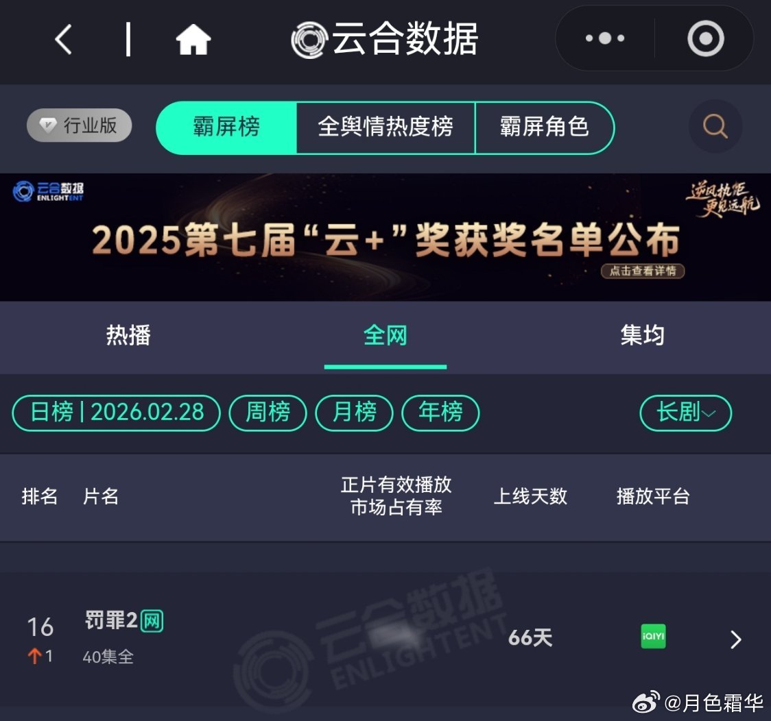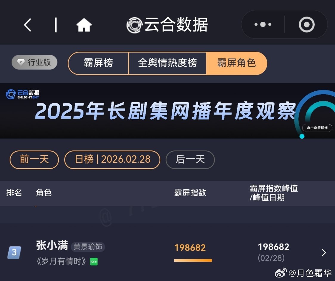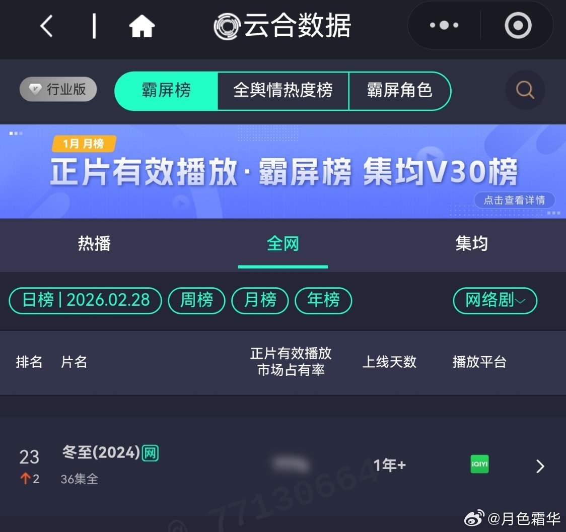2月28日,黄景瑜岁月有情时 开播第9天,云合第4,霸屏榜黄景瑜张小满 第3,酷云全端第2。黄景瑜罚罪2 云合热播期结束第14天,上线第66天,全网第16。黄景瑜秦枫 ,罚罪,网络剧榜第18,冬至第23。