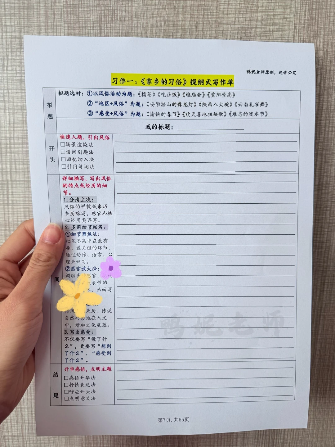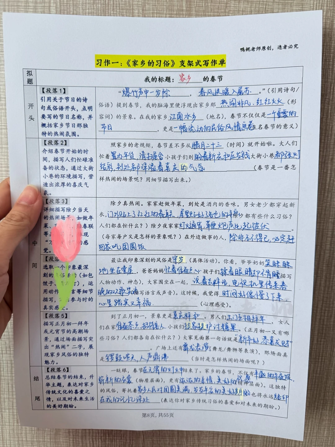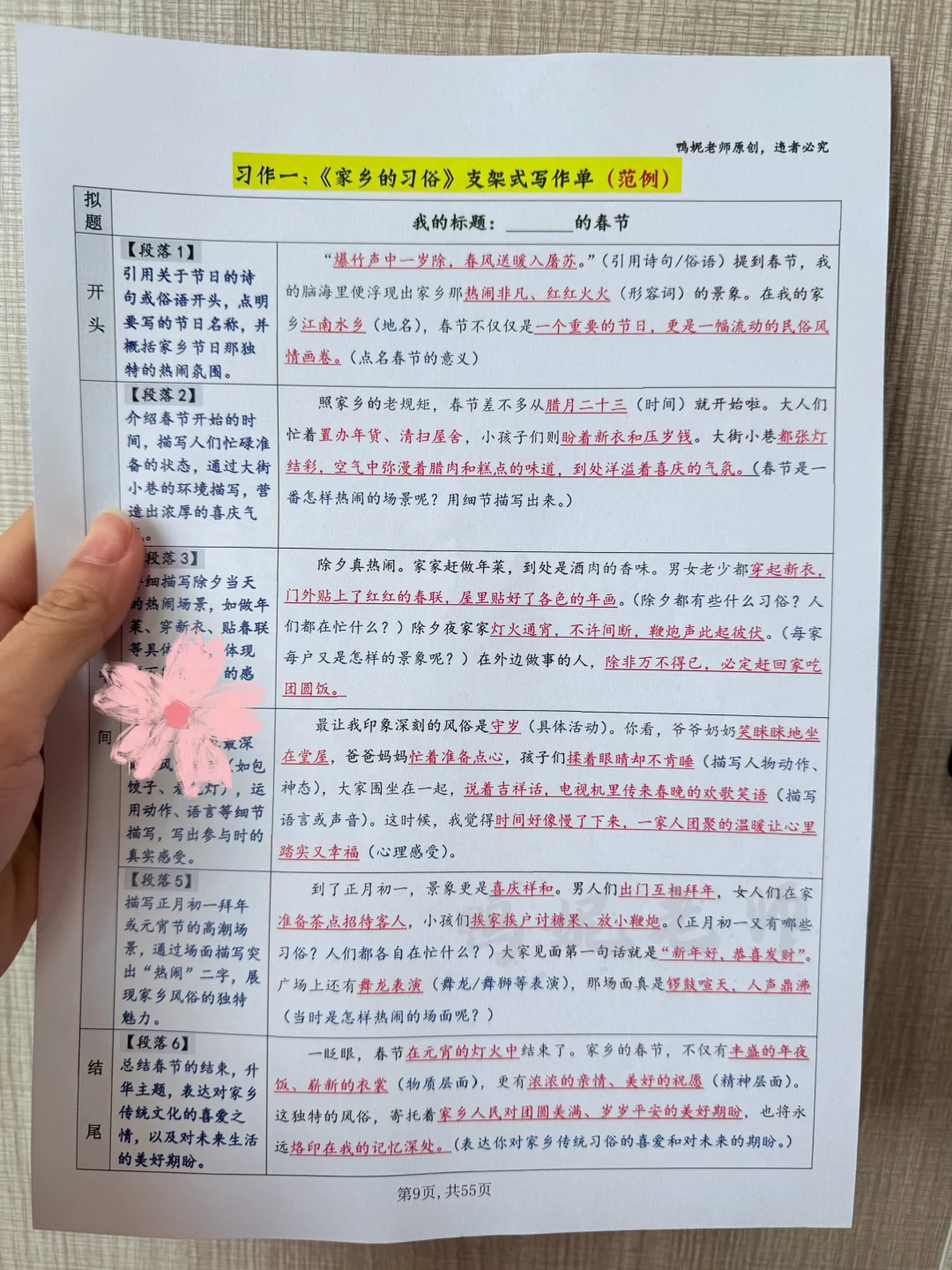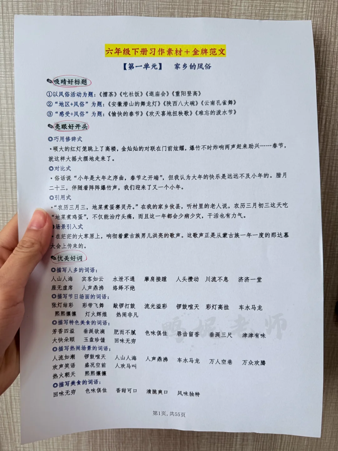开学先把六年级下册每个单元的作文素材积累起来! ①优美词句➕段落仿写➕亮眼开头结尾➕金奖范文 ②原创单元提纲式写作单,帮助学生理清写作框架 ③原创单元支架式写作单,旨在辅导学生逐字逐句写好作文 只要掌握常考六大类作文的大致框架,适当积累好词好句,高分作文不在话下!