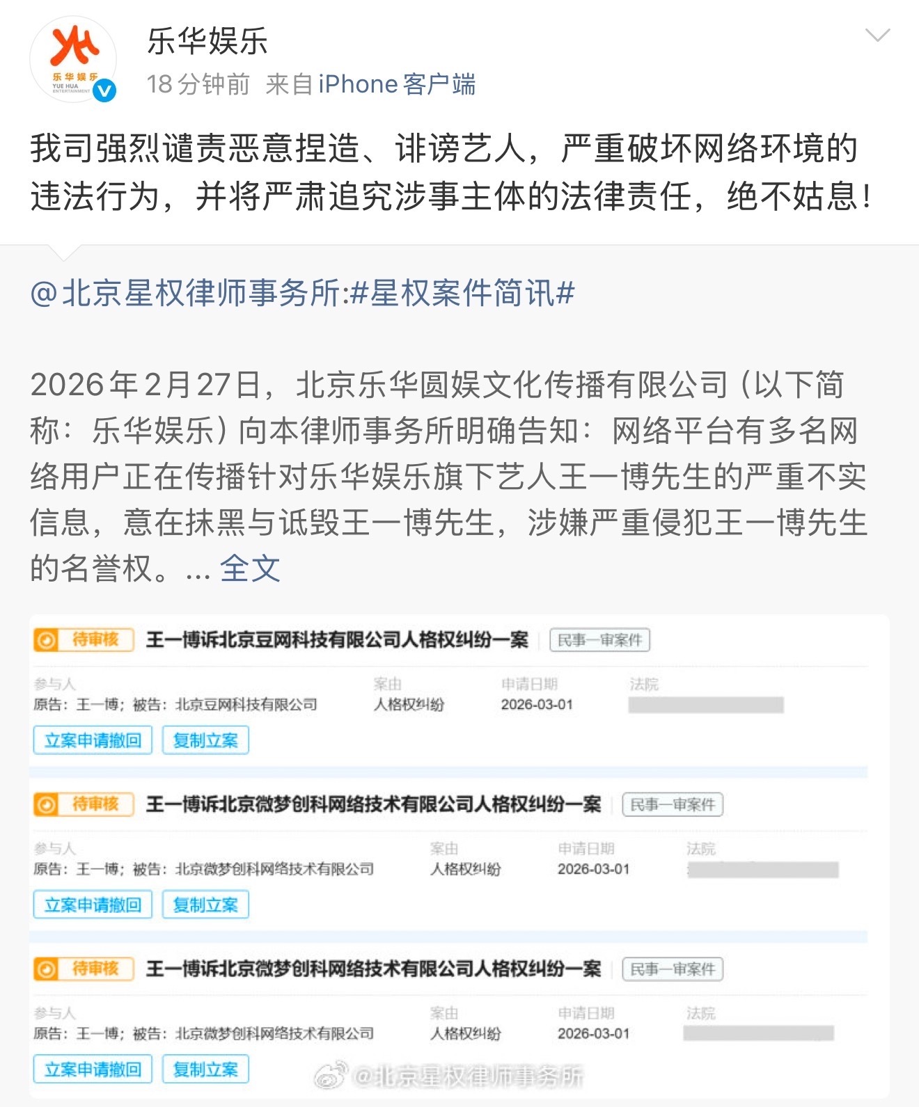 王一博方已委托律师取证起诉。