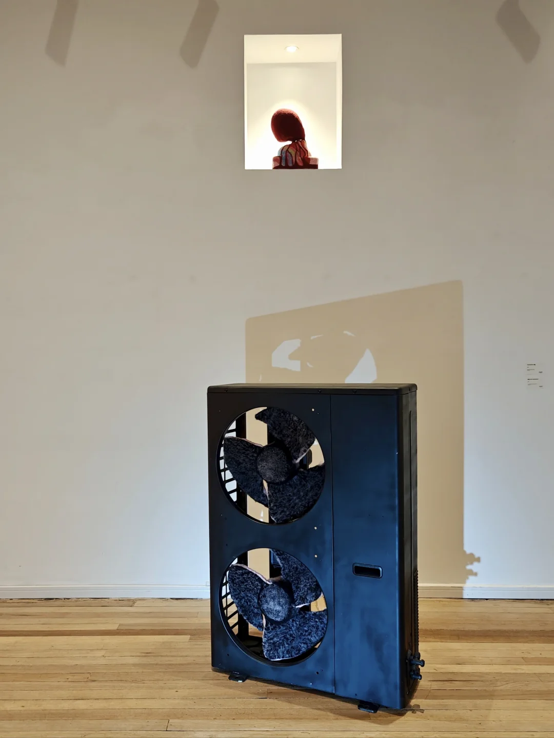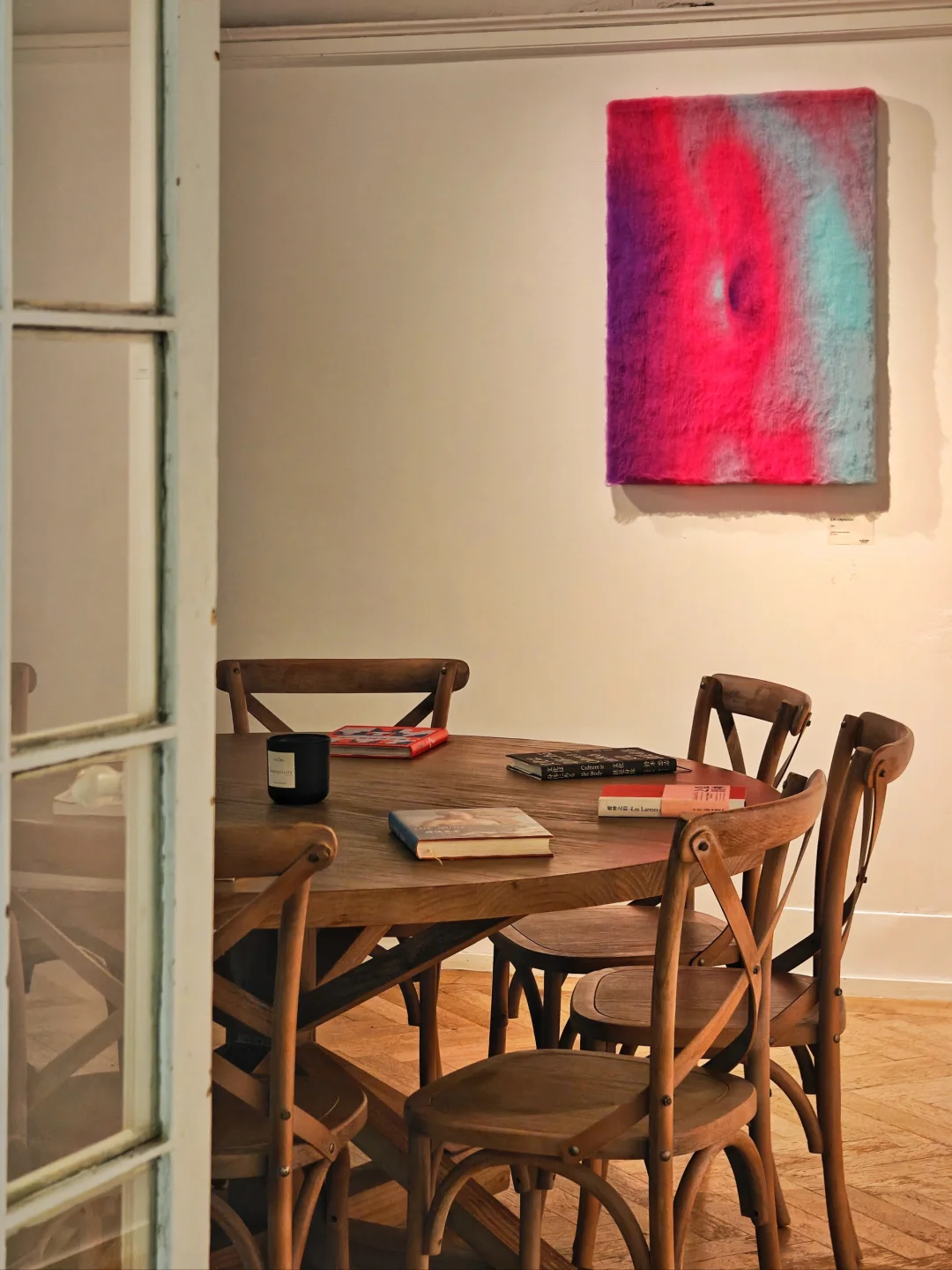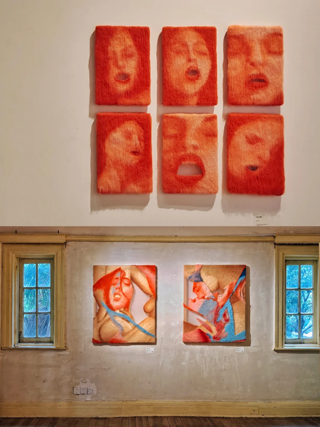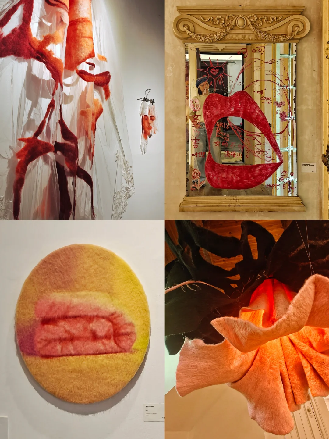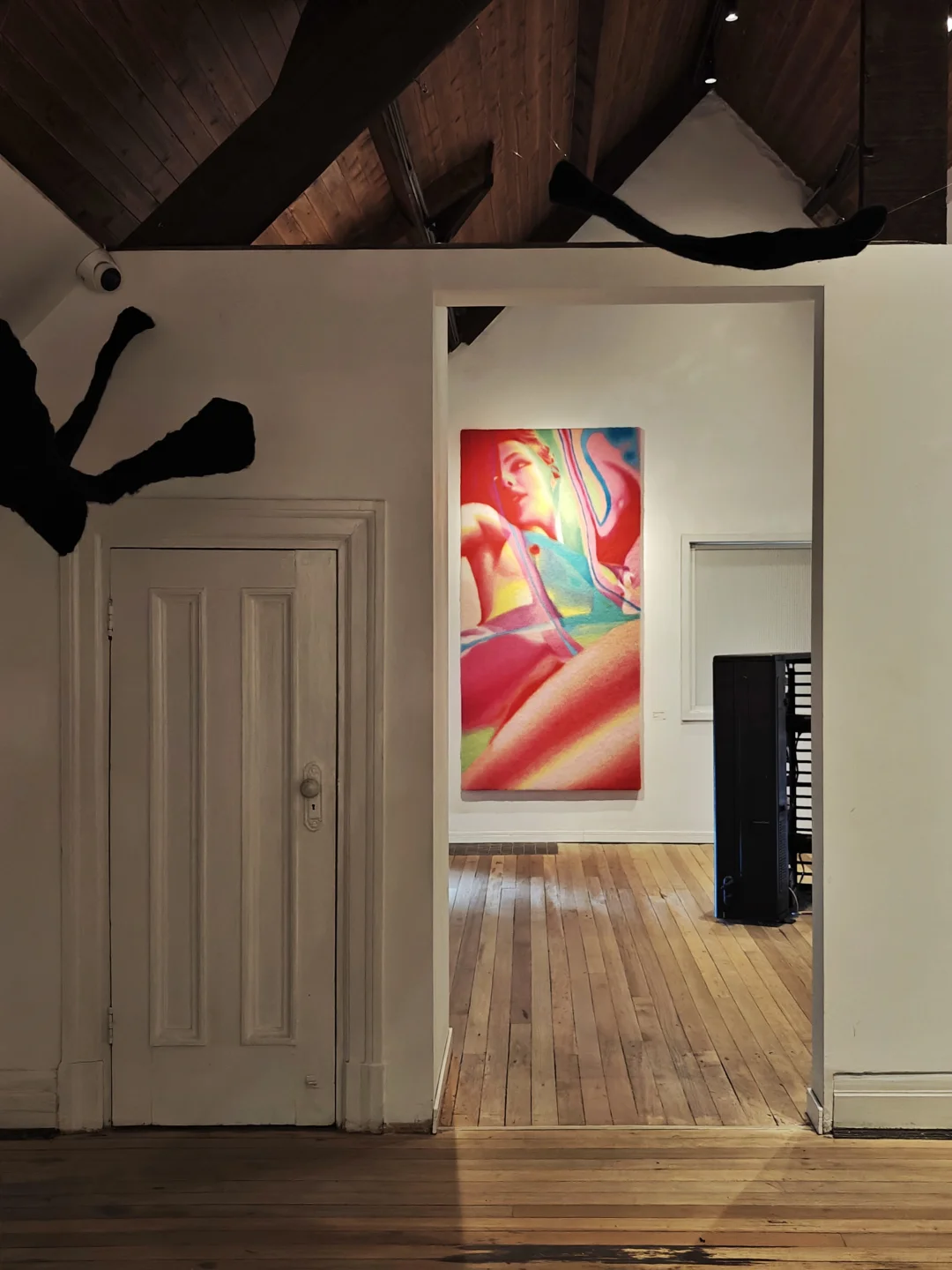 🧶本次展出的“Slamming the door”系列,参考将女性作为欲望客体的影片,把暧昧女性局部抽象化,以数码般鲜明色彩再创造。这些图像本是商业化表演产物,却在算法推动下成审美标准,规训女性陷入二元化、性化规范,逐渐异化失去主体性。她以矛盾并置反思数字媒体对亲密关系与欲望感知的影响。