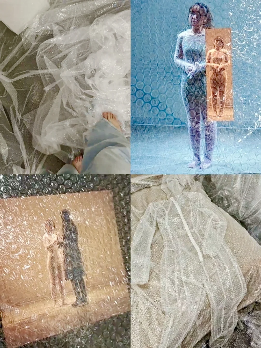 🫧三楼为名为《Hi》的行为录像特别定制的房间,被气泡纸包裹,观众可以脱了👟入内沉浸式体验,房间内的床上也放置了一件“气泡膜”衣,不知道是不是艺术家在行为表演中穿的那件。录像中艺术家穿气泡纸套装与观众互动,这层塑料外衣恰似人际距离——试探靠近间,趣味或伤害仅在一指之间,展现微妙复杂的关系边界。