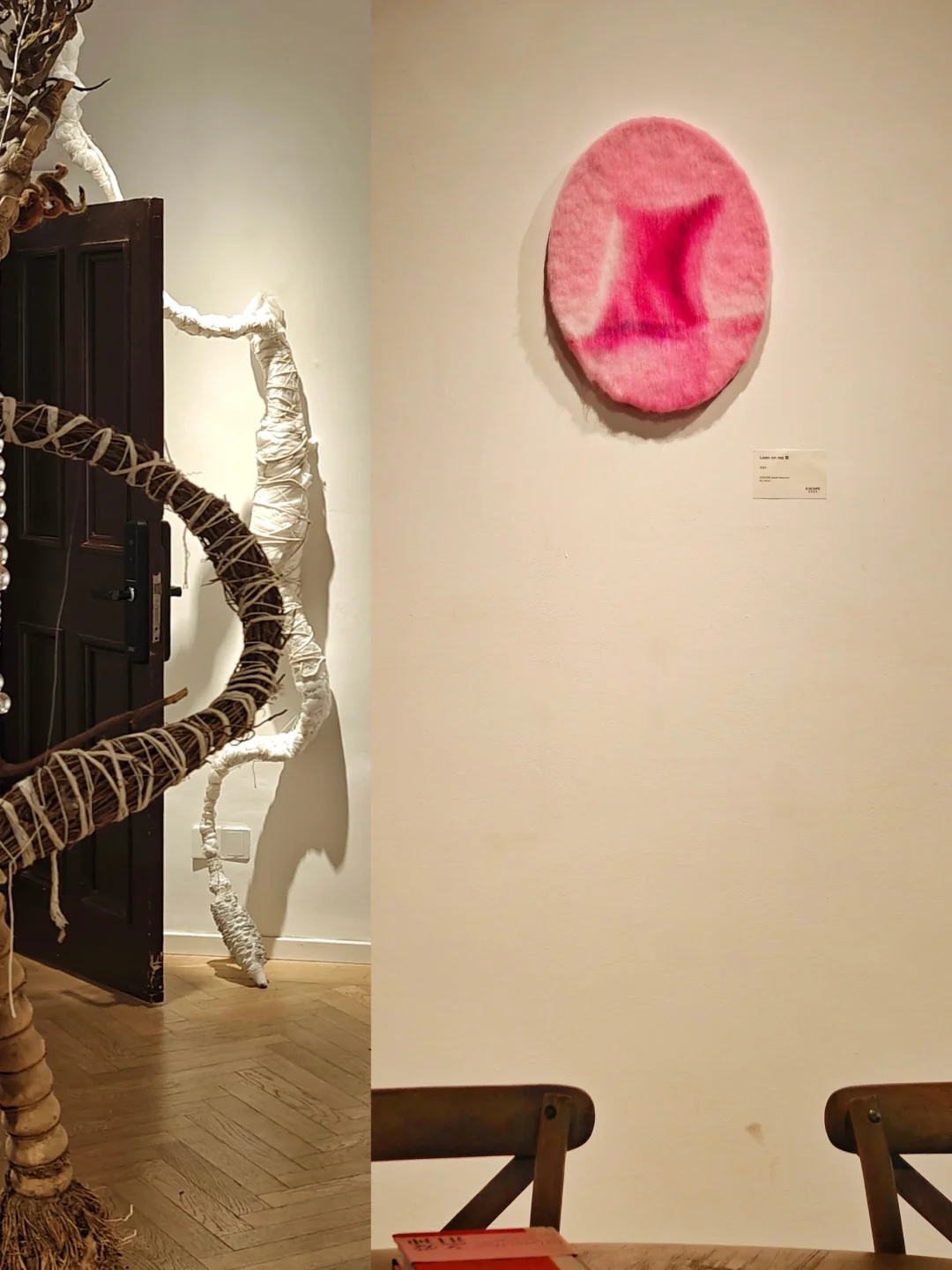 🚽二楼的洗手间也被布置成了一间展室,以艺术方式陈列了这些毛毡作品使用的工具和材料。