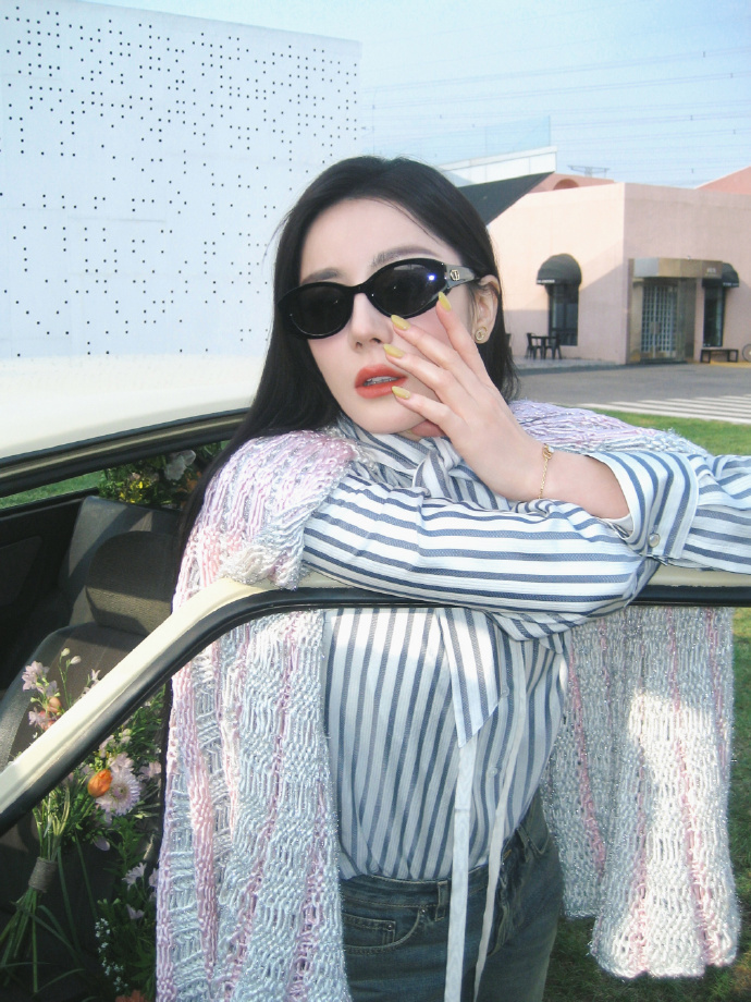 申请坐迪丽热巴的副驾迪丽热巴条纹衬衫针织披肩 迪丽热巴条纹衬衫针织披肩,申请坐迪丽热巴的副驾,女神级别的美貌,被鲜花围绕的酷GIRL~