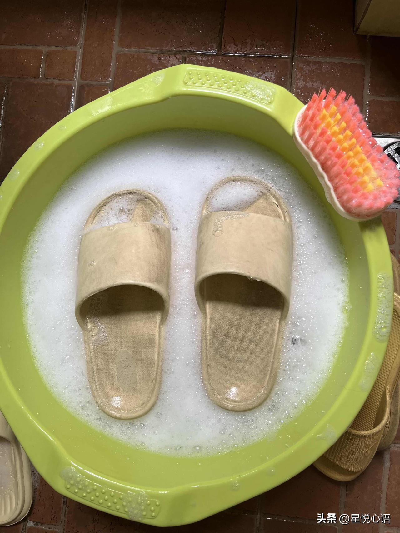 学到了旧居家拖鞋刷干净的方法! 穿久发黄的拖鞋 放了好几年打算扔的旧鞋 居然用厨房随手能拿的东西 就能洗得干干净净 方法真的超简单: 盐+洗洁精+白醋,倒温水泡几分钟 拿刷子一刷,污渍全没了,看着就舒心 提醒大家洗的时候戴手套,保护好手 这个方法适合耐造的eva材质拖鞋,别乱试哦 真的太实用了 还有个方法: “鞋子喷酒清,肥皂泡热水”我还没试 我就说上网真能学到好东西吧!
