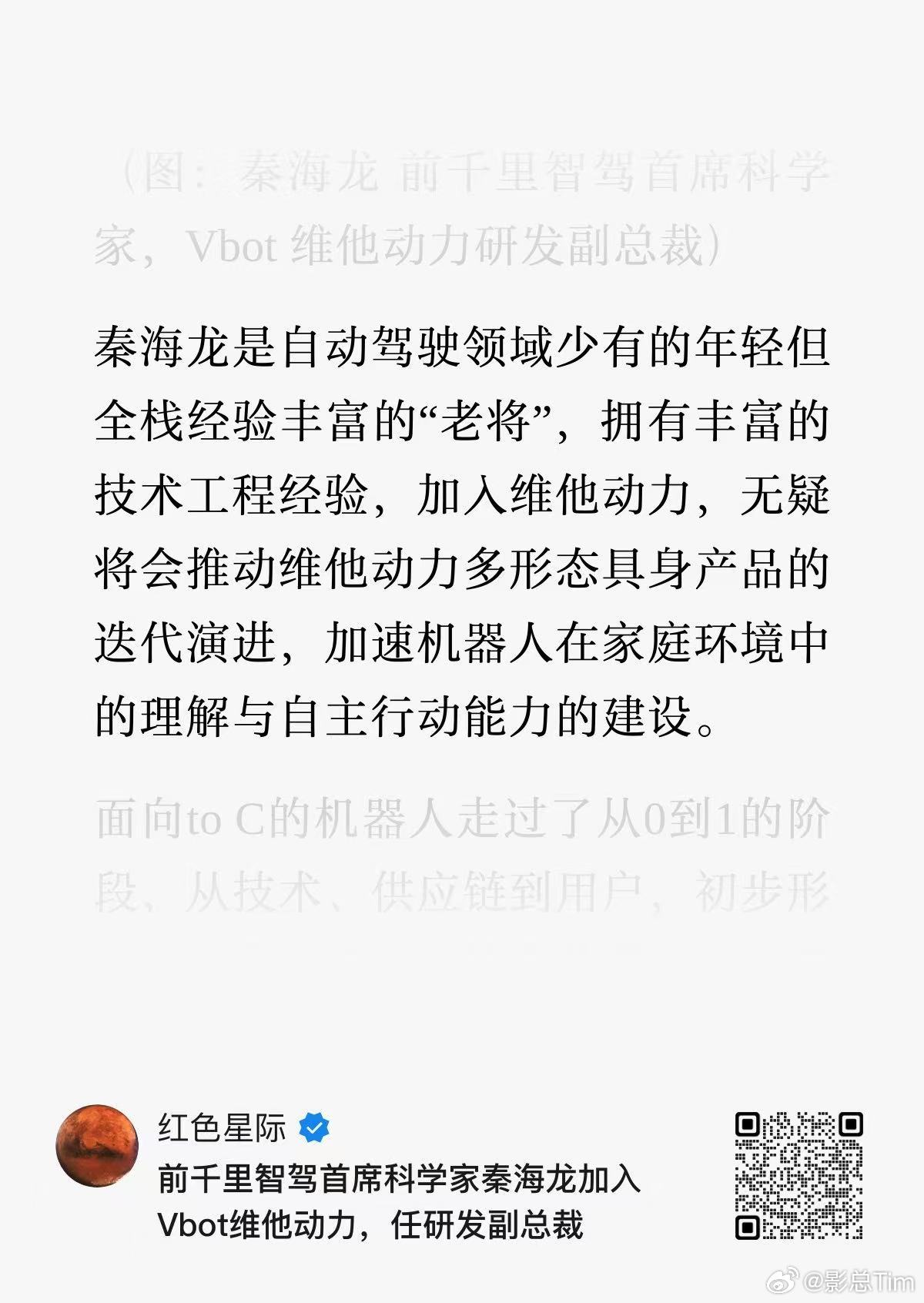 维他动力又得一员猛将,前千里科技首席科学家秦海龙加入维他动力担任研发副总裁,负责世界模型,空间智能,AgentOS,人形机器人!