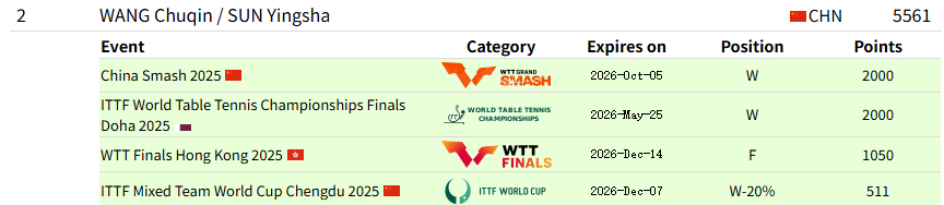 女单世排第一男单世排第一混双世排第二