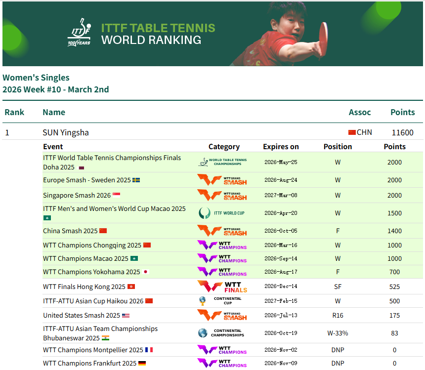 孙颖莎王楚钦莎头 20260302|2026年第10周世界排名更新女单世排第一男