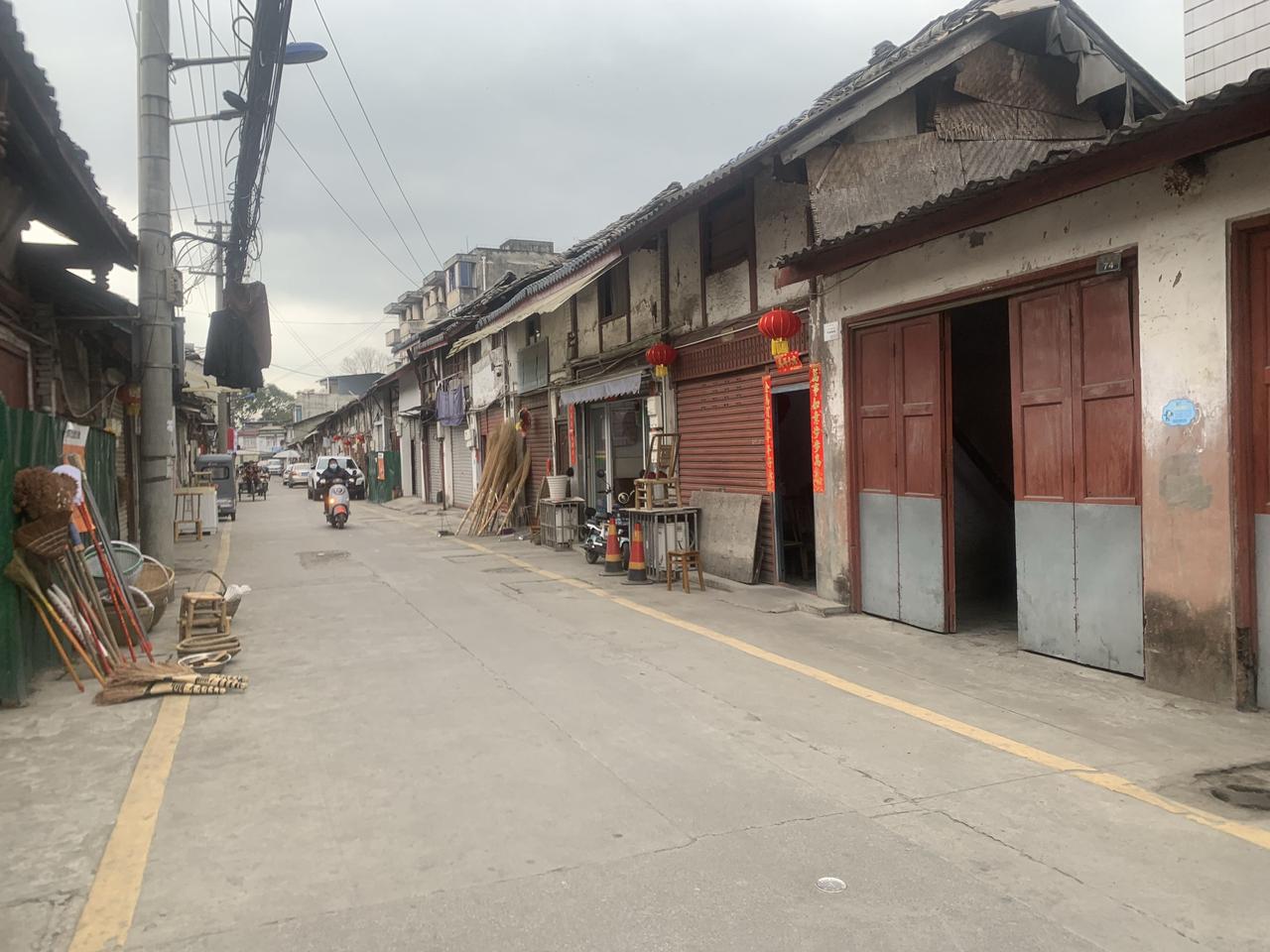 今天上午9点40分就结束早茶,到早不晚的,就干脆到成都新津花桥镇去走一下。从成都星辉中路出发,地铁17号线转9 号线再转10号,共乘了20个地铁站,花时间1小时20分钟,就到花桥站。 据说新津花桥镇始于明清时期“花桥驿”的商贸集散功能的发展和延续成为街道乡镇的。主要街道包括解放街、烟巷子、水巷子、鱼市拐等。 解放街距地铁站仅500米左右,在导航帮助下,很快到了。 解放街大体有300多米长,也有200门牌号,以民国中、晚期川西民居为主,保存完好的进入15%左右,号码越大的房屋损害越大,有的完全是现代的建筑了… 解放街上也有小巷,有点古老、有点阴暗、有点神秘….终于鼓足勇气进入了一条小巷,一阵狗吠吓得赶快撤退。 街上有个老茶馆,门面是老屋,后面是房主的自建房间,感觉有三进院落,我吃了午饭,12:10来到这里,没有一个喝茶的,我要的杯茶¥2元,一点左右,打麻将的茶客骑着电瓶车,风尘仆仆的赶来了,老茶房立即充满了生机,一位茶客告诉我附近有几座庙,有的寺庙是我在百度地图没有找到的,我不知道为什么。 下次早点来赶场,顺便到寺庙去看一看。