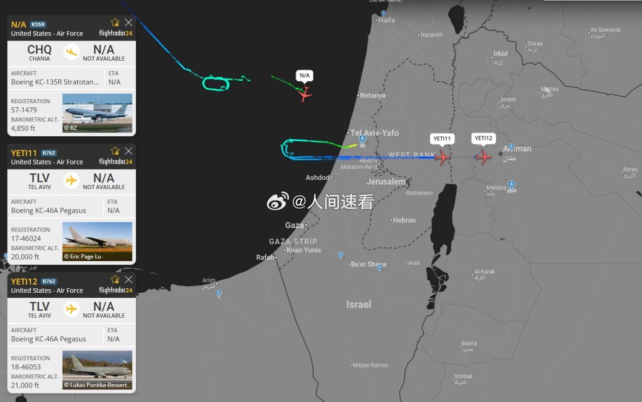 -多架使用呼号“YETI”的 KC-46A 和 KC-135R 加油机从以色列的本-古里安机场和干尼亚起飞,为攻击伊朗的持续行动提供支持。