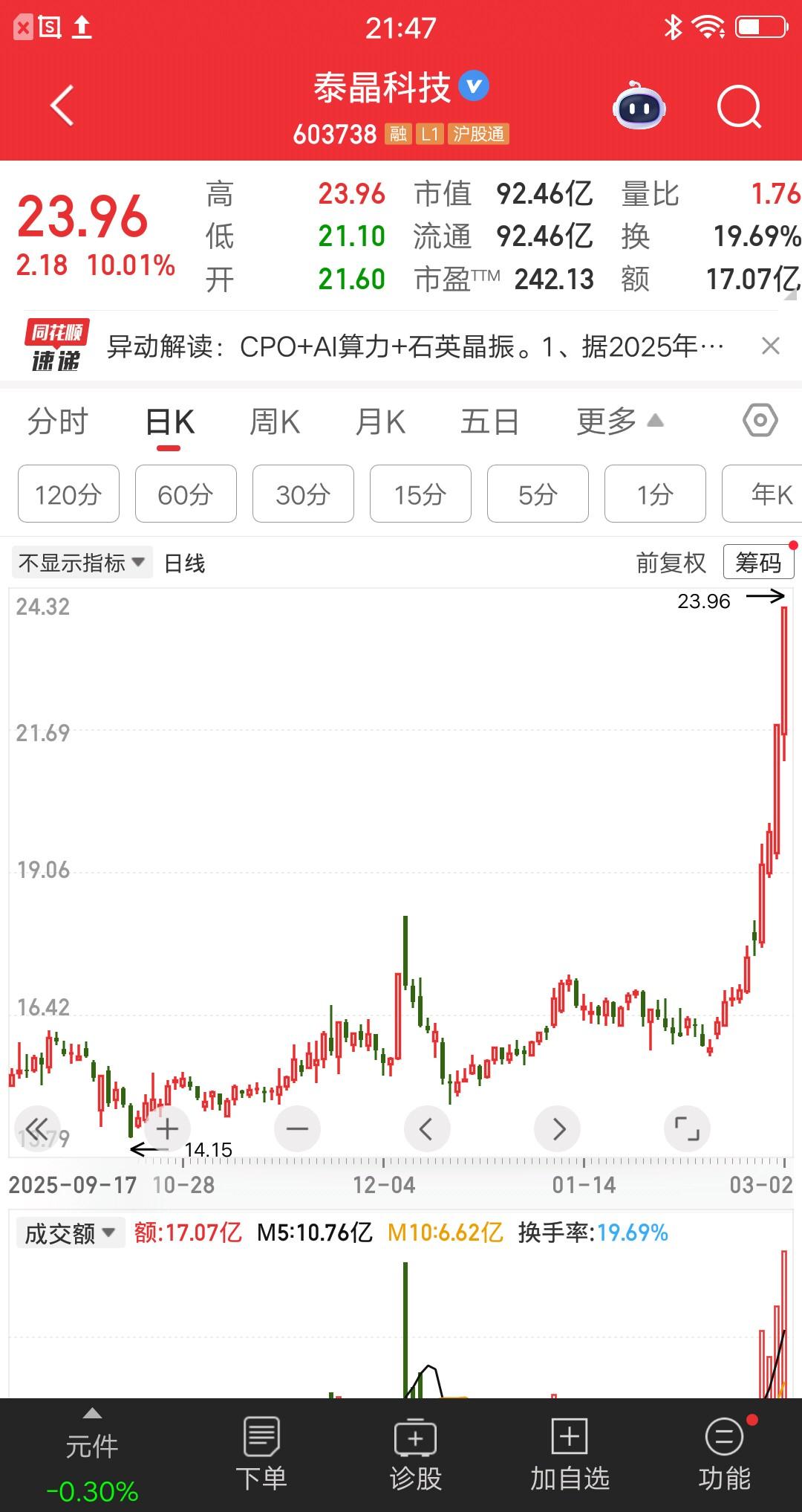 泰晶科技发布公告:公司主营业务为石英晶体谐振器、振荡器,可应用于人形机器人、光模块,但业务收入占比极少。 这里透漏了一个重要信息,已经有了收入,那么客户是谁呢? 人形机器人领域 - 特斯拉 Optimus:供应3225系列、高频晶振,用于AI单元、电机驱动与传感器融合。 - 宇树科技:官方确认供货H1、G1人形机器人,用于控制系统与关节精准同步。 - 松延动力:2026年春晚《武BOT》机器人独家国产高端晶振主供。 - 智元、银河通用等头部企业:配套人形机器人主控与传感器晶振。 光模块领域,并没有查到具体合作客户,不过行业分析指出,可能是中际旭创,新易盛,光迅科技等,间接配套英伟达。 泰晶科技最近股价挺牛,十个交易日涨幅50%,已经两连板了。公司按照规则,披露主营业务情况,客观真实不蹭概念,是对二级市场负责的表现。