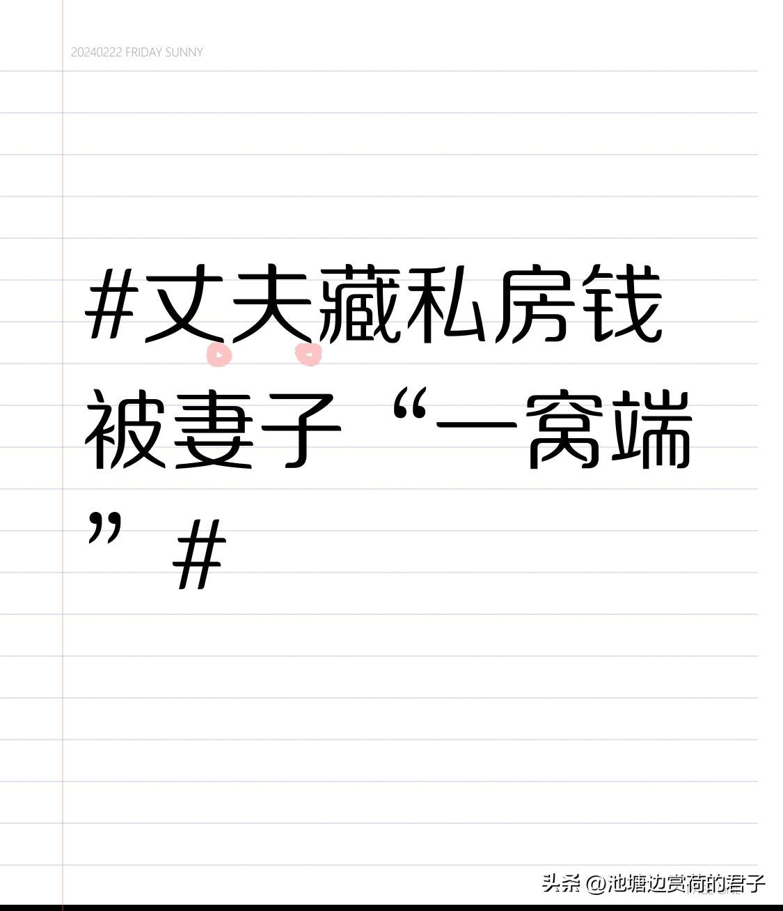 丈夫藏私房钱被妻子“一窝端” 2024年3月12日,杭州余杭的王敏在厨房糖袋底发现丈夫藏的1700元私房钱。过去12年,她还在旧字典夹层、儿子作文本扉页等9处发现过丈夫藏的钱。而辽宁大连一位妻子打扫时,在踢脚线和花盆下“一窝端”了丈夫1000元私房钱,还看到表白纸条。 很多人觉得藏私房钱是男人不忠,可大连这丈夫每月仅200元零花钱,这1000元是他抠出来的“安全感”。私房钱是亲密关系的“安全垫”,代表为自己做事的底气。持家不是把丈夫钱包管死,而应是信任与尊重的“共治”